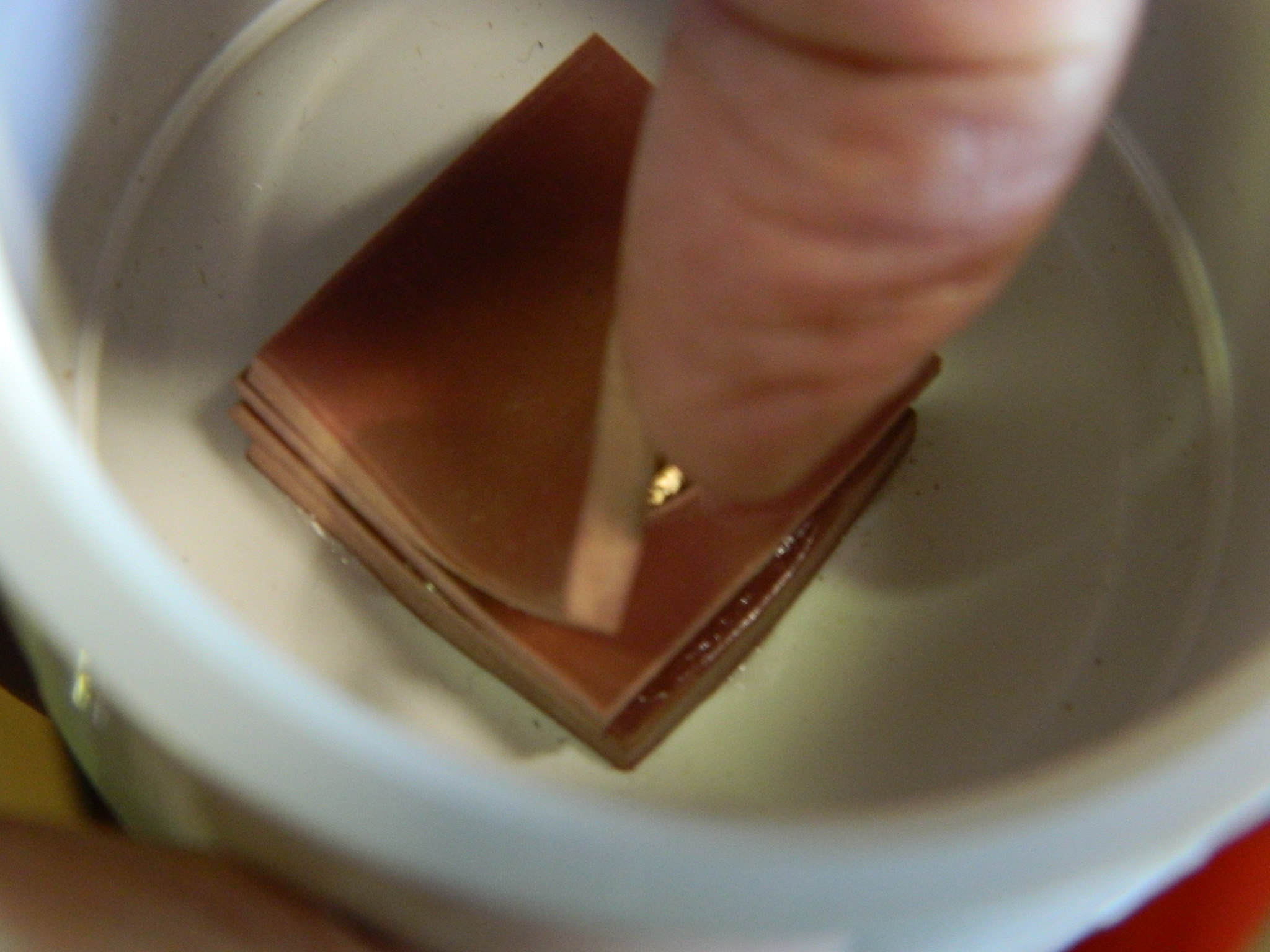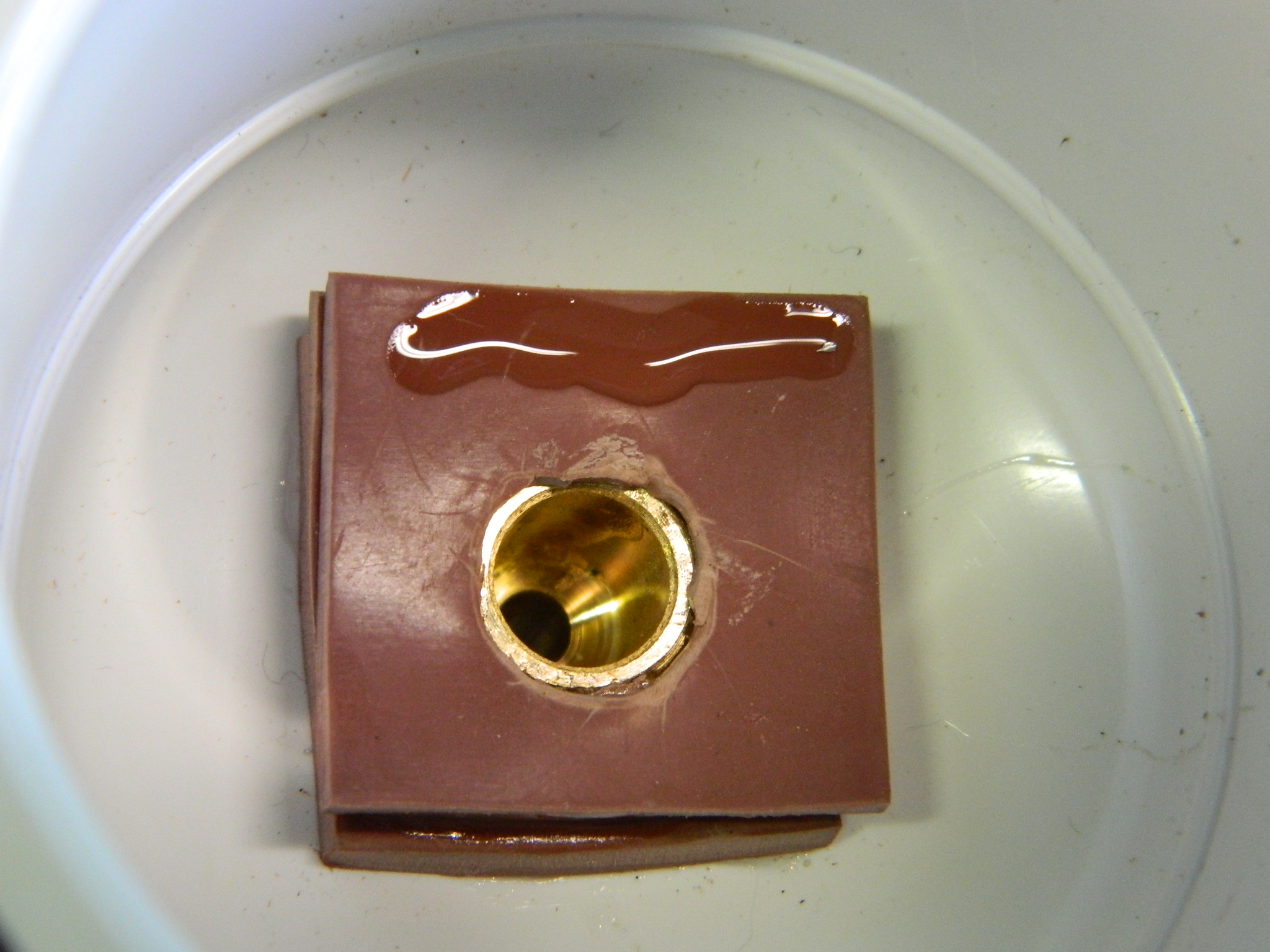 I made a flap valve using a few pieces of 1″x1″ 1/8″ rubber sheet by drilling out the centers. I used enough pieces so that the end of the brass fitting sits below the stack of rubber. Then I glued a 1″x1″ piece of 1/16″ rubber along one side only. This is the valve that closes under positive pressure to void the air pulled from the vacuum chamber to the outside:
