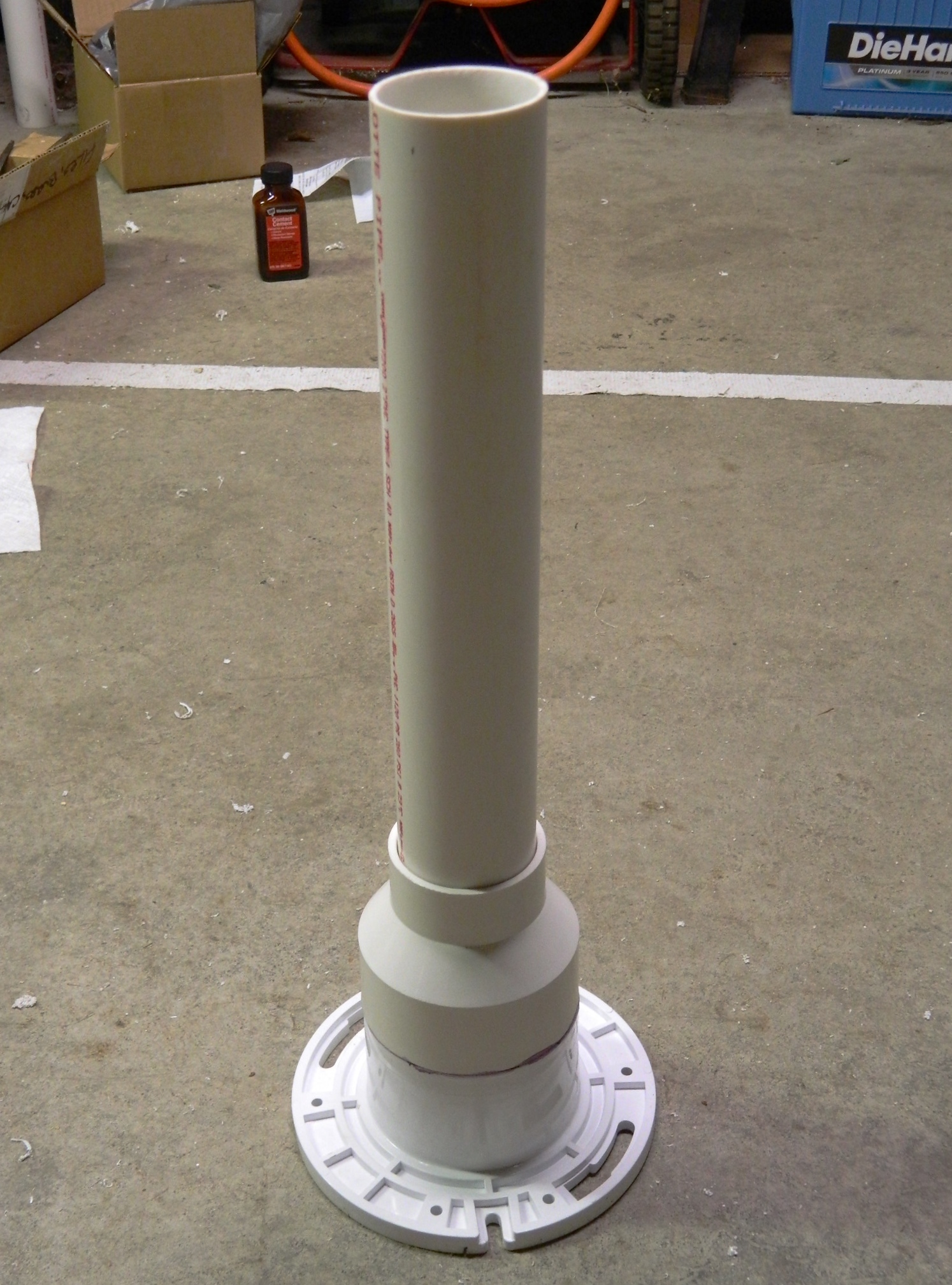 With the reversed piece in place, the 3″ pipe gets glued into the floor flange. Let this sit for at least an hour (I let it sit for two) so that the parts bond solidly. You’re going to be standing on this and yanking upward firmly and often:
