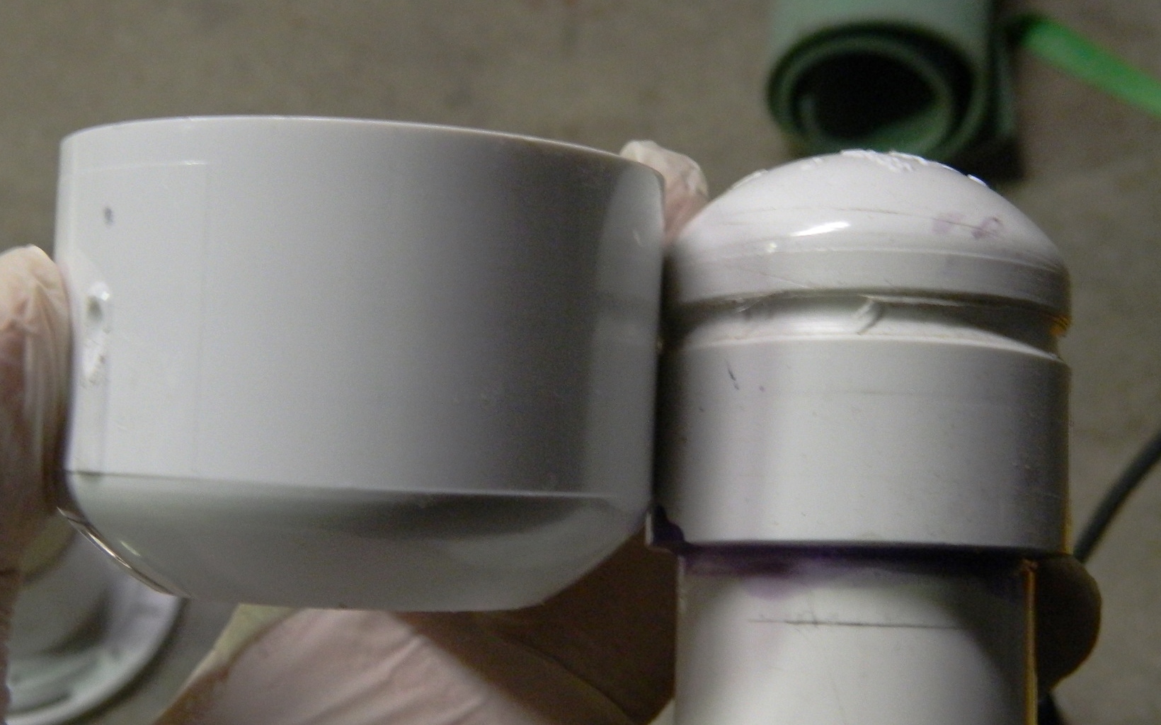 Reducers have a lip molded inside to keep the smaller pipe from slipping through the reducer. Since you’ll want the smaller pipe to slip through the reducer, that lip needs to be ground away. (If you have a Dremel or the like, that cuts down on the time this step takes.) Once you have that lip gone, you’ll need to open the inside diameter of the 2″ area of the reducer so that the body of the pump, a 2″ pipe, will slide through there. You want this to be snug but not immovable: