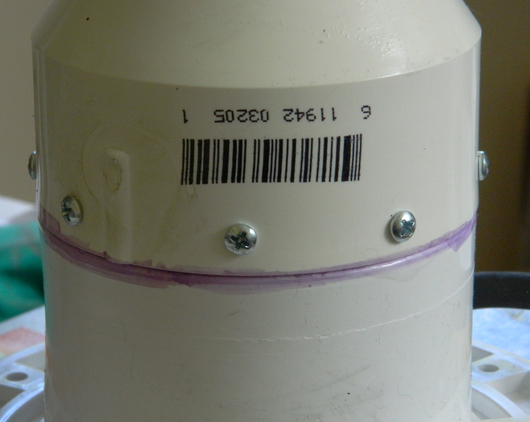 During the construction of the pump, I wasn’t entirely sure that the 3″ section of pipe that connected the flange to the reducer had bonded properly and it turned on it hadn’t. Though the 3″ section bonded very well to the flange, only half of it bonded to the reducer and that snapped free. It doesn’t affect the pump’s ability to create suction, but it does compromise its strength. So I used screws to attach the loose section of pipe to the reducer: