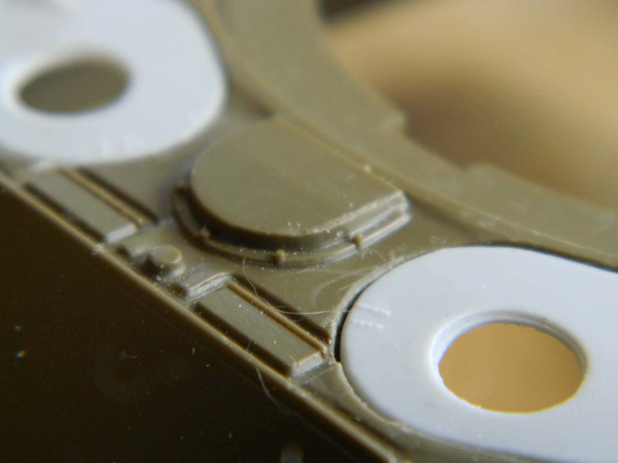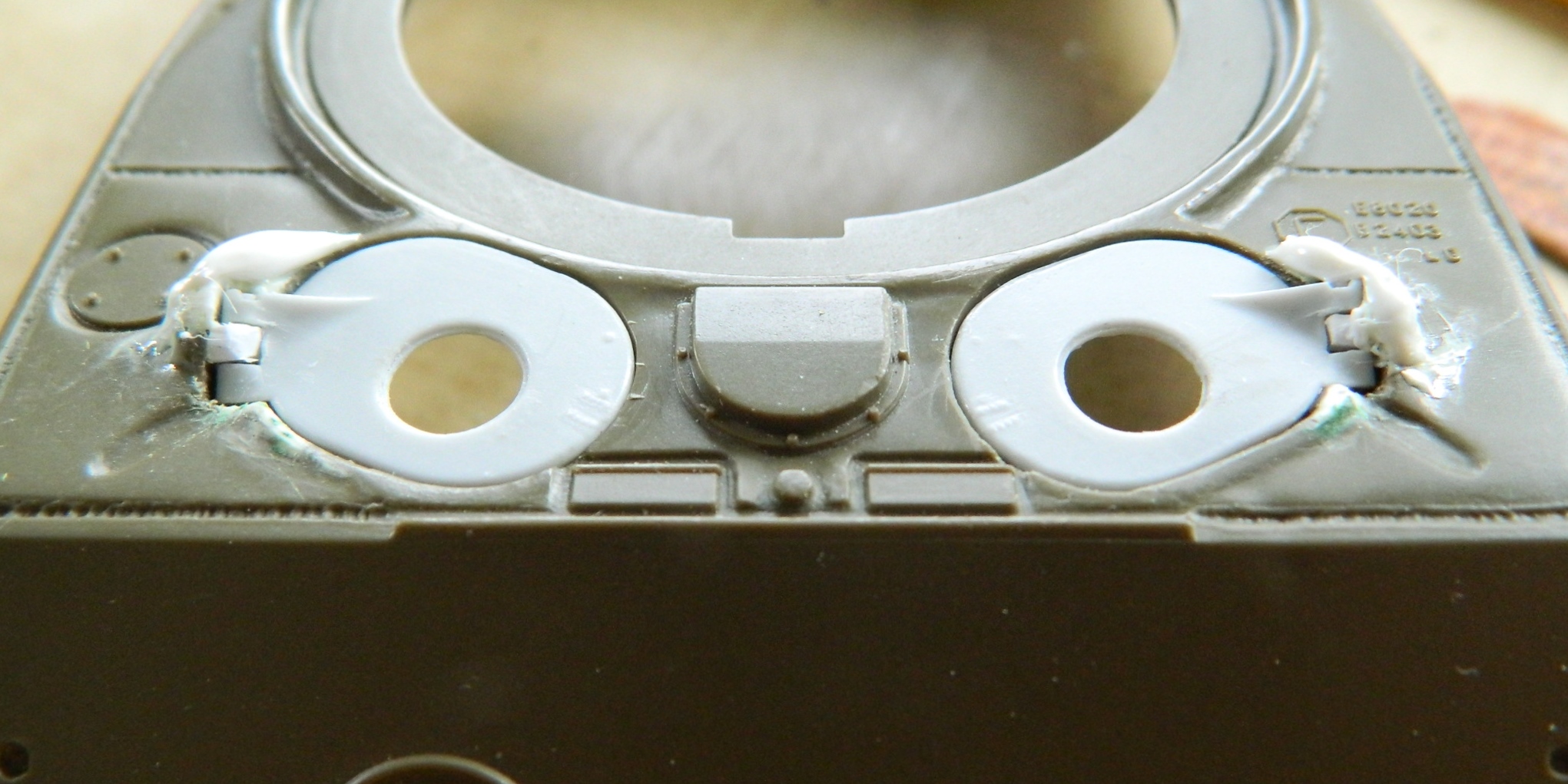 While cruising around online, one of the things I found was that New Tiger Models Direct makes nicely detailed hatches for the driver and co-driver. The bottom hatches are the kit-supplied part, the middle hatches are from another kit with better detail (and required me to resculpt the hinges on the bottom hull), and the top ones are the most accurate hatches I’ve found for the large-hatch Sherman courtesy of NTMD: