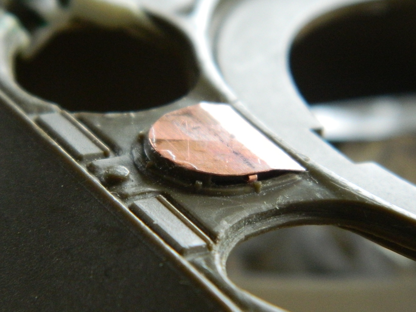 Once again I used .010 brass shim stock to make the replacement. I fumbled around trying to make a usable pattern to transfer the shape to the brass before realizing that this is one good reason I have an extra kit. I cut the section out of that kit and then trimmed it down: