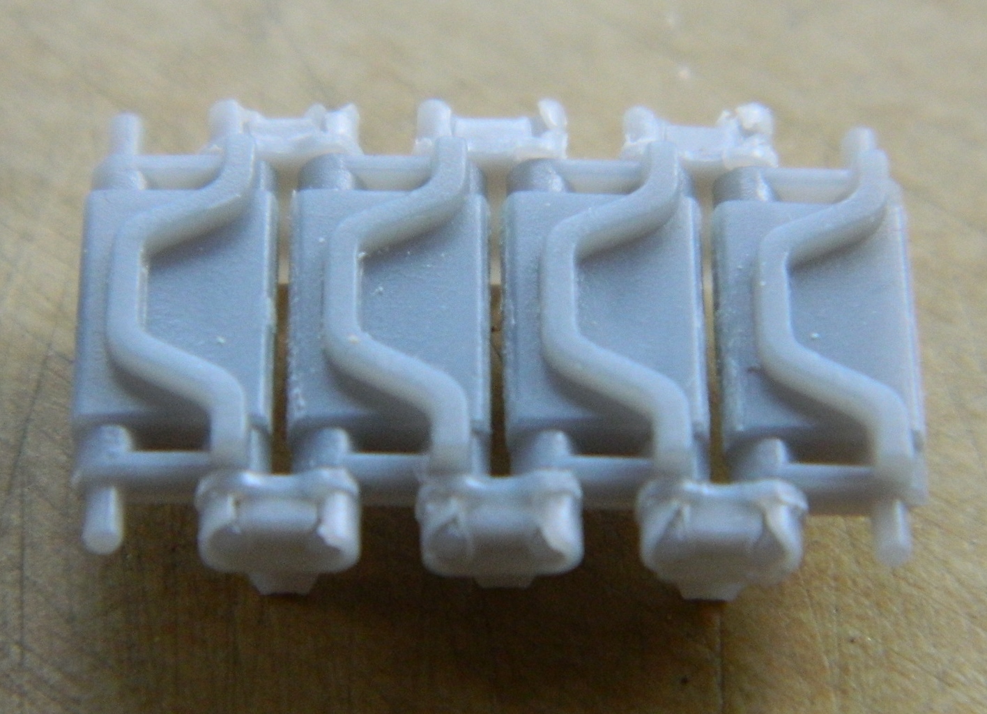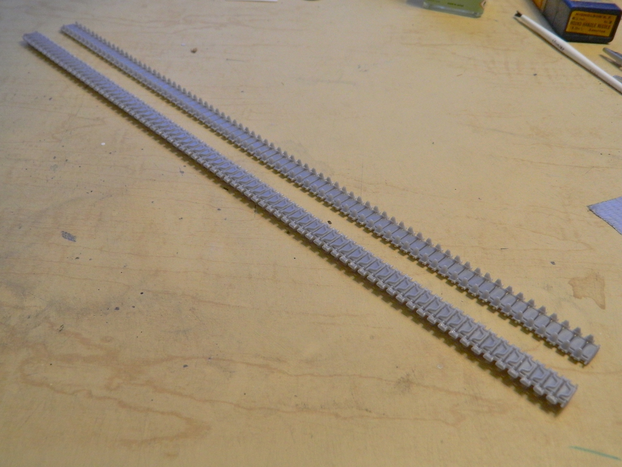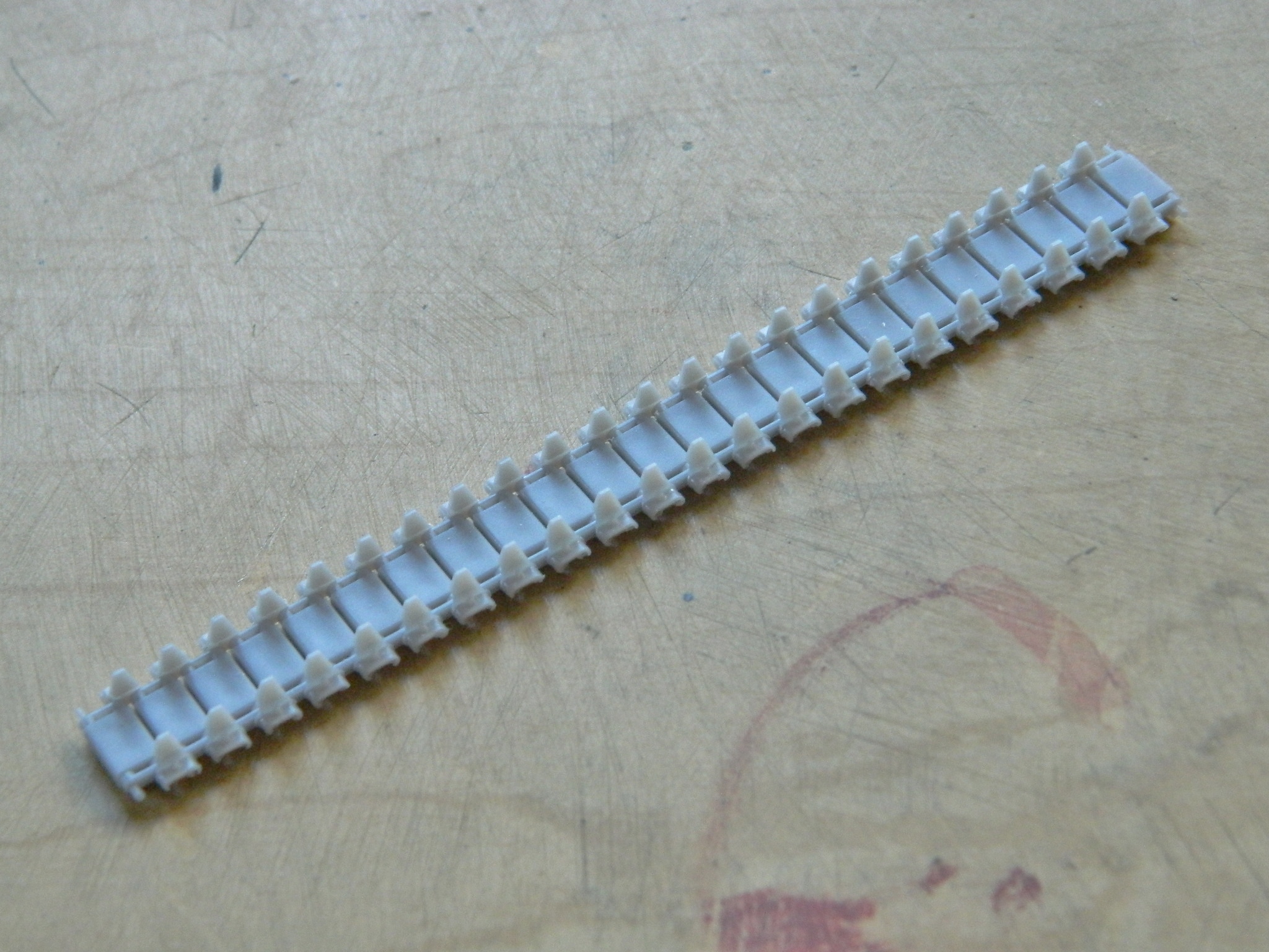 Why am I doing individual link tracks? The “rubber band” tracks the kit supplies are vinyl and they don’t hold paint well. When flexed, the paint tends to flake off. The tracks I’m using are styrene and will keep the paint (not to mention look much better).