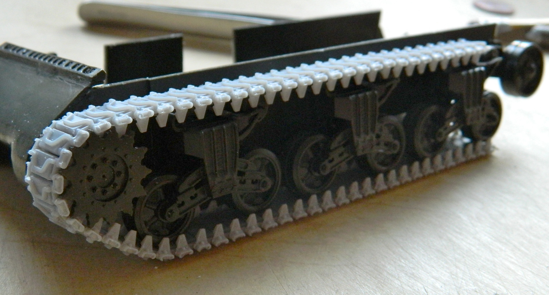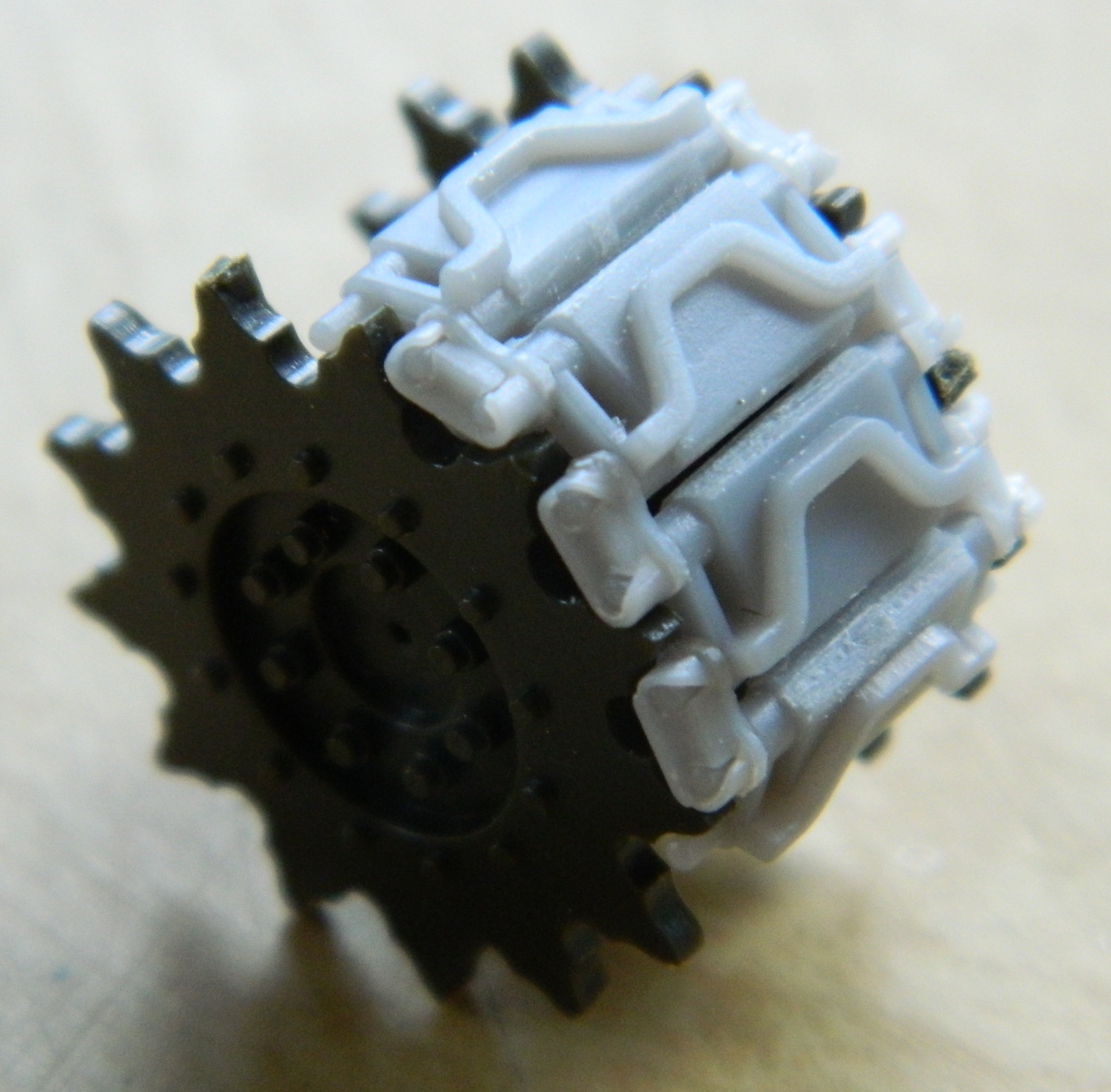 MANY hours later, I got both track runs assembled. Though Panda’s castings are clean with NO flash over the 152 separate pieces required to assemble the tracks, they are still cast pieces that have seams and each part needed those seams to be removed; it still took what seemed like forever to assemble them all. When I test-fit the tracks around the sprocket wheel, I noticed that the inner track face edges were just a little too square, so while I was removing seams, I also rounded the edges of each track so they would curve cleanly around the drive sprocket. (Hindsight has shown me that the next time I use individual track links that need edges rounded to round the edges of just the tracks that will bend around a wheel.)
