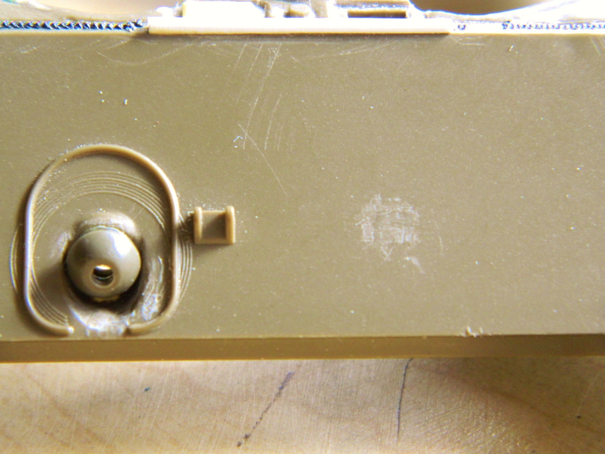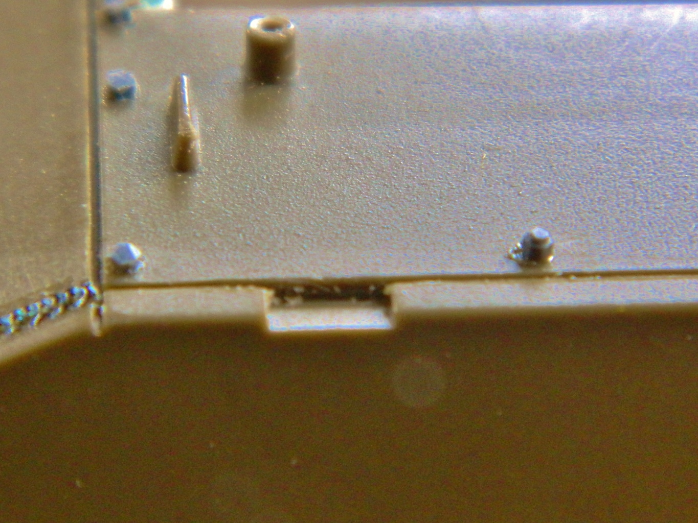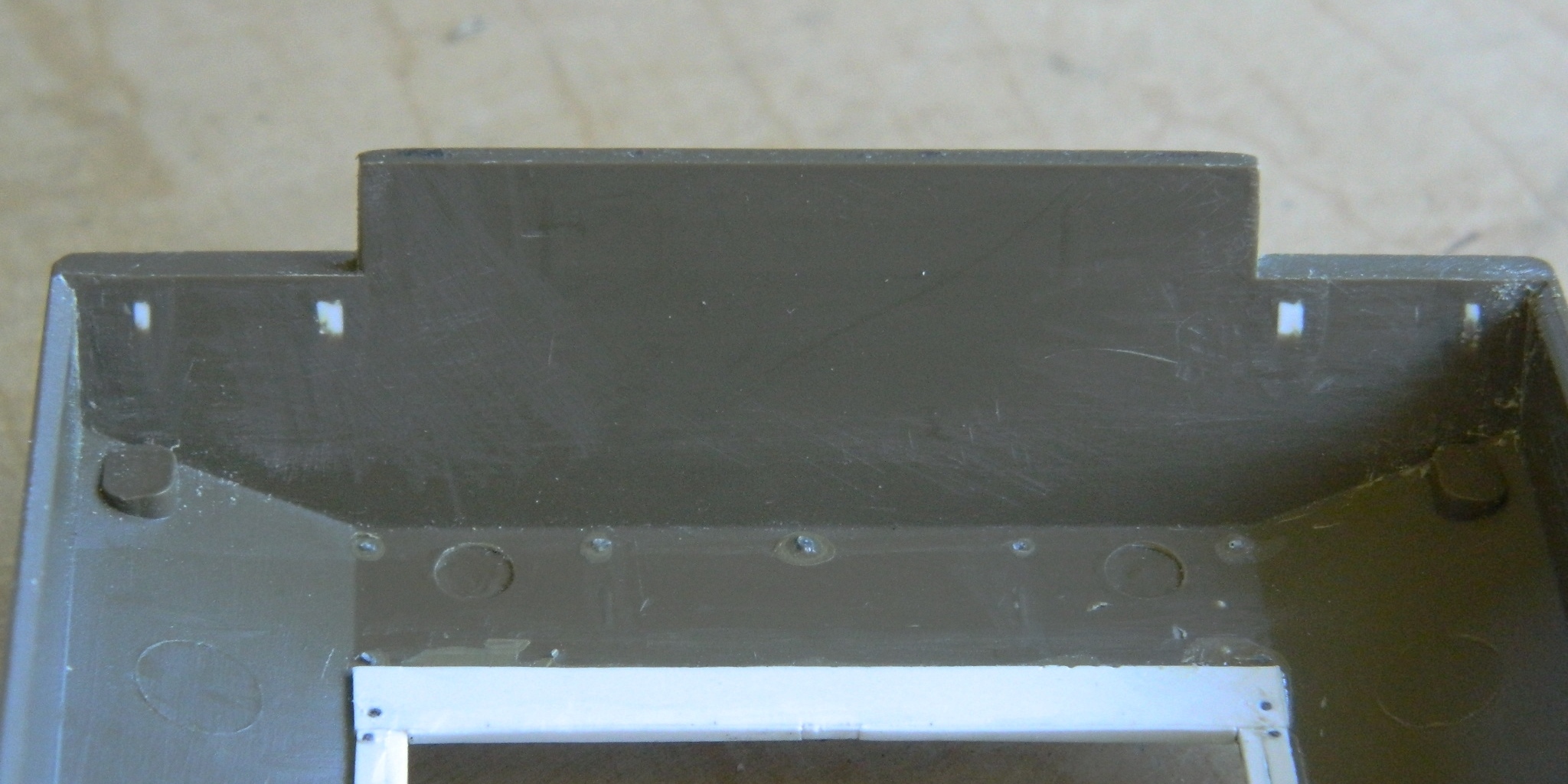 Since I will be replacing the kit’s storage brackets for extra track links with resin parts (NTMD again), the slots in the rear hull face need to be filled and smoothed, inside and out (removing the provisions for the slots on the inside of the hull is going to make fitting sponsons later SO much easier):