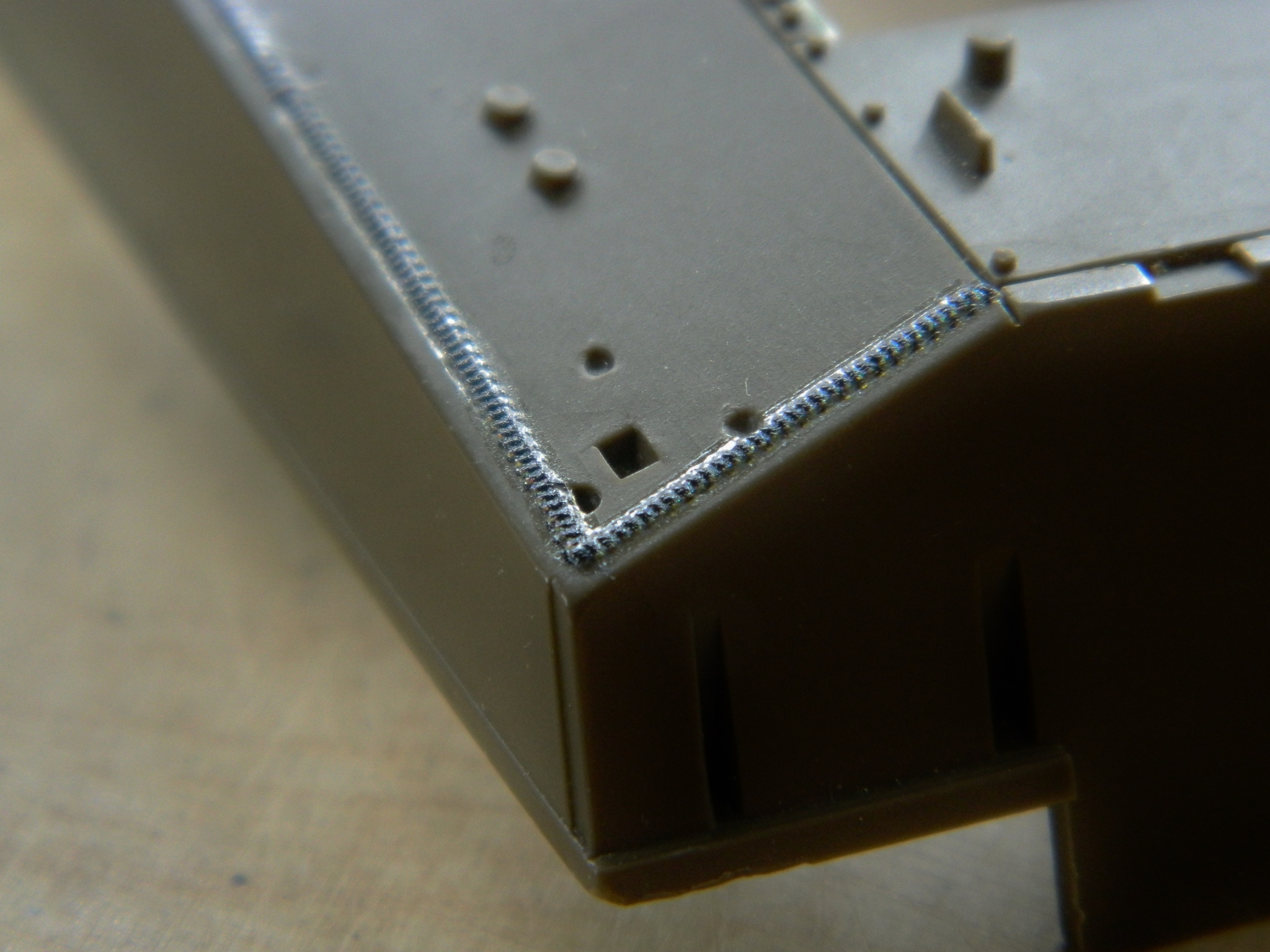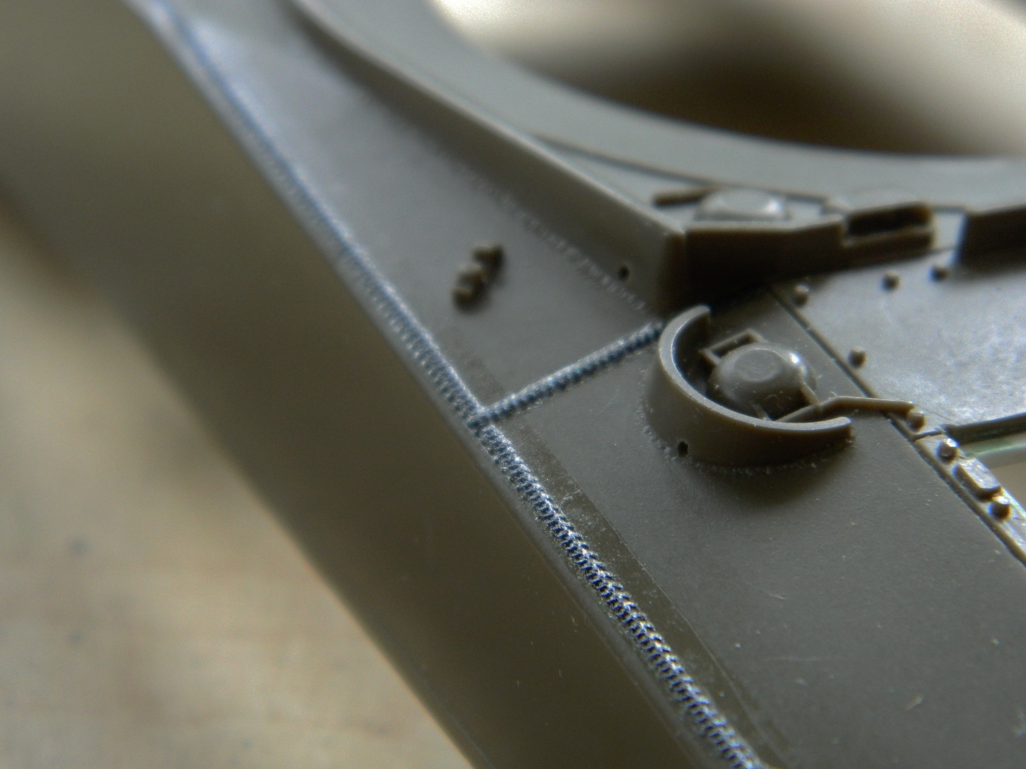 Tamiya got the weld beads wrong. On the kit they’re depressions and in reality they should sit above the surface. (This makes less than no sense to me. When cutting the dies, it would have been so much easier to cut the beads into the surface rather than to cut the surface down around the beads.) Archer Transfers makes 3D decals; resin details bonded to decal carrier film. They go on just like decals and though not perfect they’re a lot better. (As I worked around these beads, I discovered that I should have put them on later once I got to the point where I wouldn’t have to handle them much. They’re fragile and sections will easily pop off as things are added and the hull is handled). In order to more randomize the weld bead, I put down a wider bead first and then put a narrower bead on top of it: