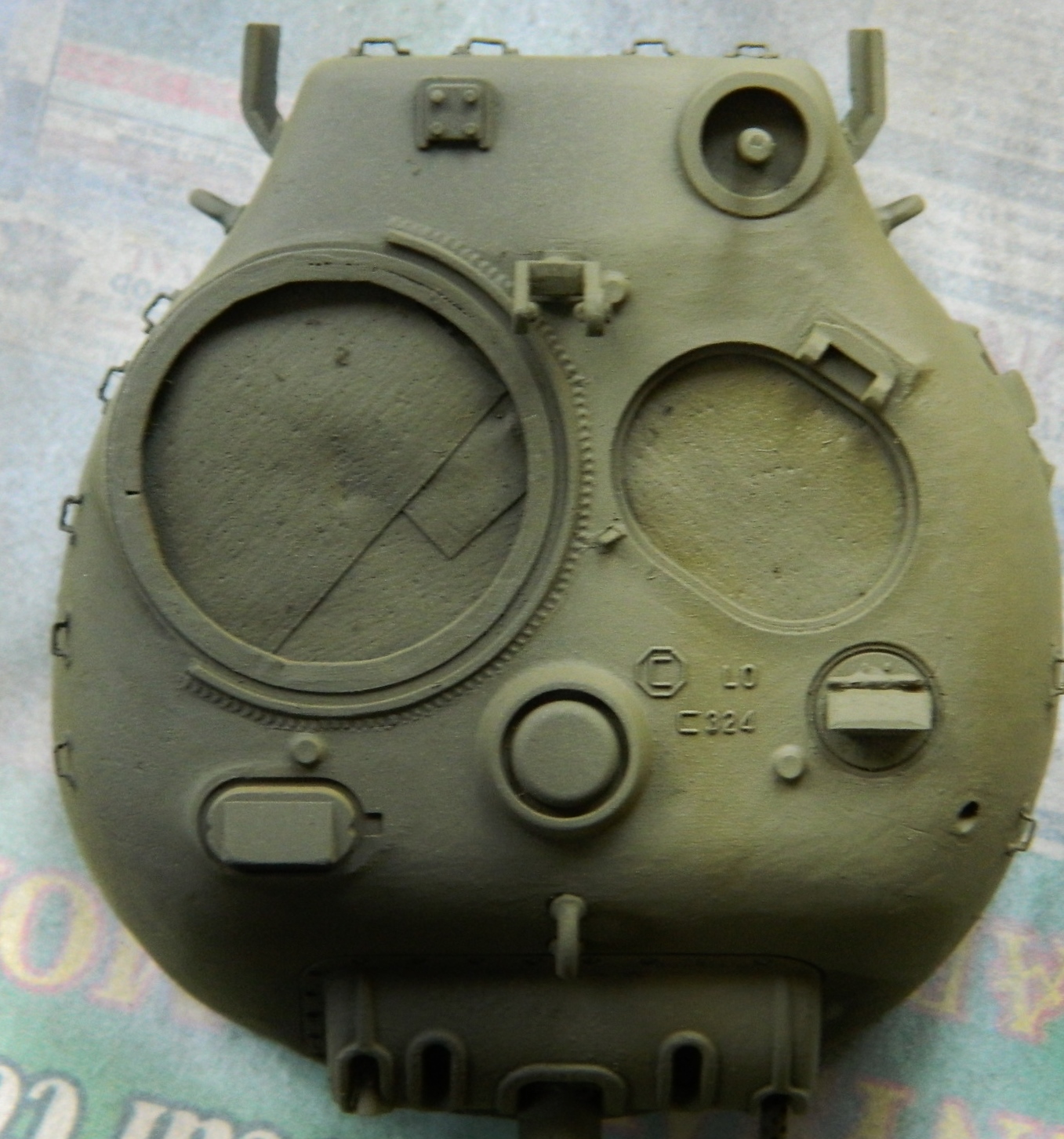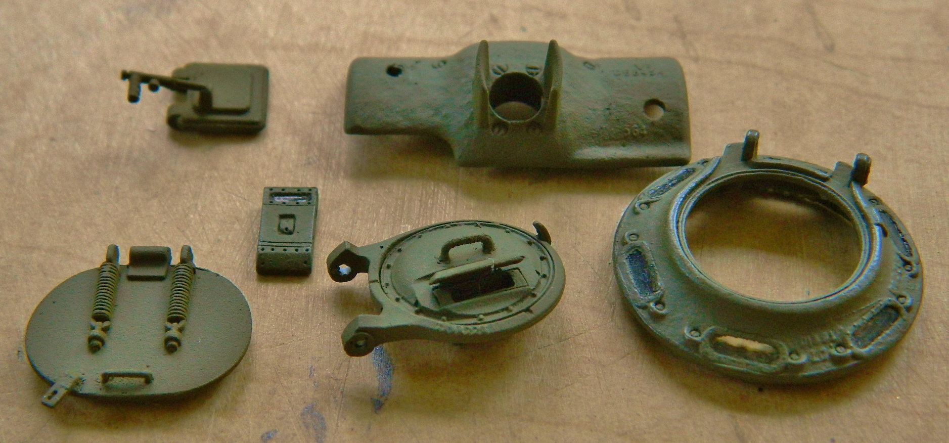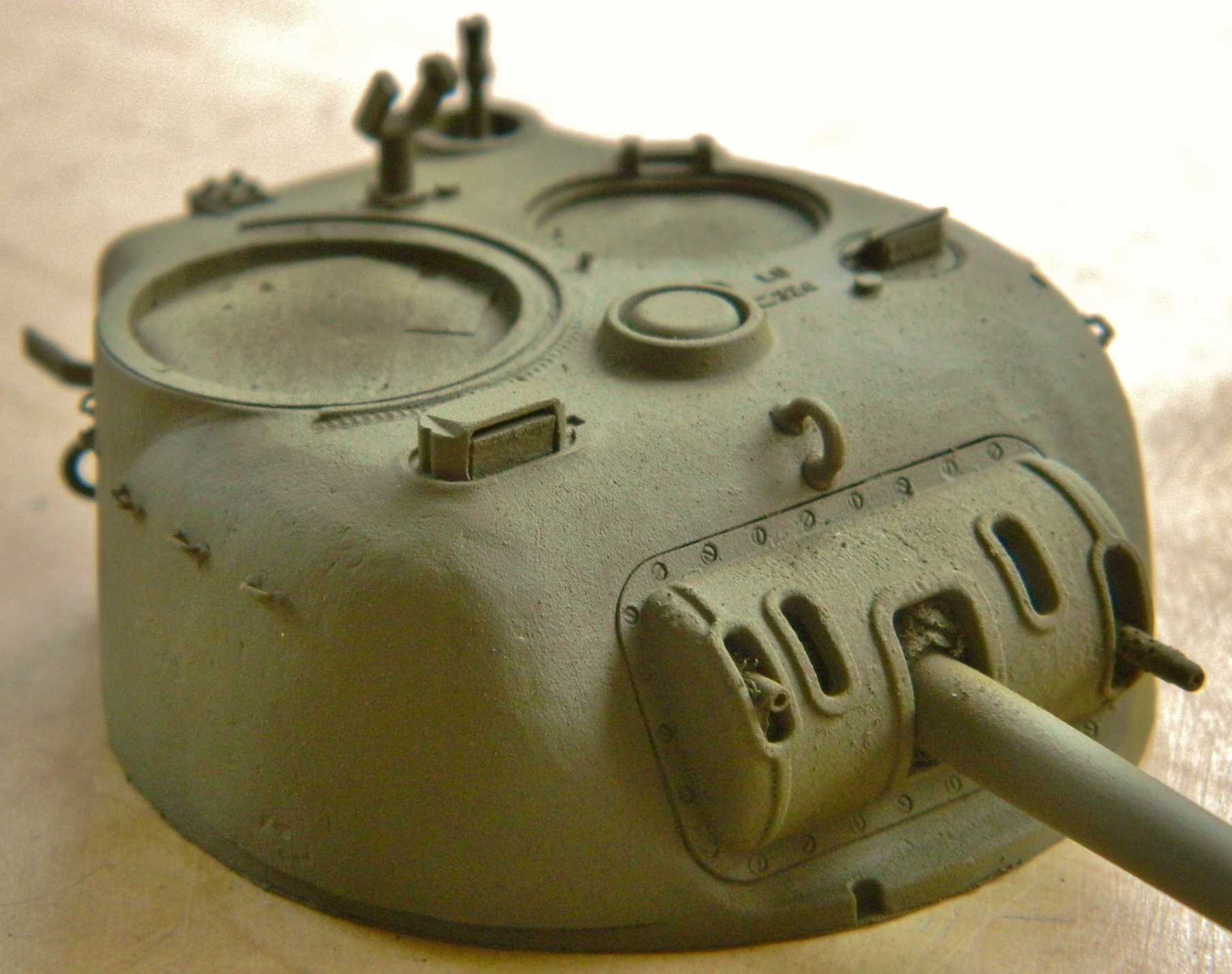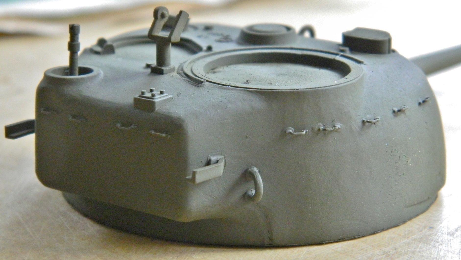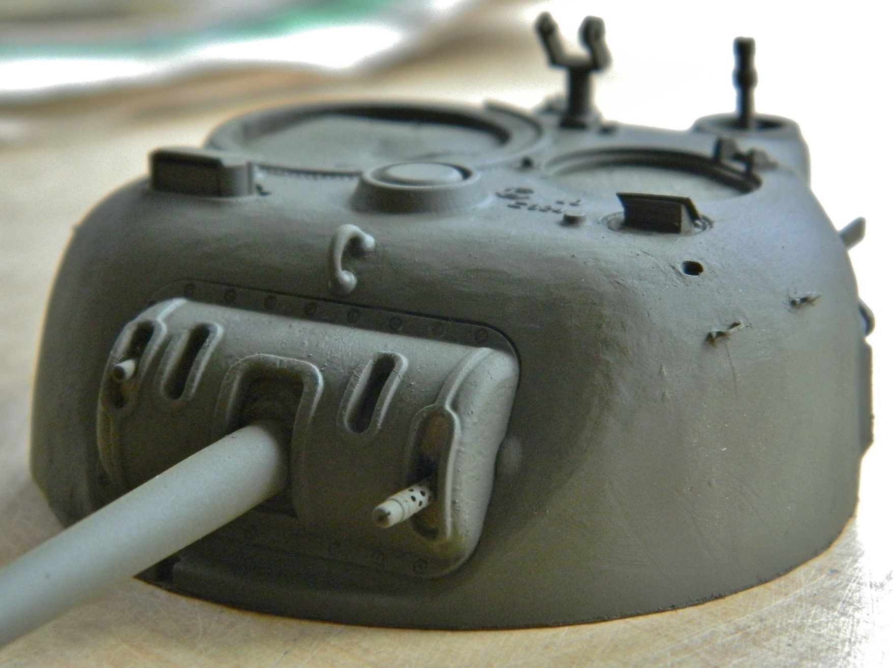 With those details taken care of, I threw a coat of paint onto the turret and other bits using Tamiya’s OD Green straight from the bottle (and if you look closely at the gun shield you’ll see I added casting texture to it using the same method I used inside the turret, though I should have waited before shooting paint; there are more details I have to add):