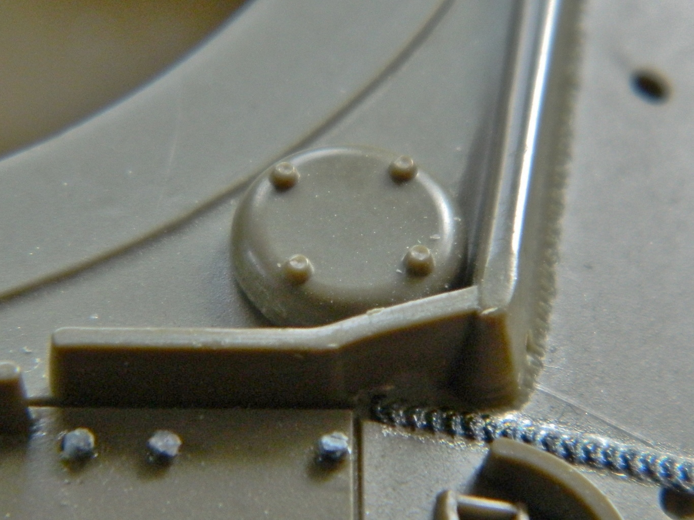 The driver and co-driver hatches were spring assisted to make opening easier. As it turned out, the similar springs for the loader’s hatch from my parts box(es) are just the size I want. I cut off the attachments for the loader’s hatch, added a Grandt Line bolt, and after cutting the inside of the hull to the appropriate angle, glued them in: