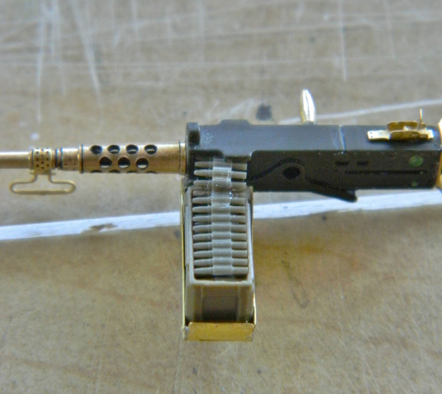 At this point, I was still assuming that I’d be able to not only prime what I wanted to be primed, but also be able to use the airbrush to do some detail painting. I turned my attention to the .50 caliber (1.27mm) on the turret top.