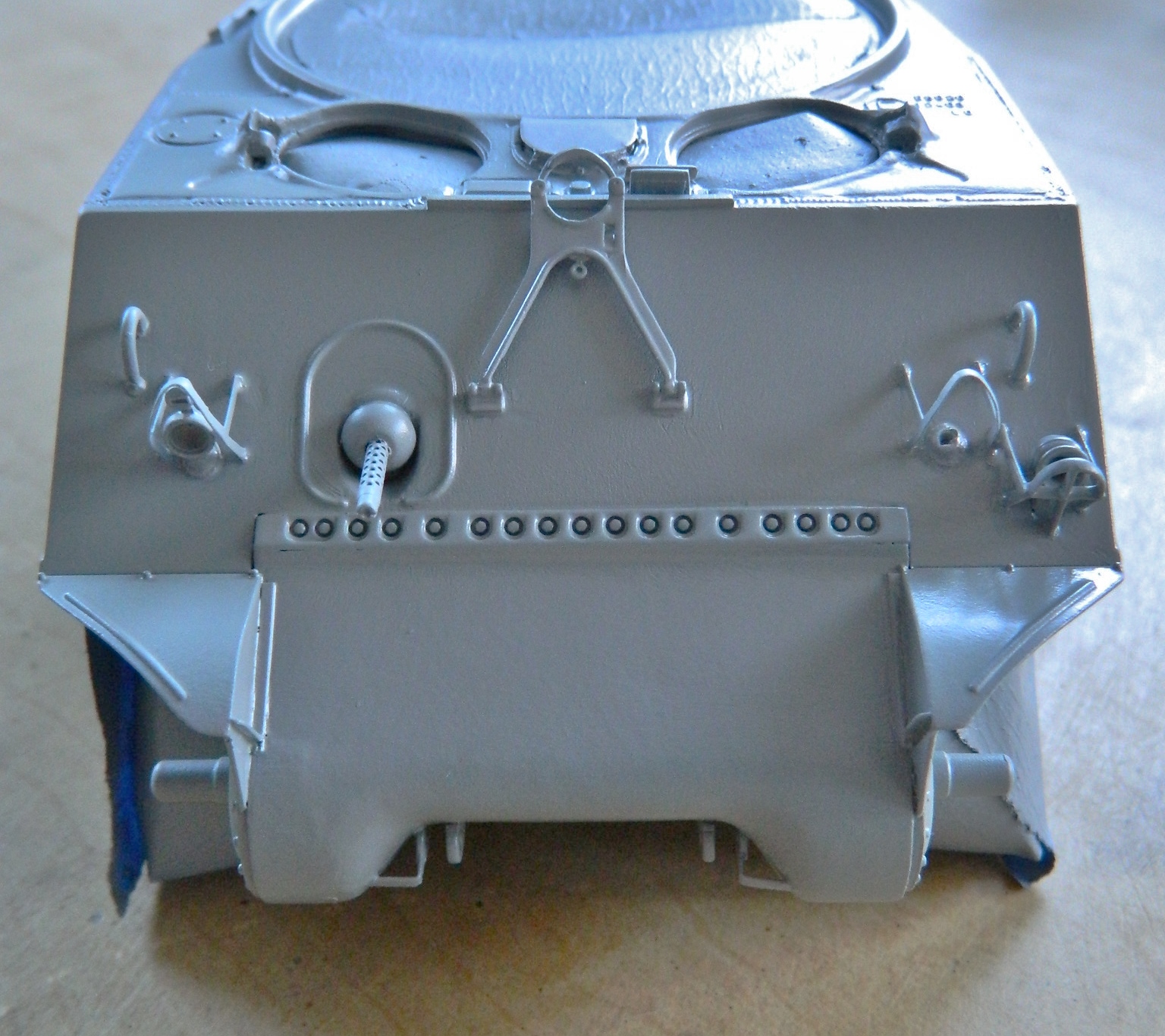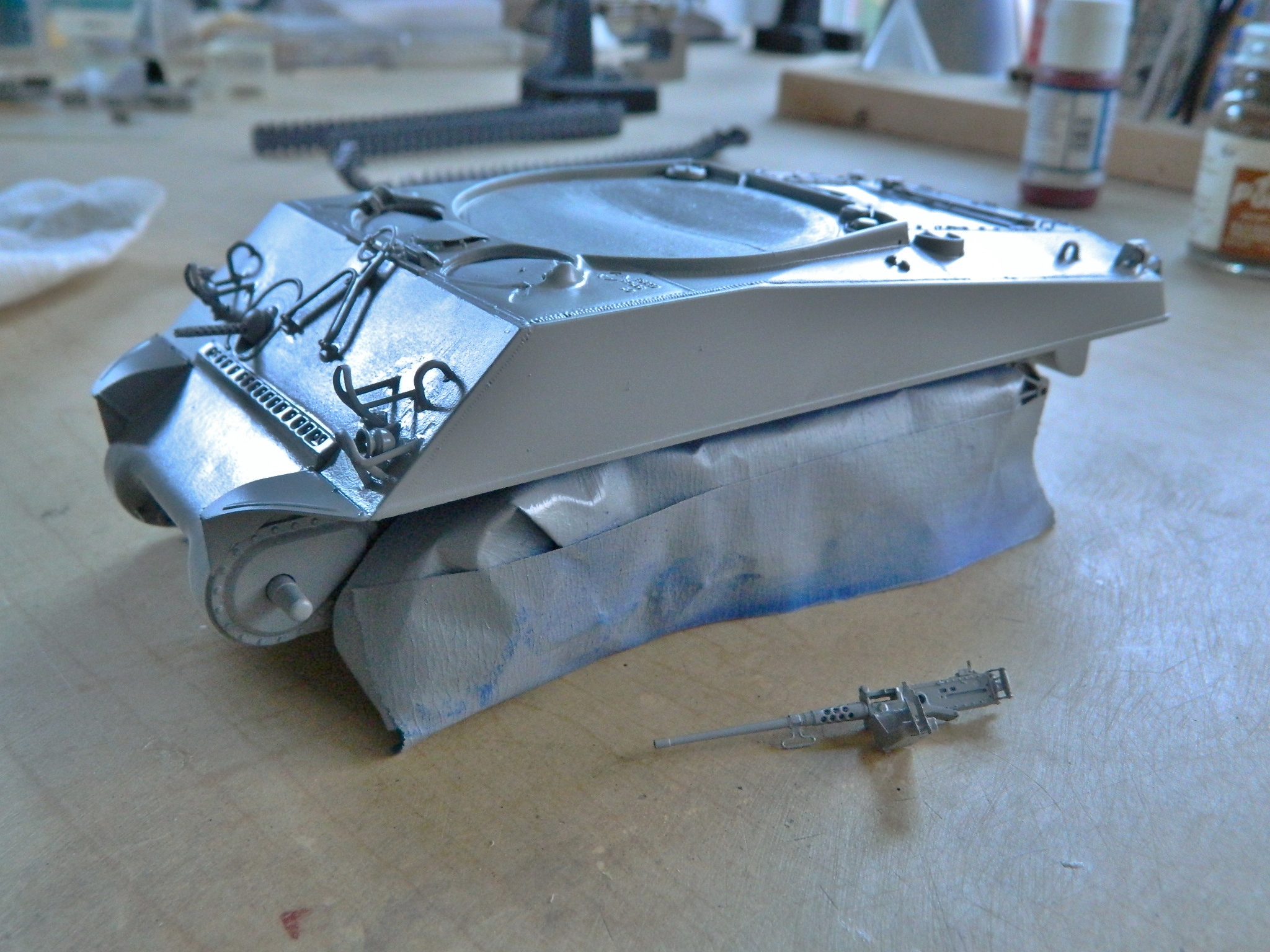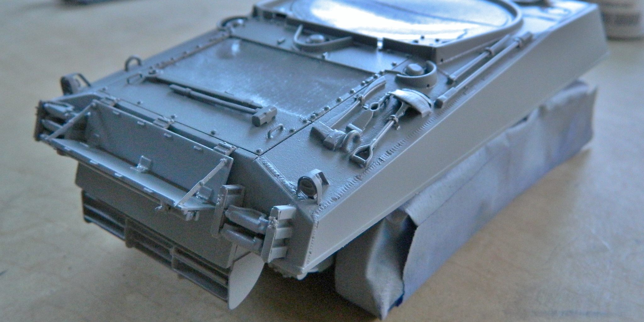 Now the primer will allow the subsequent paint layers some tooth. Tomorrow I’d like to get another detail or two added to the turret and then break out the airbrush to get some of the other details under paint, but that determination needs to wait for fresh brain and not be made with stale brain.