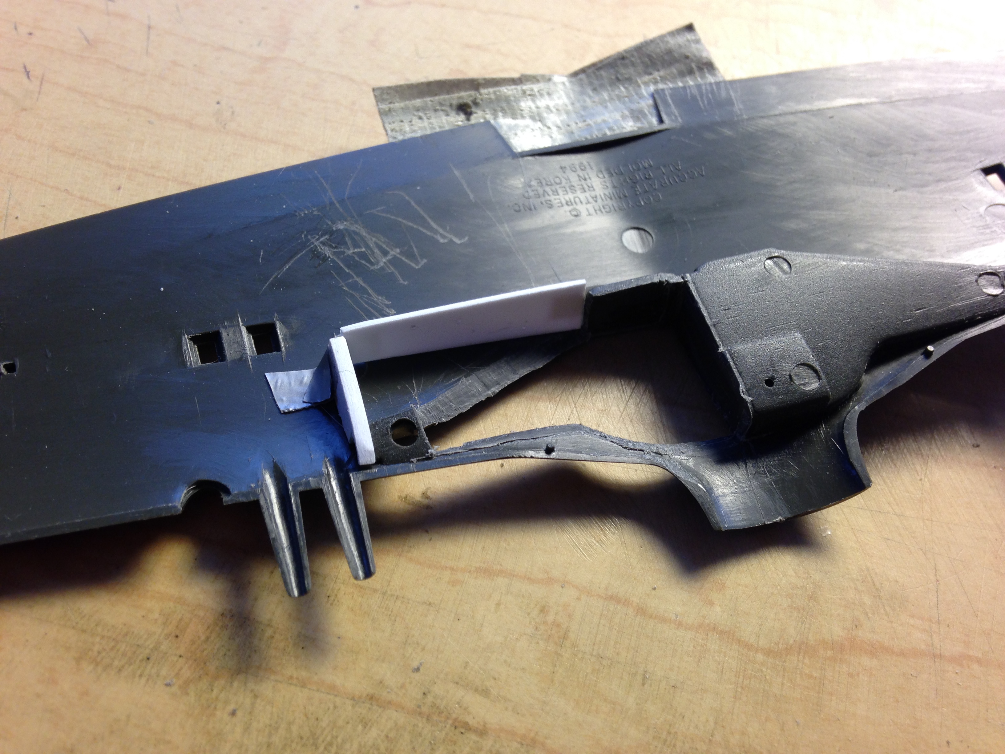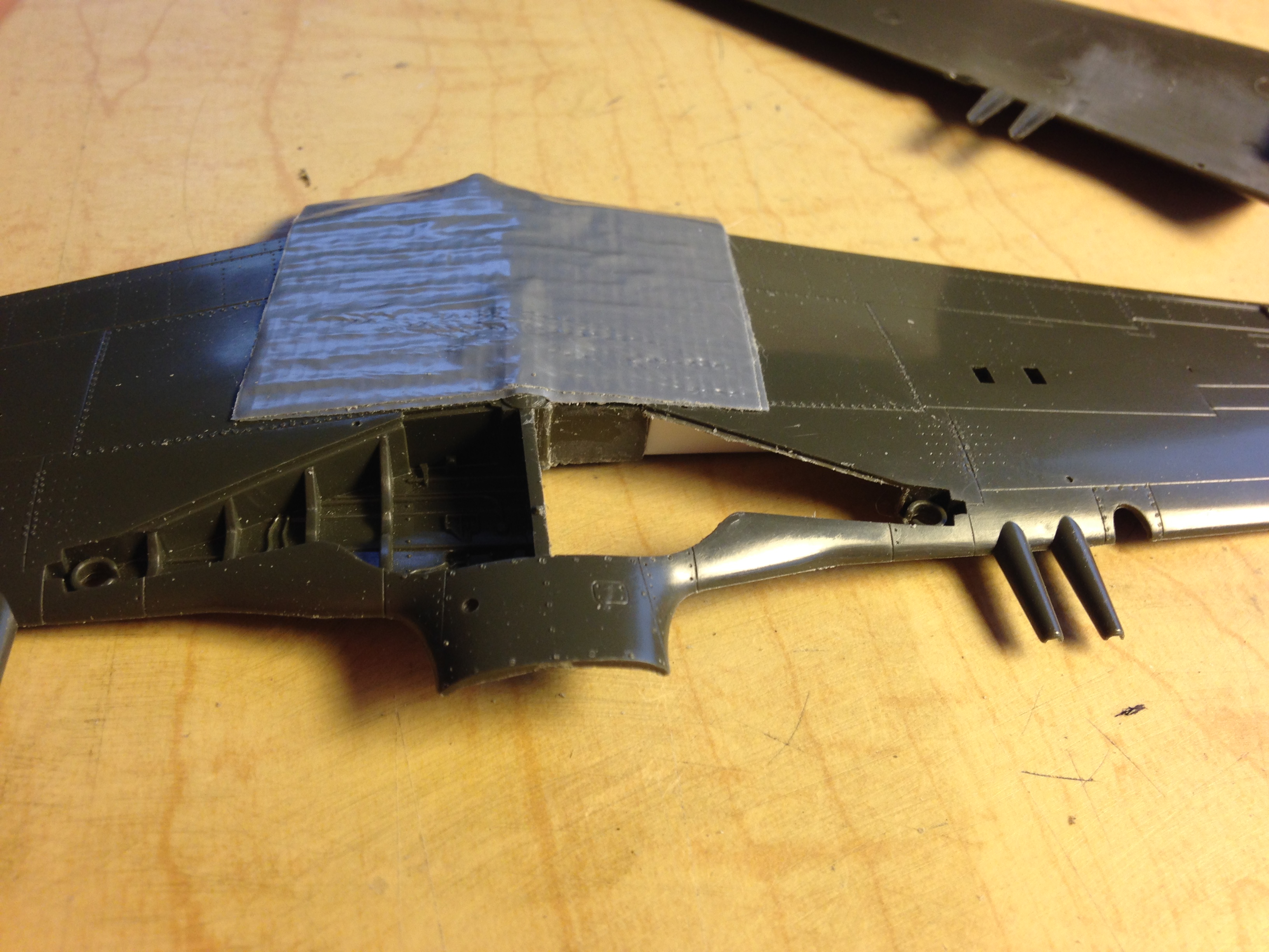 I used the one correct section of the molded-in landing gear wells as my reference. Once I had access to that section, I used card stock to create a relative template (so-called because I’m going to have to fit this fabrication inside the wing and I’ll do that once I have it in plastic as that’s more rigid and easier to work) and then transferred that shape to plastic and taped it in place: