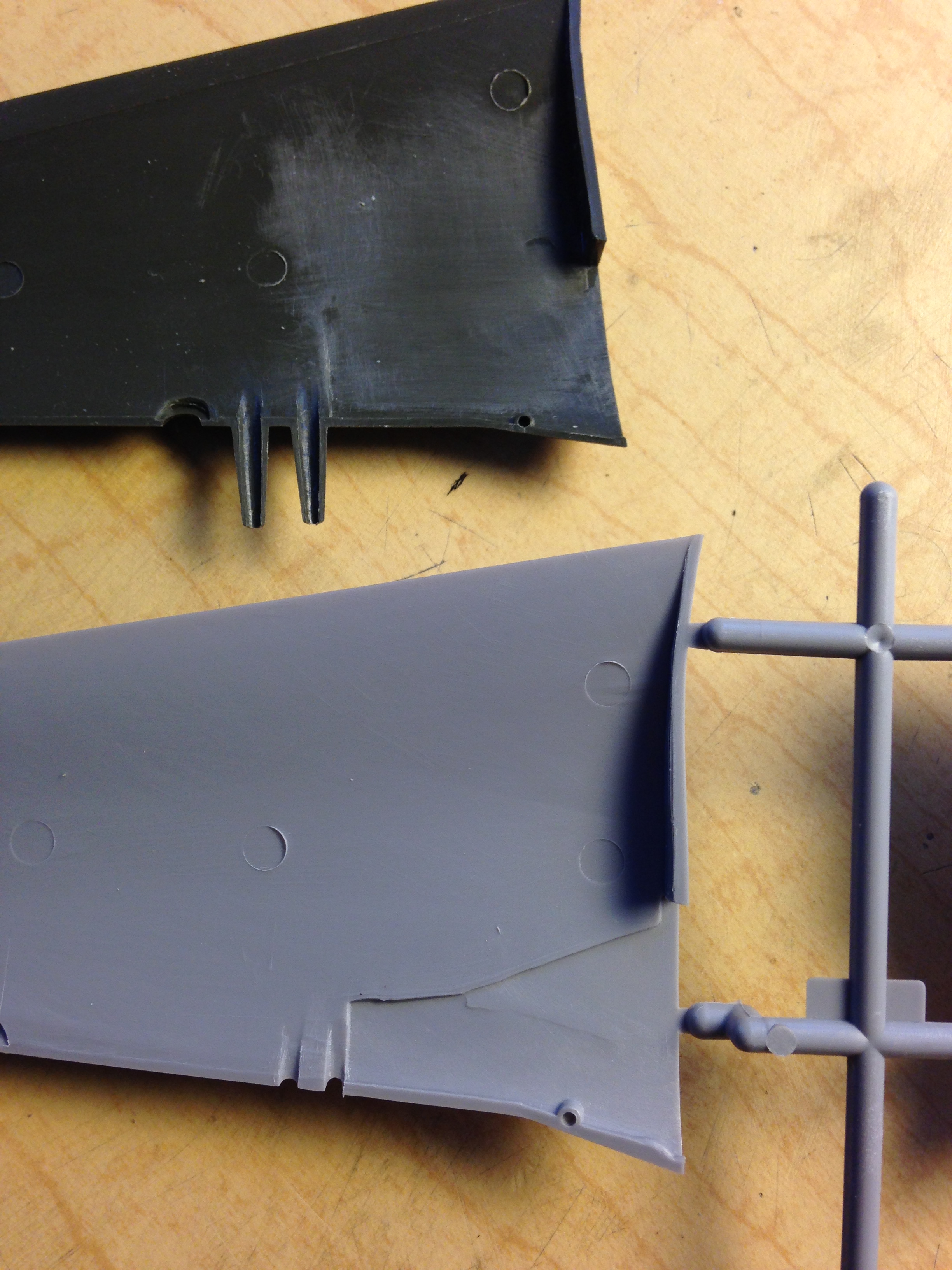 I neglected to take photos of the first removal but the coffee finally kicked in, neurotransmitters started conducting a current, and I remembered to take photos of the second removal which shows how I did the first removal. I started with many passes using a panel scribe and once I had broken through the plastic, used the small #11 saw to finish the job (note the proximity of the knurled collar of the knife to the belly of the wings, which I didn’t notice during the first cutting…and that oversight created more work for me, as I’ll show you shortly):