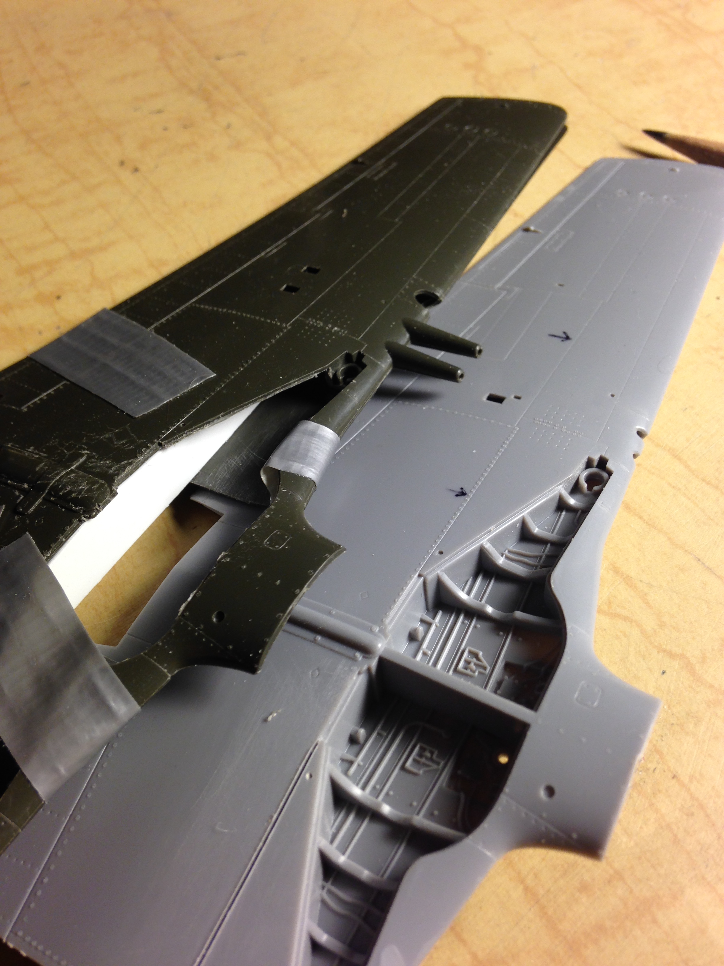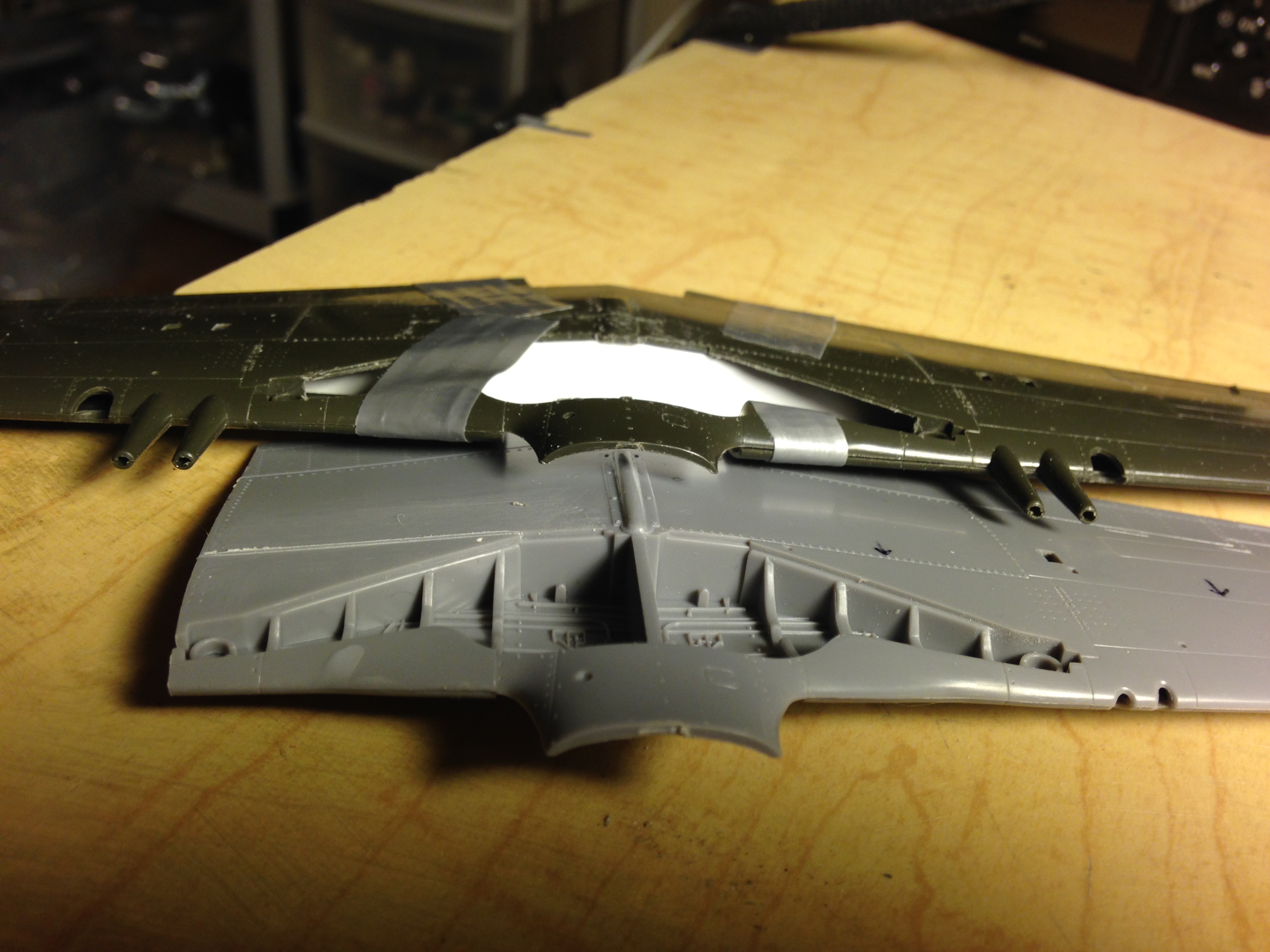 You’ll note how chewed up the underside center of the wing is. This is what can happen when one (me, particularly) focuses on one area being worked without paying attention to adjacent areas that could be (and in this case was) affected by the tool. That area got chewed up because I was so focused on the area I was sawing away that I failed to notice that the knurled handle of the Exacto knife saw was rubbing on the wing. So that’s going to need fixing: