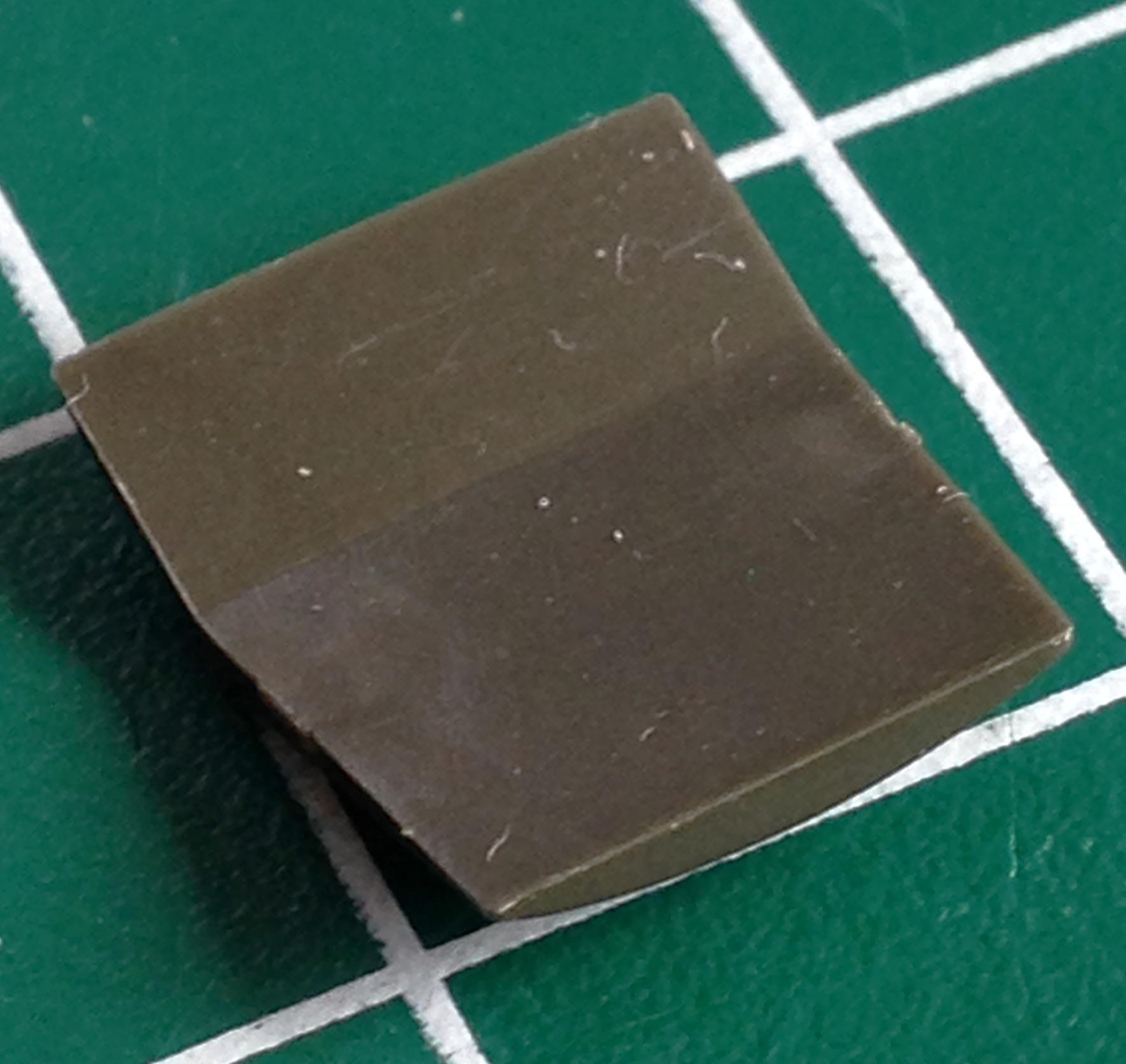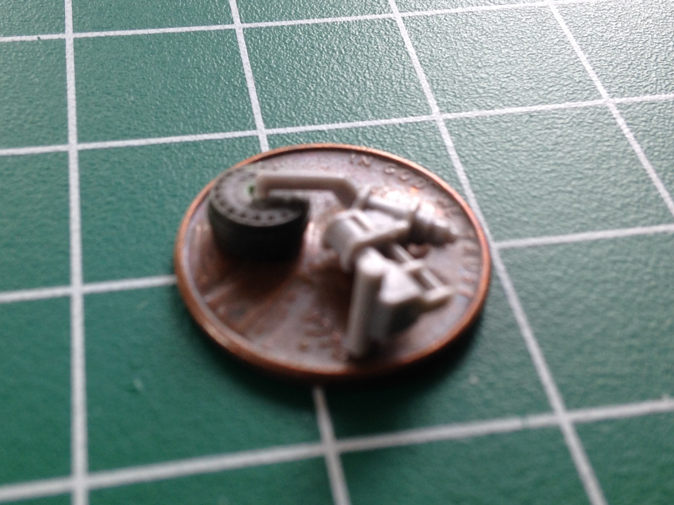Okay, so that means I can either try another pour or fix this one. One thing I am more than lazy is cheap. Doing another pour means wasting resin (the smallest increment that can be mixed is an ounce…and I have NO need of that much resin just for this little sodding bubble). That means I cut the strut where the bubble is, add a disc of styrene (.015″ (.381mm) as it turned out), and finish it to invisibility: