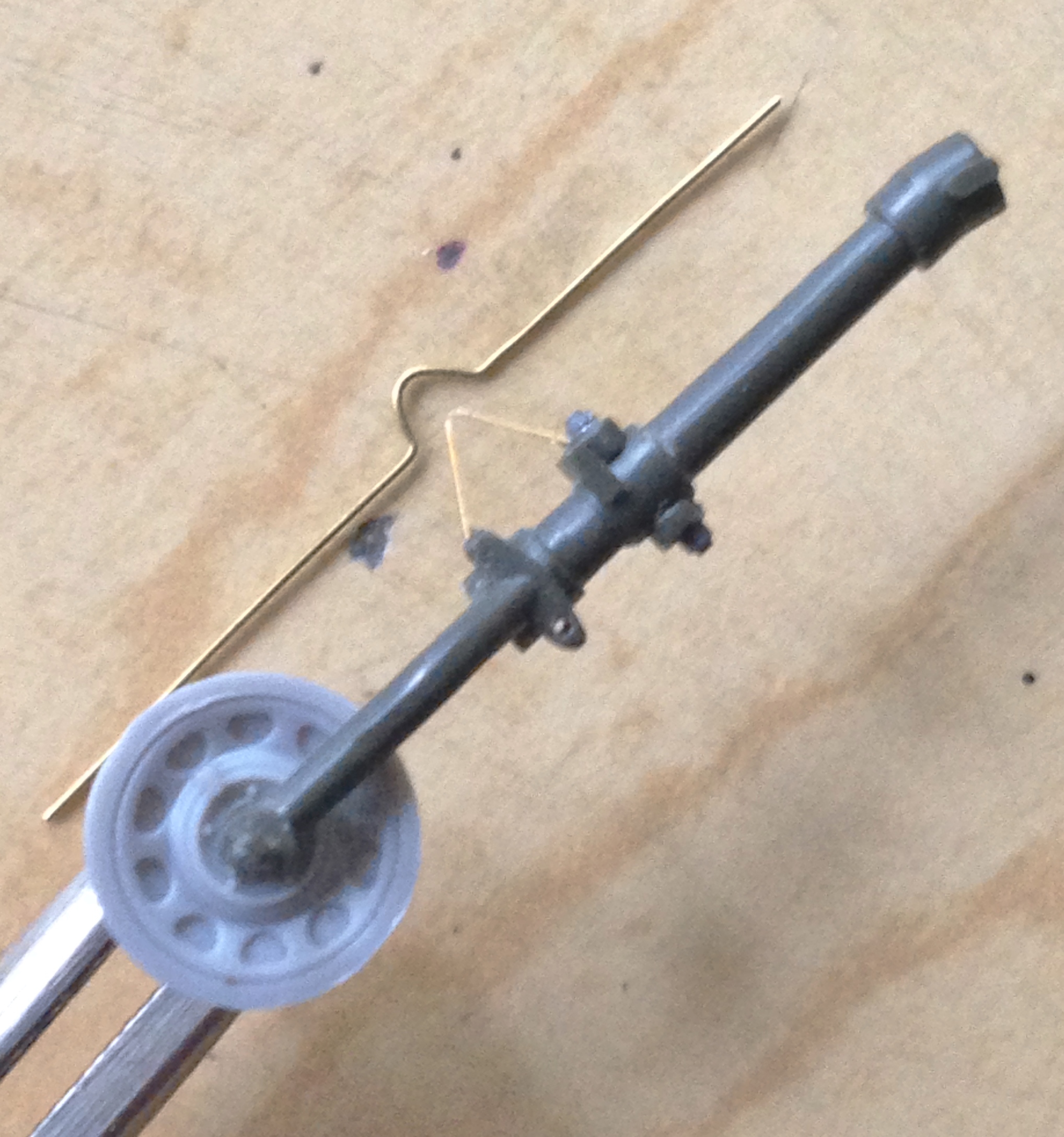 Next step was to add the brake lines. I used annealed copper wire (it bends easier) for the brake lines. Before the brake lines were added, I painted the steel section of the strut “steel” and then masked those areas off and then glued the wire in place before adding two bolts to each strut (if you look closely you’ll see the purple bolts):
