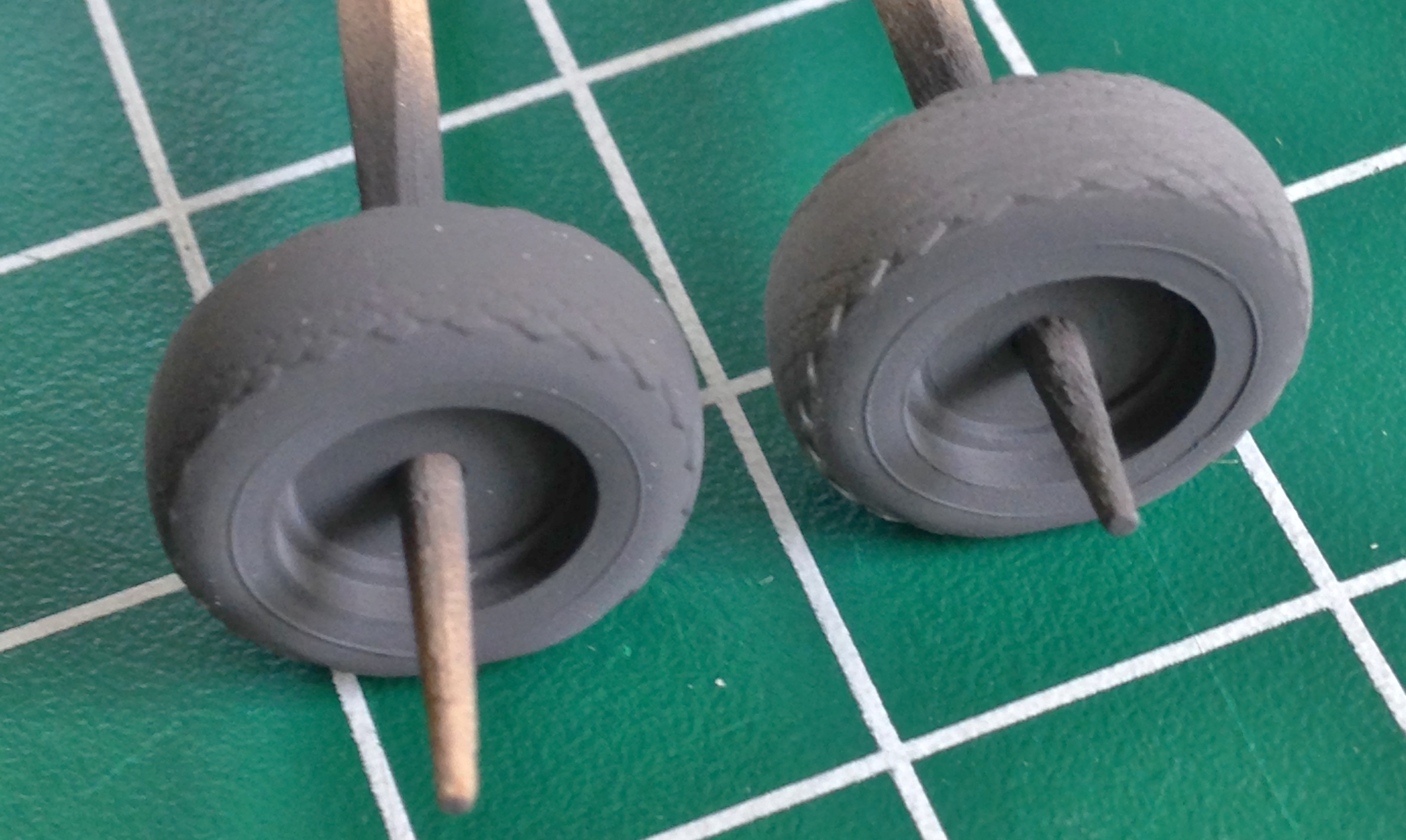 I used the tail wheel part from my sacrificial kit as well. From one part I cut the tire away and re-sculpted the strut to the proper L-shape, and from the other part I cut away the strut to end up with just the tire: