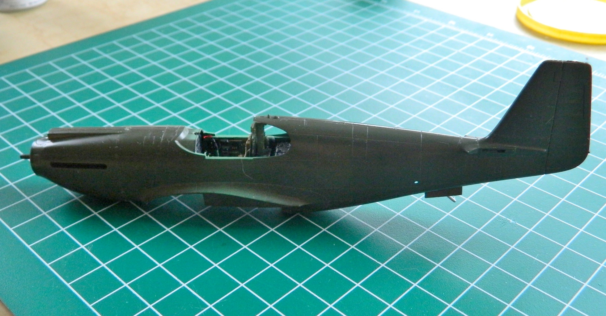 And from my initial attempt to convert a P-51B to an Allison Mustang, I had a seat cushion I’d made from a sheet of .060 styrene. I checked its fit and though slightly smaller than I would make today, I decided it was certainly close enough so I painted it and glued it in place:
