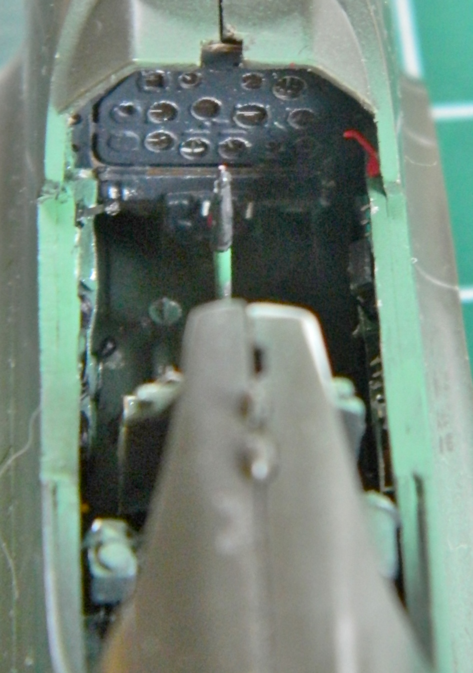 One of the things that needed re-sculpting was the edge of the hood (aka, coaming) above the instrument panel. On the actual aircraft, there’s a hose that’s slit and slid over the edge of the aluminum. I’d briefly considered removing the molded-in ridge but the surface area the glue can work is VERY thin and stood a good (or bad, really) chance of dissolving it. Rather than go down that hole, I re-sculpted the areas of the lip that was out of scale. Below the section on the left has been done and the section on the right not done (sorry about the blurred photo…it was the best I could manage):