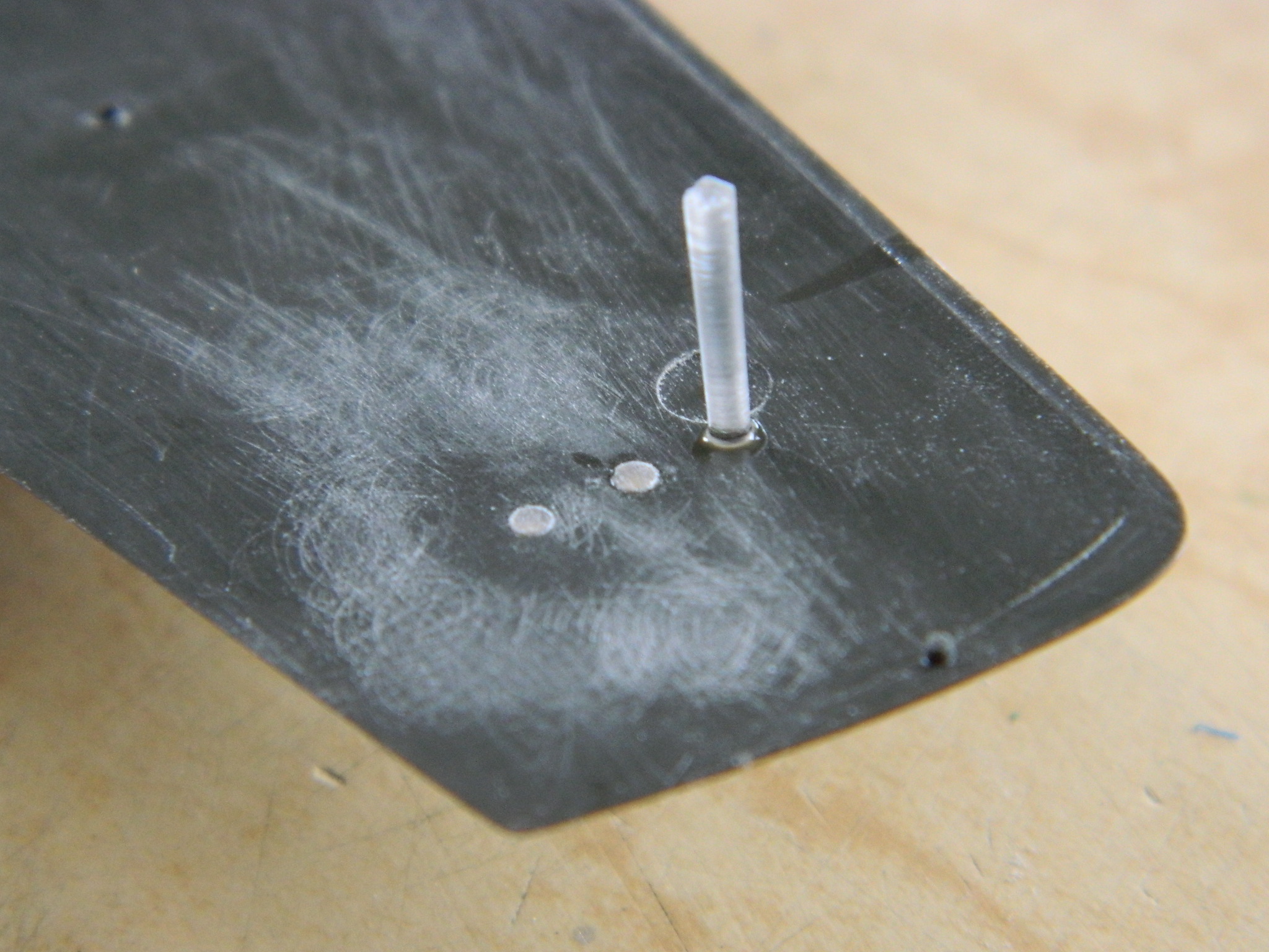 A section of clear sprue was chucked into a drill and spun slowly while I used files, emery boards, and fine sandpaper to create a tapered section large enough to fill the hole: