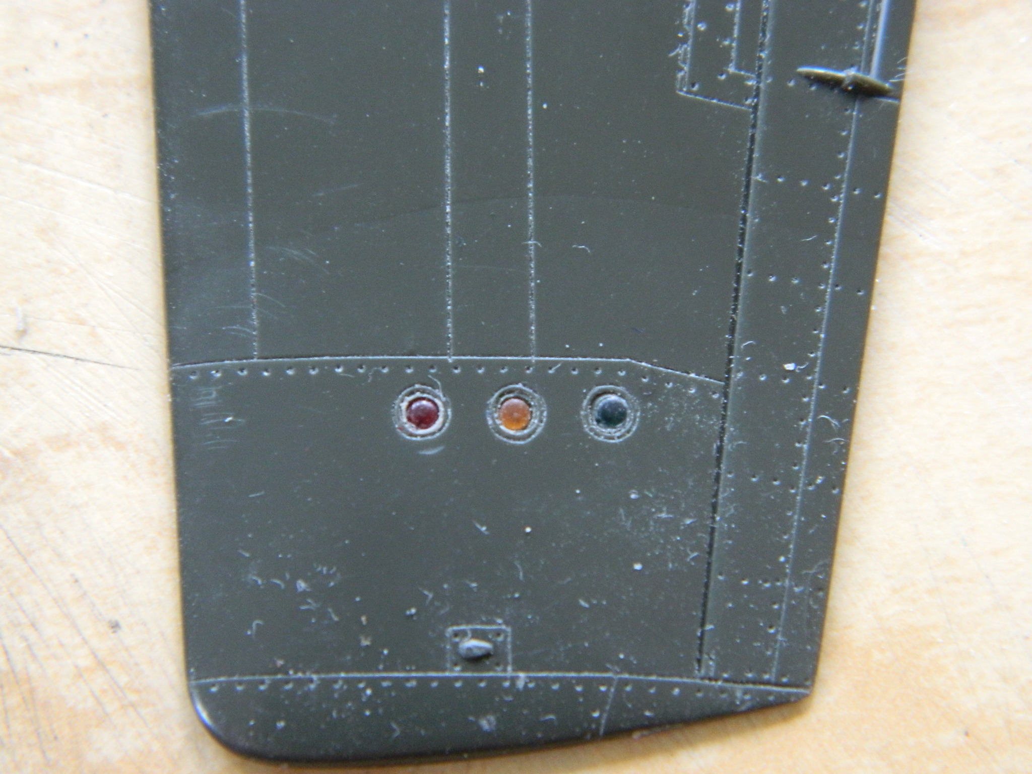 All the Mustangs (at least through the D variant) have three lights under the right wing. Rather than do the easy (and probably sane) thing and just paint the molded details, I decided I’d drill out the lights, replace it with clear sprue, and back paint them the proper colors: