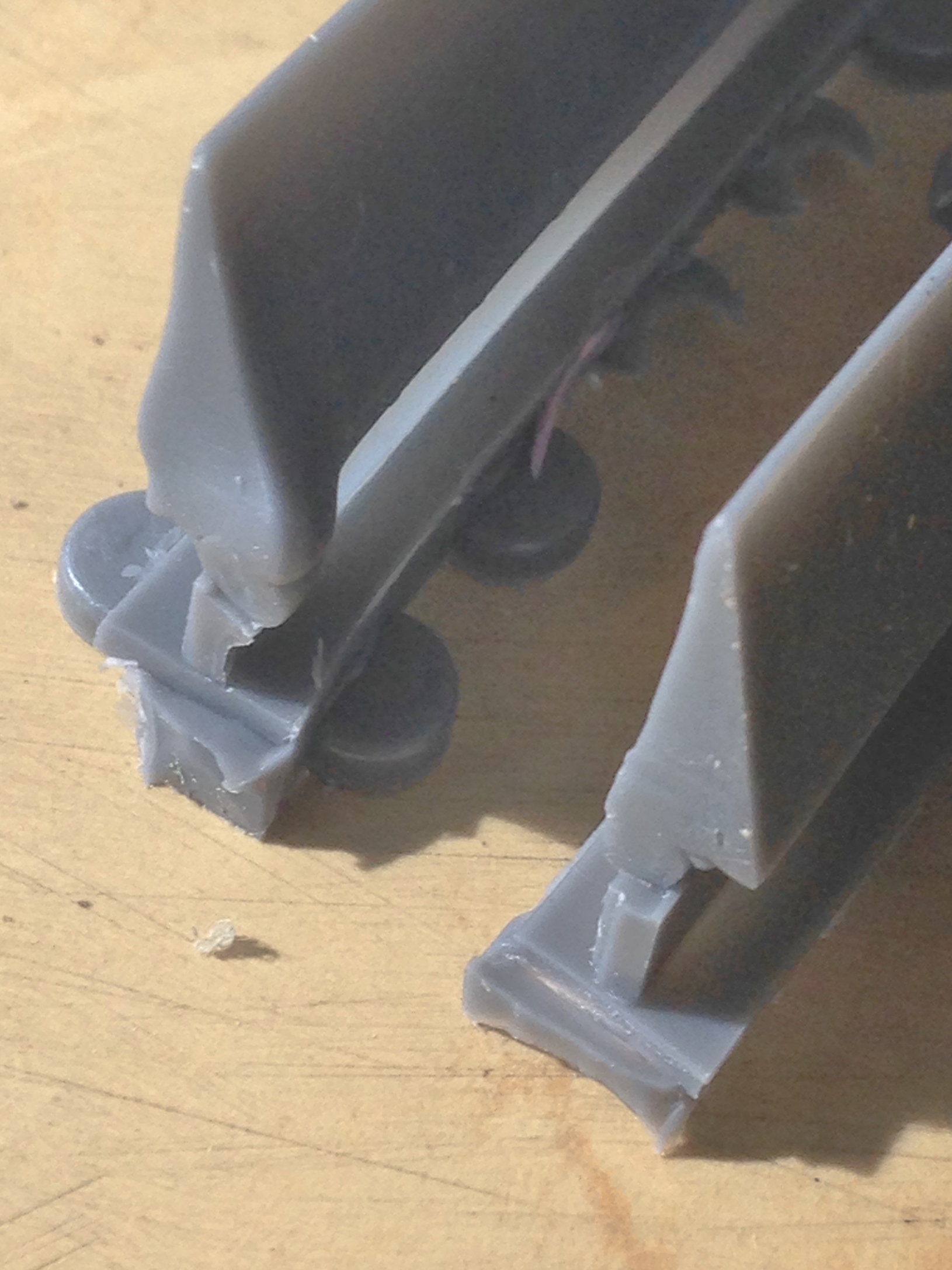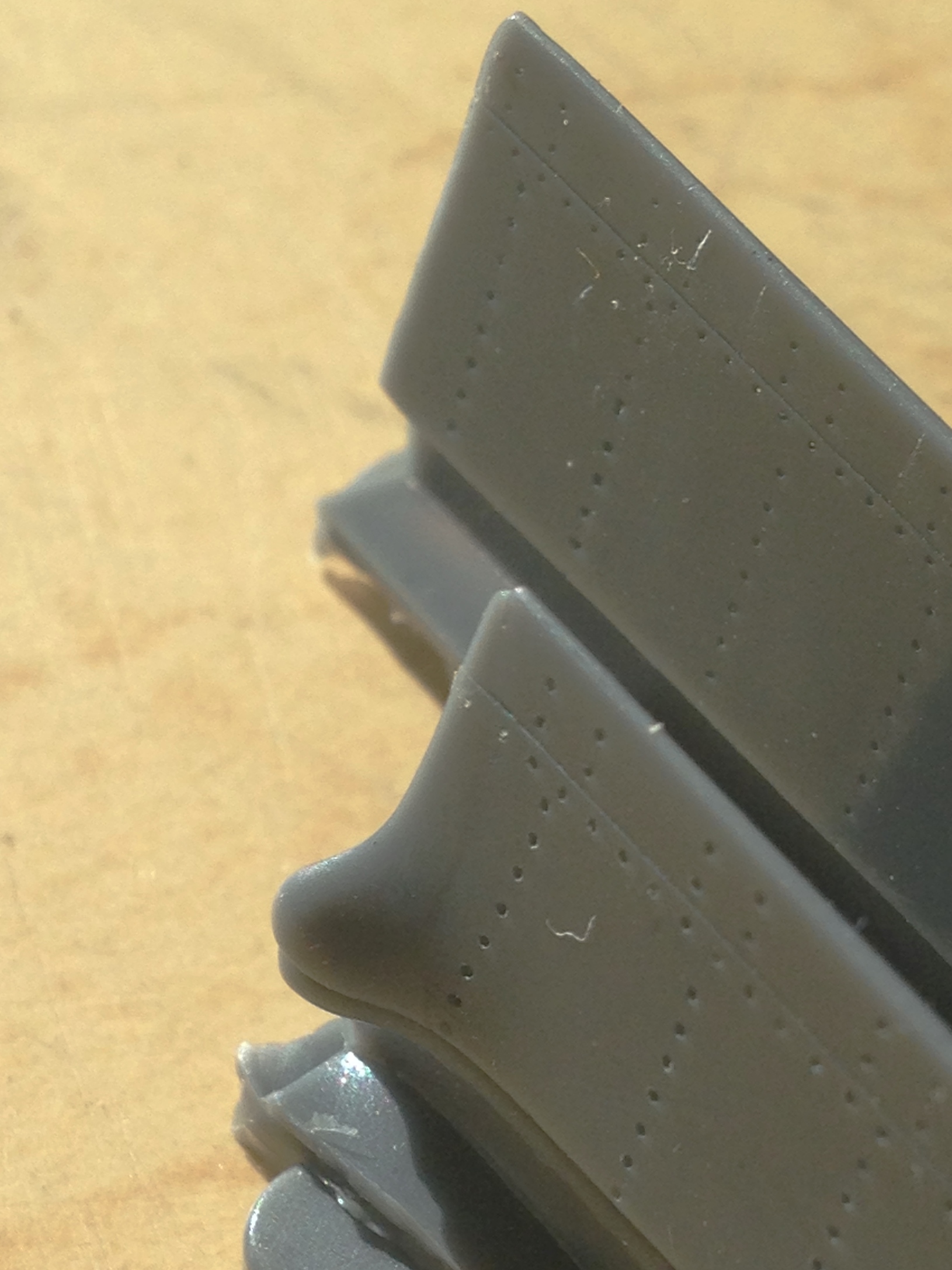 In the process of all that fitting, the resin flaps were handled and manipulated. A lot. This resulted in me wearing away the corners of the resin parts. To put back the shape I used gap-filling superglue: