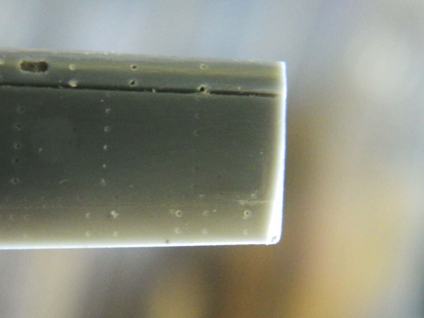 That, ladies, gentleman, and children of all ages, is a bubble. It’s a damned big bubble. I sat there for a while trying to figure out how I got a bubble. The best I can come up with is that due to some idiot (me) putting in far too much hardener, the rubber set up in the vacuum chamber before that damned big bubble could migrate to the surface where it would pop. But that doesn’t explain why it’s a bubble under pressure. And it’s obviously pressurized, otherwise it wouldn’t bulge like that. That bubble wasn’t there when I broke down the mold box. That bubble wasn’t there when I filled the mold with resin. And that bubble should have collapsed when I put the mold/resin into the pressure pot and left it there for 24 hours under 55 psi (121.25kg), either. But there the bubble stayed and, for some reason, expanded. How the intercourse it did that I still have no idea…and I have less on an idea as to why it did that on both sides.