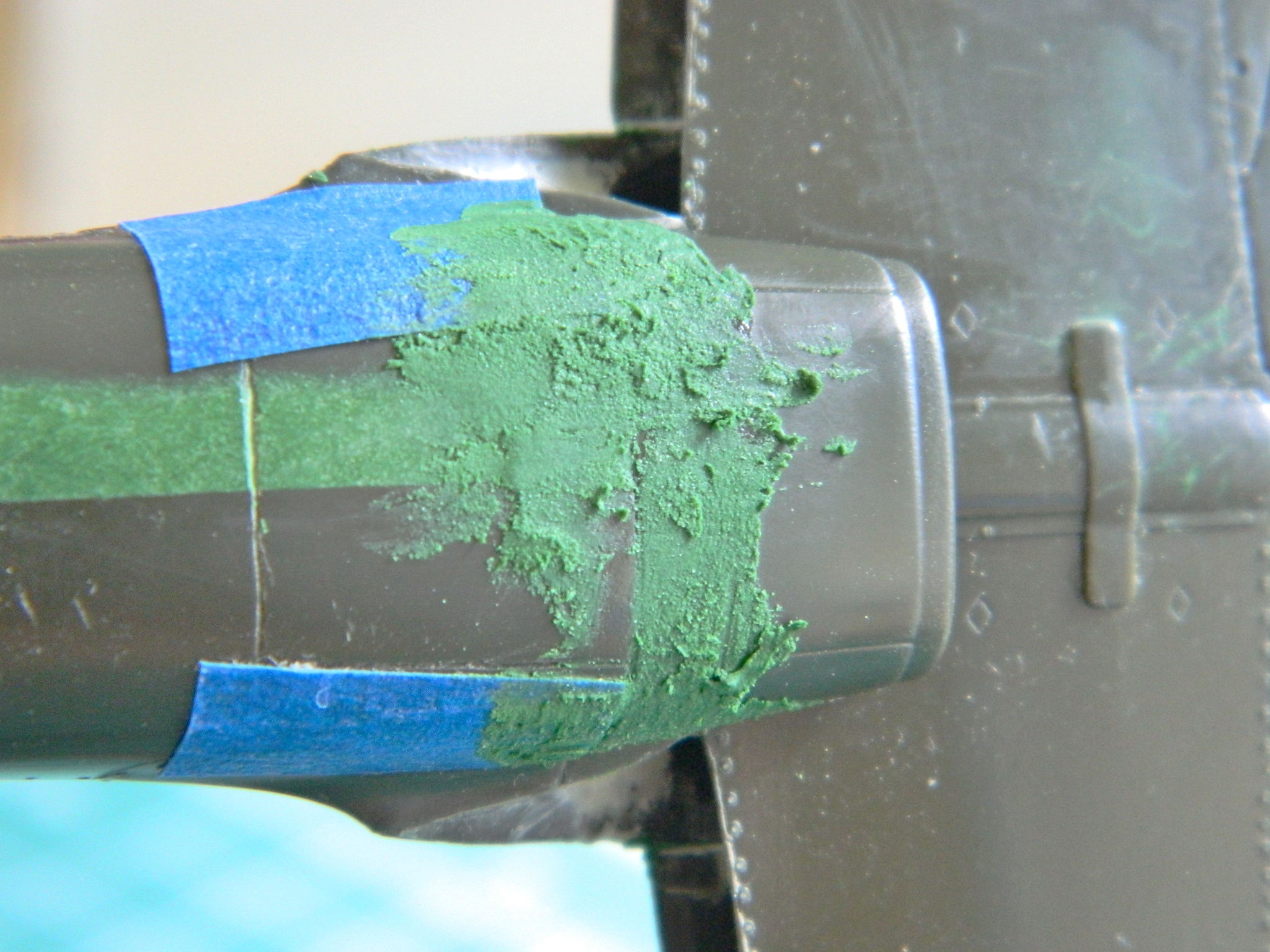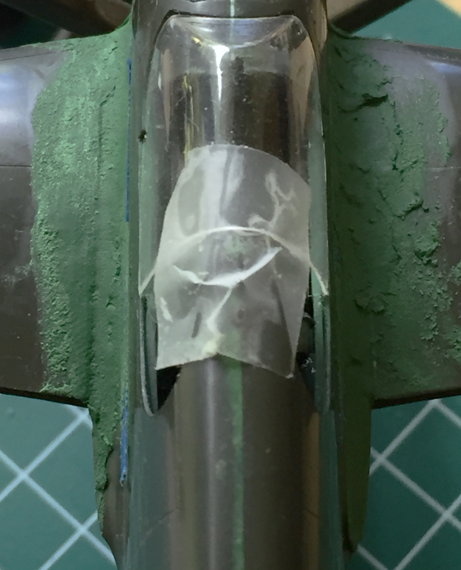 And that requires a lot of sanding. Before wadding the putty on, I covered adjacent areas with tape to keep as much of the surface detail as possible…and then sanded: