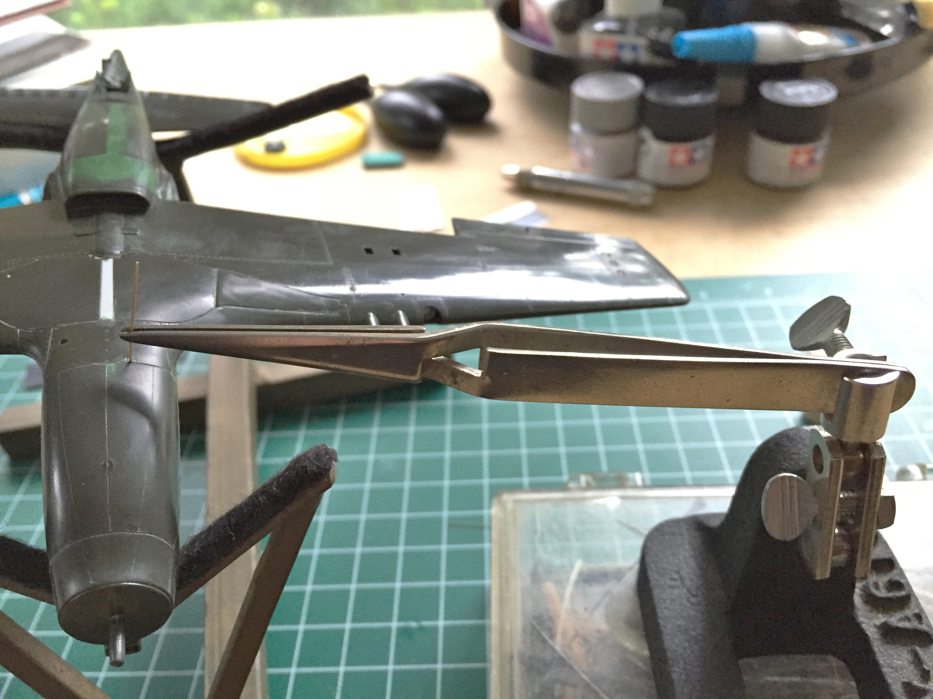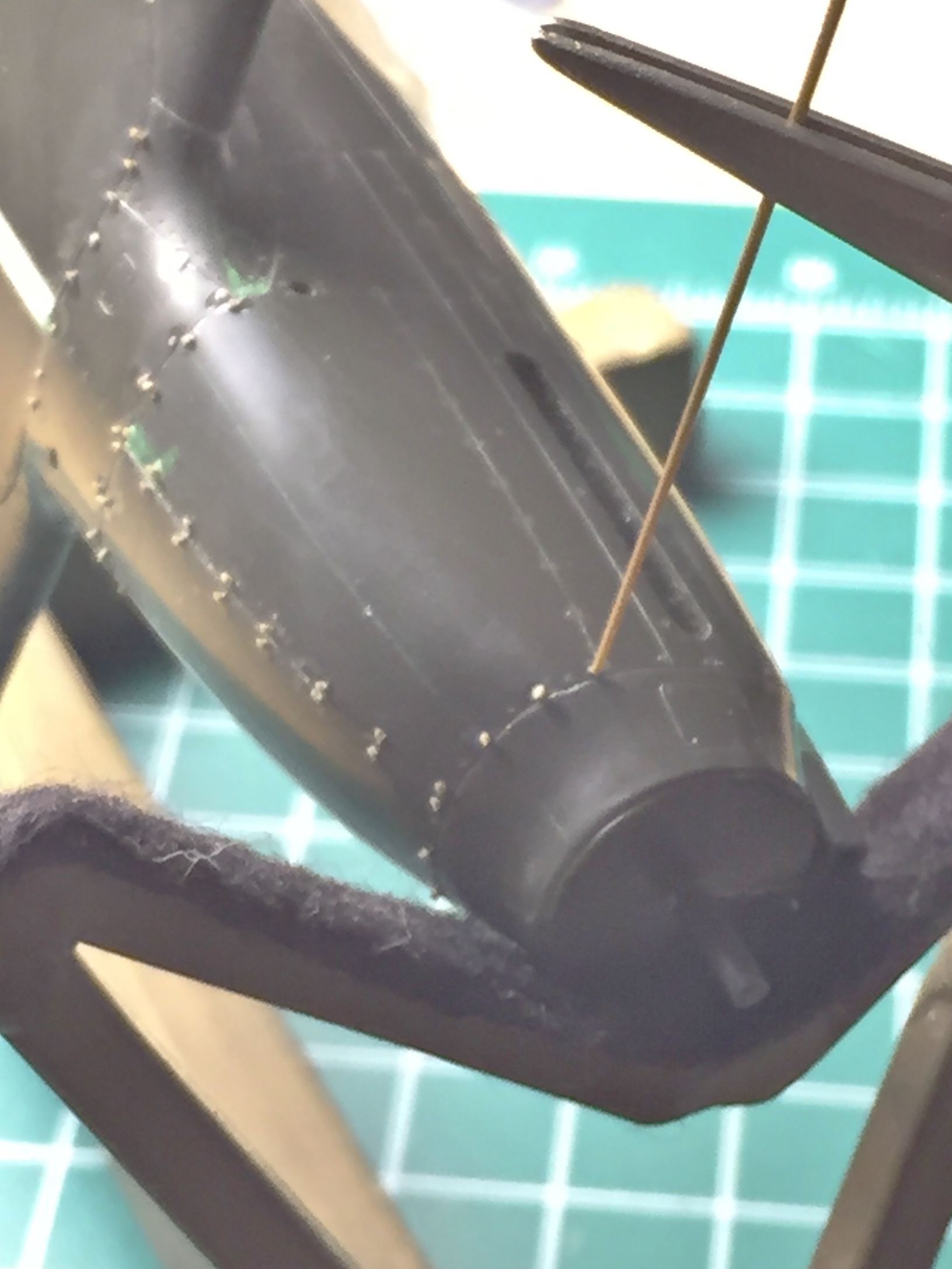 With sanding accomplished, it was time to start putting back the raised details that were casualties of sanding. Below you can see to the right of center where I’ve added a stub of stretched sprue to begin replicating the dzus fasteners used to hold the panels in place and how I did that: