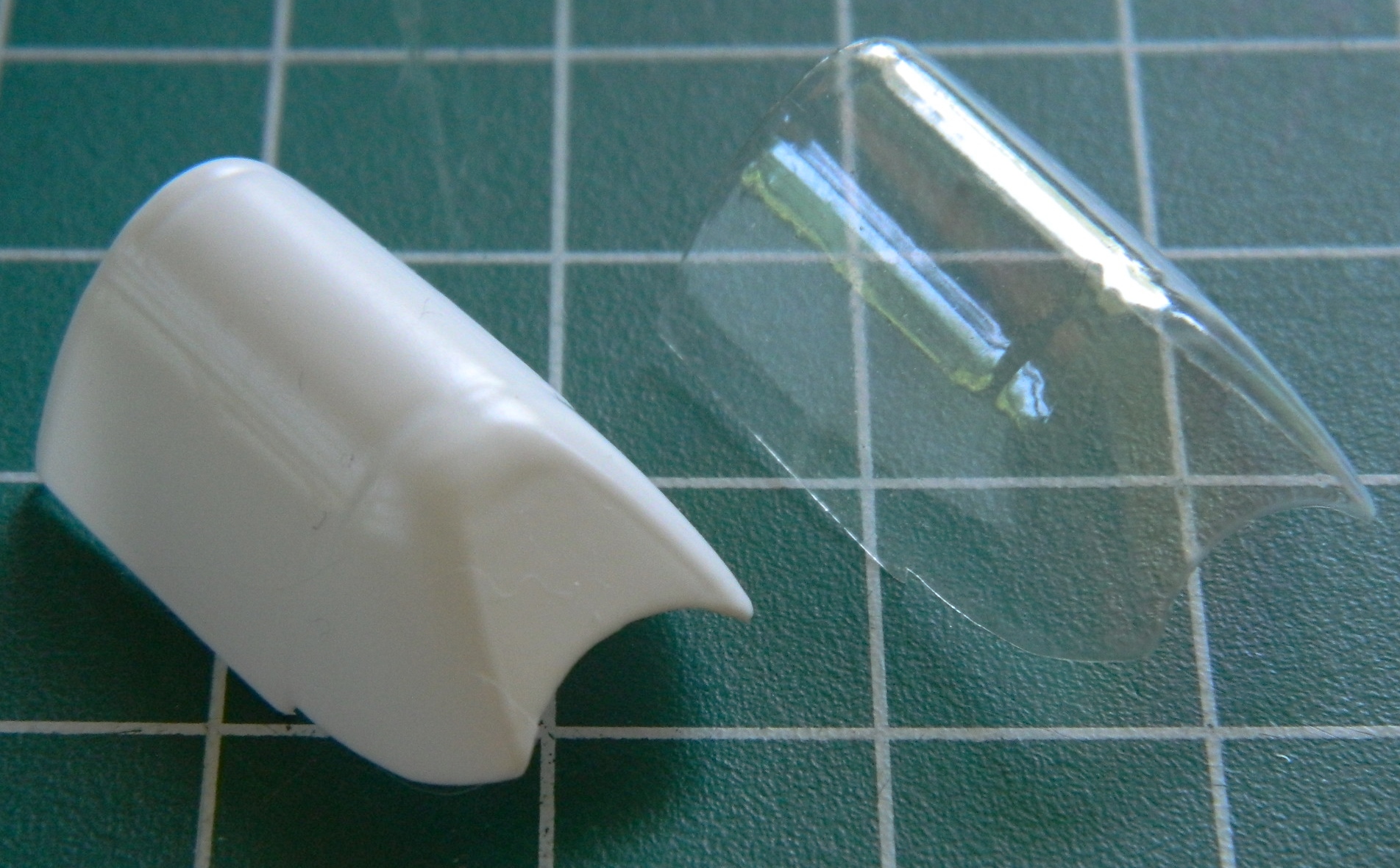 Nice idea, and I probably could have gotten it to work. But in the process of fitting the clear, I realized that the edge of the trimmed part, which had started out at a thickness of .010″ (.254mm) and due to stretching was probably thinner, didn’t offer very much surface area for glue (I haven’t yet figured out which type of glue would work) to offer a secure bond. Squadron Products offers very nice vacuformed canopies for a wide variety of kits and I decided to go that route instead (I think):