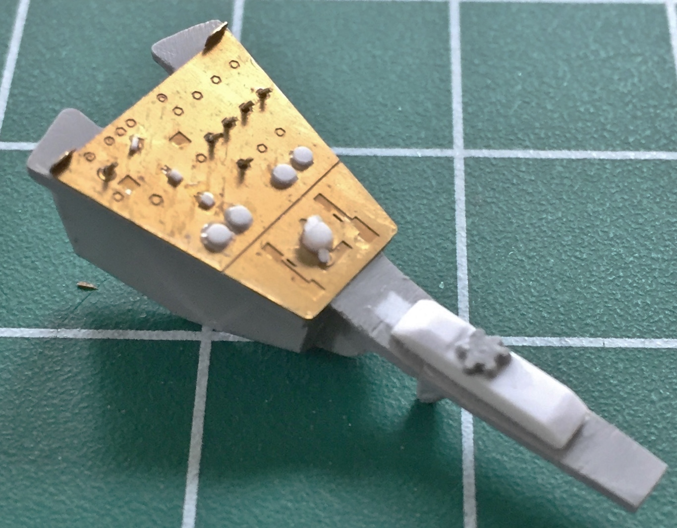A small console that’s mounted on the rear of the cabin only had a pedestal for the upper section of the main body. I don’t know how visible this part will be once everything is assembled, but I do know that once everything is assembled I won’t be able to get in there to fill in empty spaces that turn out to be visible, so I added some flat styrene to the back and then trimmed it to fit: