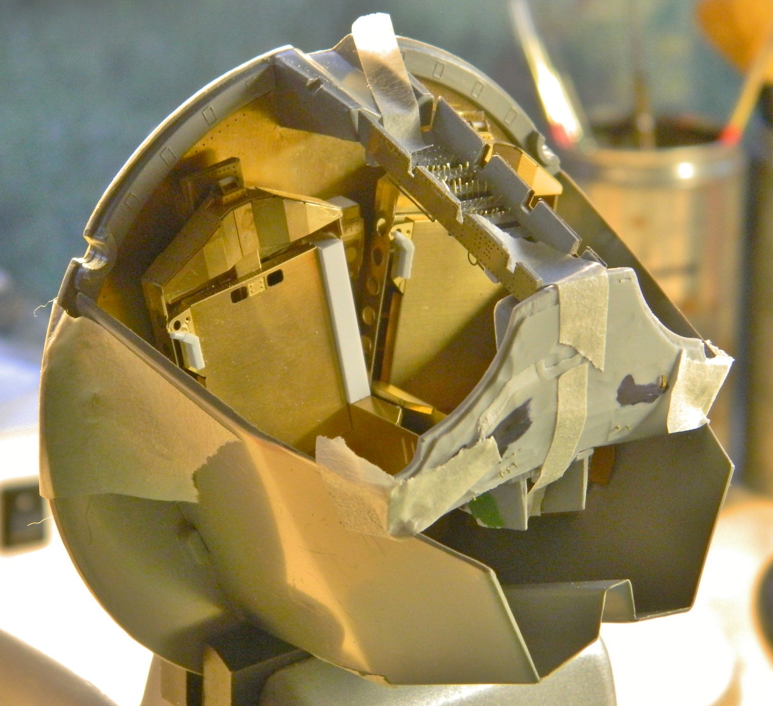 Then I dry-fitted and taped the major components together to see how everything fit. There will be modifications necessary to get all these parts to play nice with each other (if you look at the console at the top of the cabin, you can see where the plastic was cut away from the PE part) (because I forgot to take a picture before I took these):