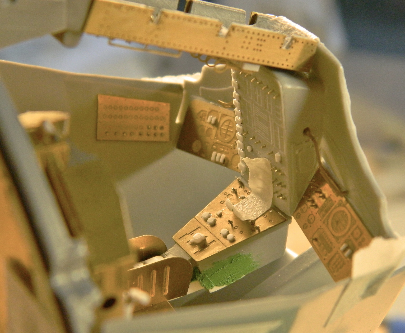 And since I was working with PE parts, I went ahead and did the rest of the panels in the cabin. The center console (lower right) and the overhead switch panel (bottom) both had details molded on that had to be removed. Once that was done, I superglued the PE parts in place: