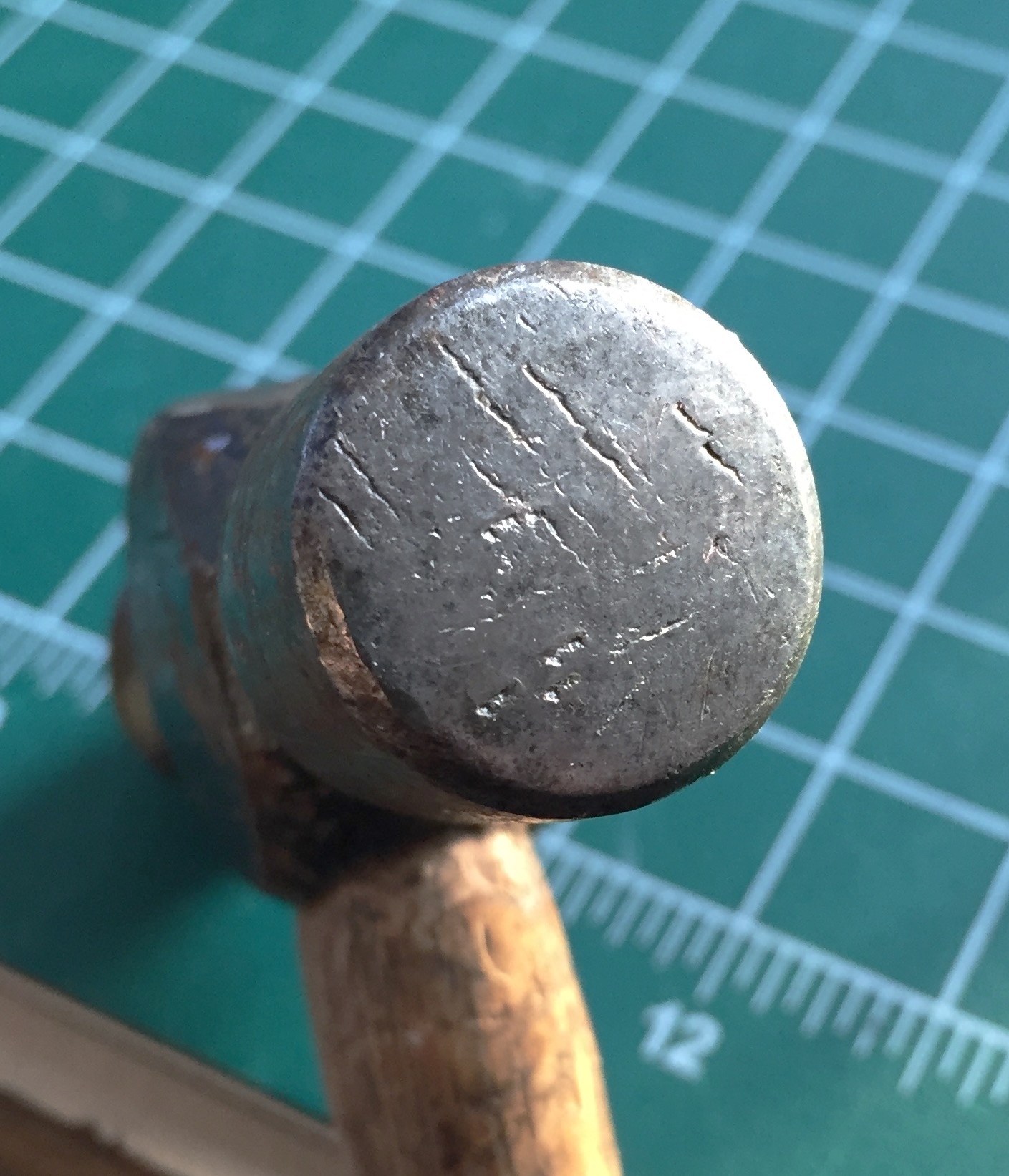 To flatten the shim stock, I use a small ball pein hammer and a small anvil. The ball pein hammer I’m using I inherited. If you look at the face of it you can see where it was used…roughly: