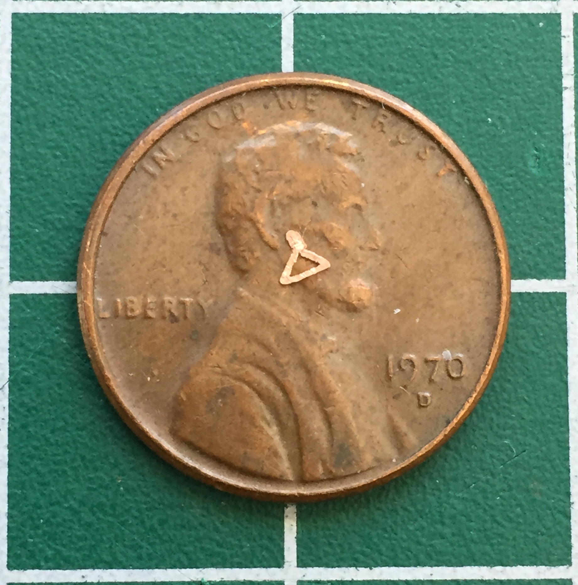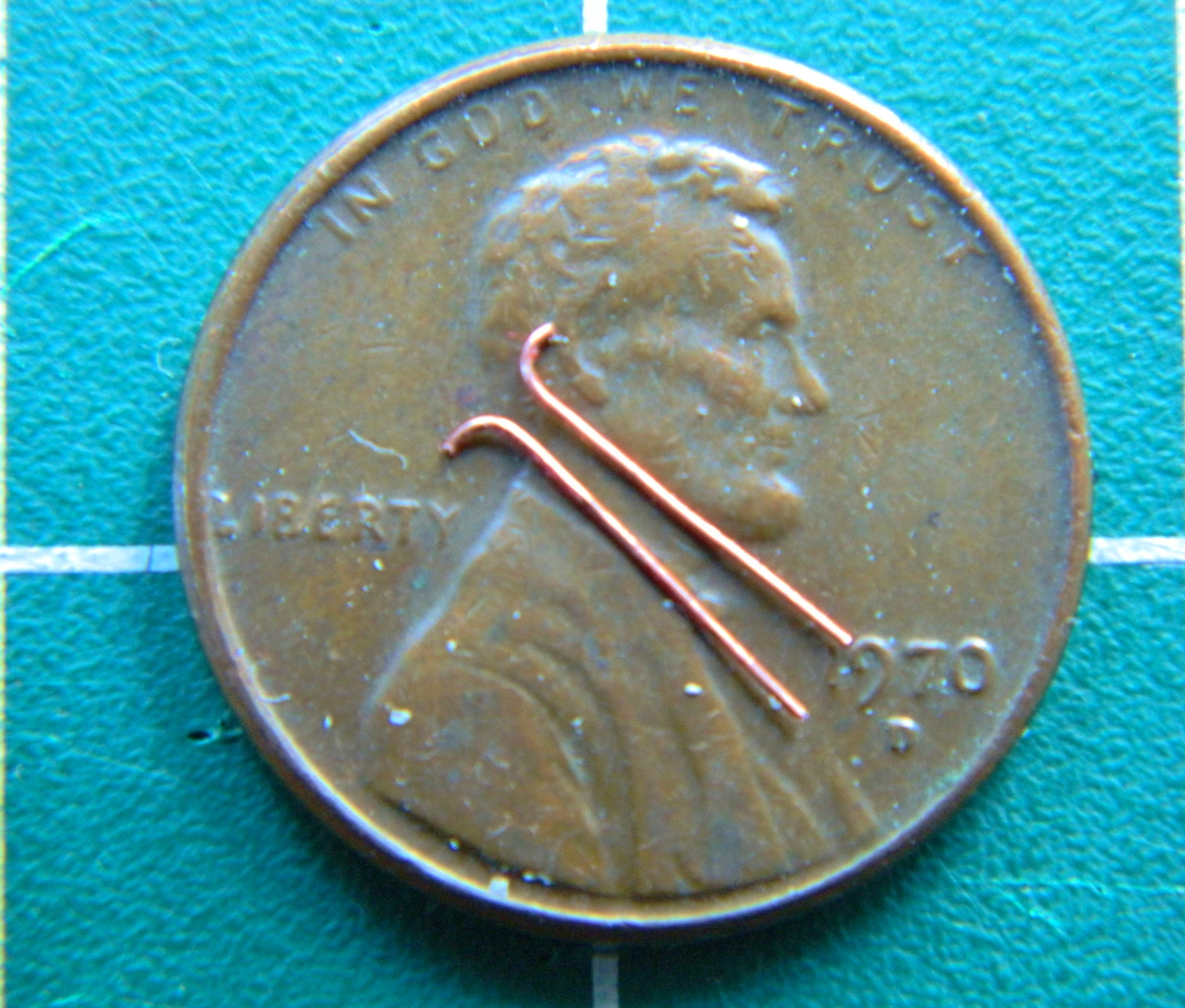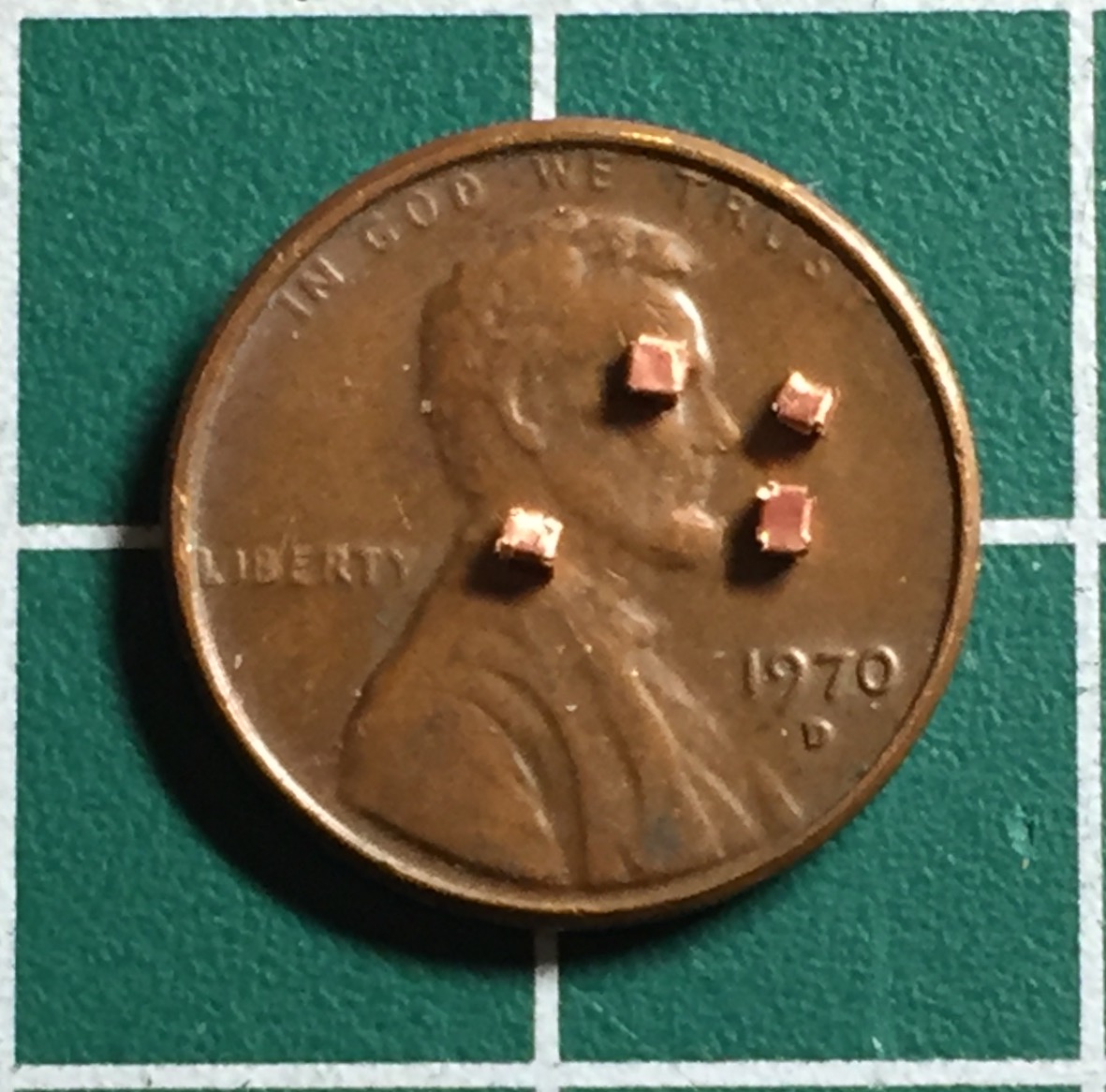 I discovered early on that what would make these things look correct was getting the spacing between the holes consistent. A friend gave me the idea of taping two needles together for consistent spacing. I used the needles to make a small depression in the copper for my bit: