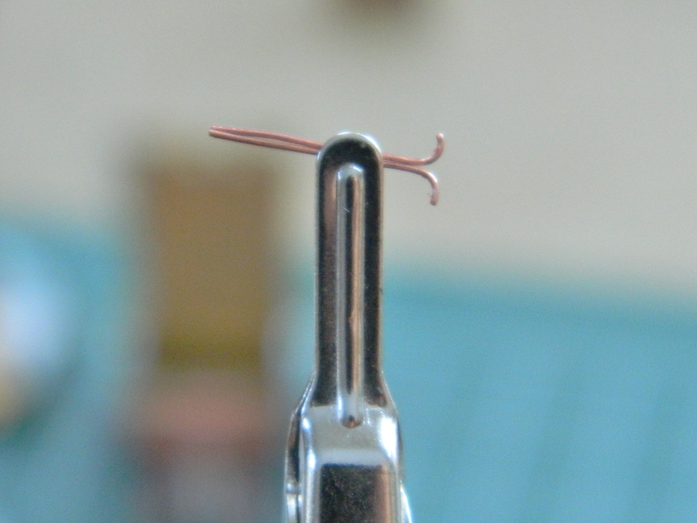 The seats are ejection seats and ejection seats have triggers. I’ve seen two types used with the Gemini seats. The first is a more or less standard loop (yellow and black striped) and the other is a T-handle. I decided to go with the T-handle trigger because I was not looking to have to stripe a part that small (yeah…I’m lazy). For size I used 26 gauge wire to make the handles. Step one was cutting the wire and curving one end: