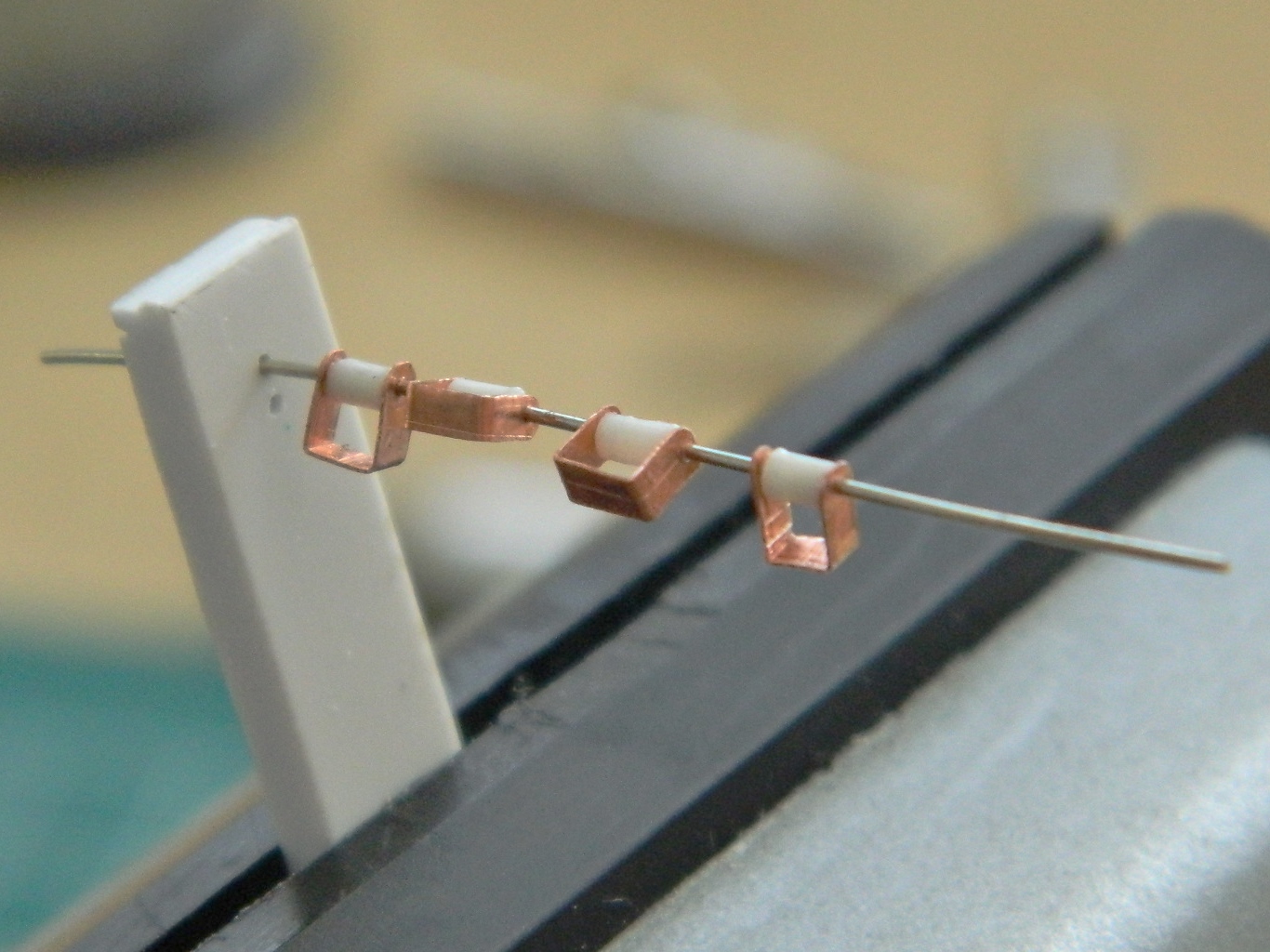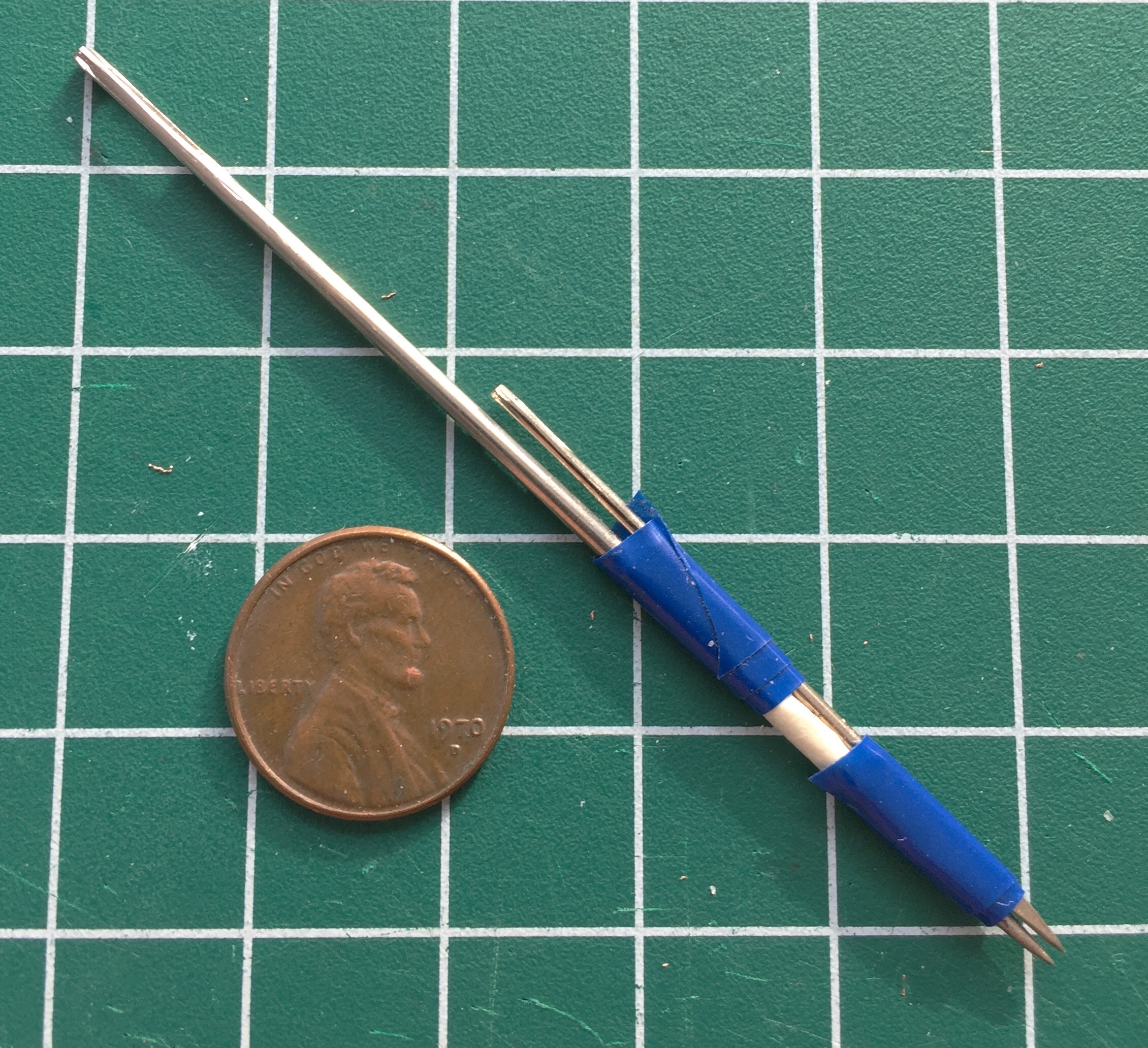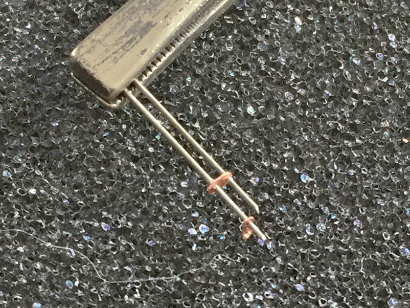 Not only was I not especially pleased with the outcome (though I was quite pleased that I could solder something this small), I realized that I was over-complicating things. Again. For this application, superglue would work just fine…and it did. I used a piece of scrap plastic, drilled two .018″ (.457mm) holes in it, and used that to hold the wires while I slid the plates onto them and then glued them. Worked perfectly: