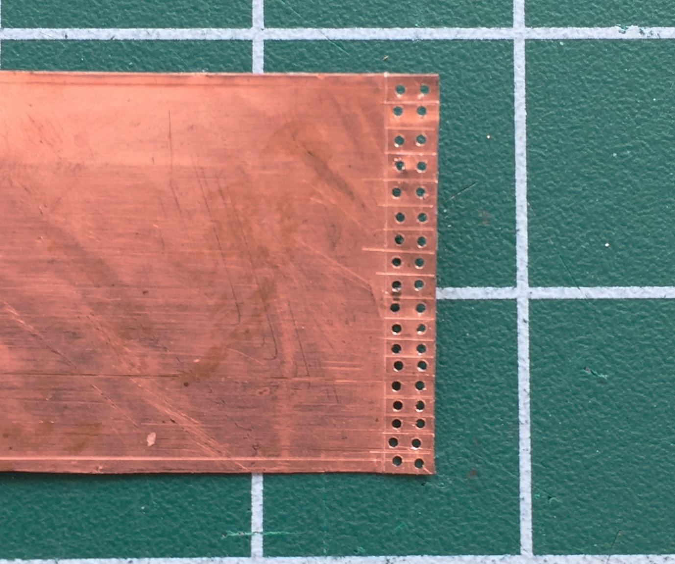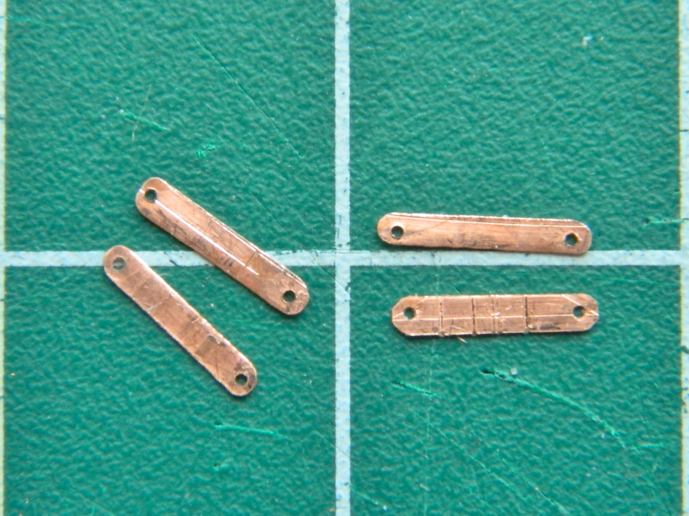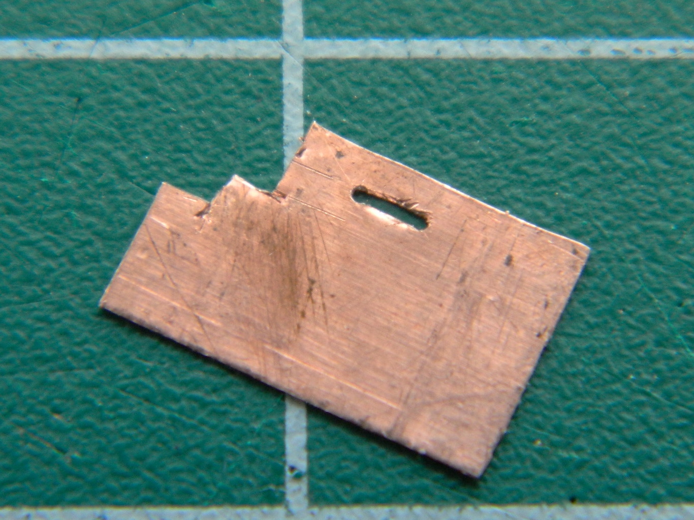 With the strip free of the sheet, each plate was cut free. I used a sharp chisel blade instead of scissors because I could control the precision of the cut better. I found that rocking the edge of the blade across the surface of the copper gave me an accurate cut with the least amount of deformation of the copper (and a well-fed gnat landing on .005″ (.127mm) copper deforms it…after every action on the copper, I had to flatten the part out again):