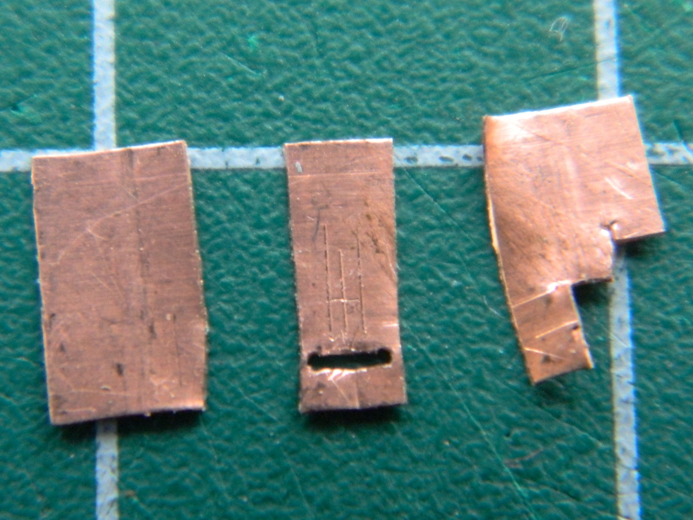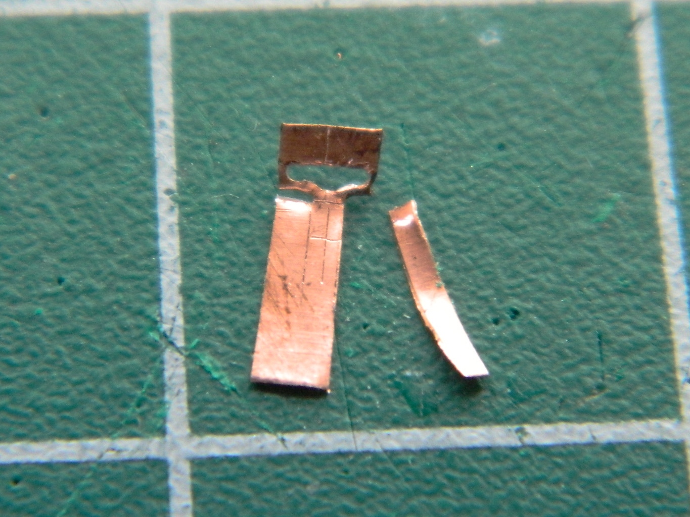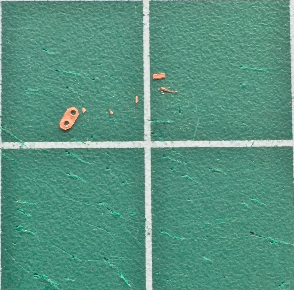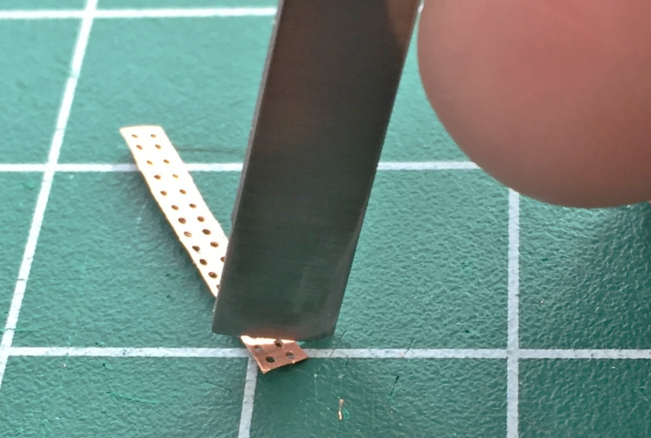 I determined (using the Mk.I Eyecrometer) how wide these plates needed to be and made a strip of them using a drill bit of .018″ (.457mm) diameter, then cut the strip free using a very high-tech tool. Scissors: