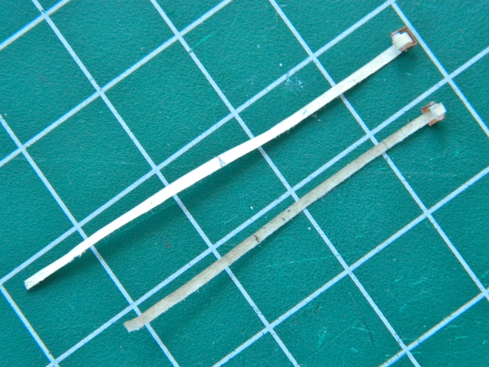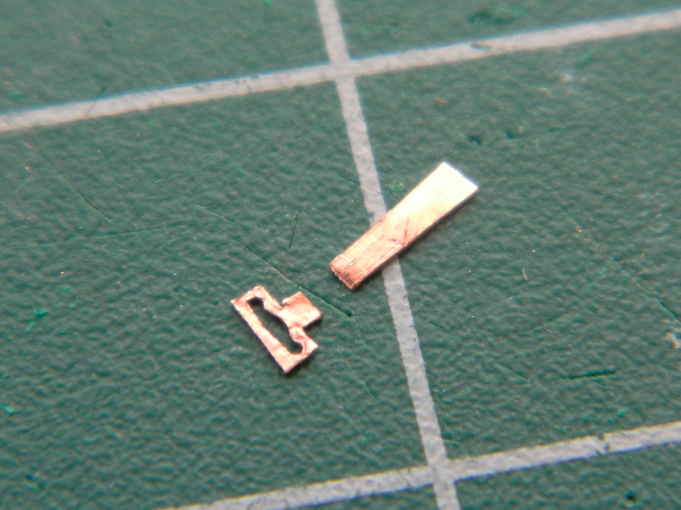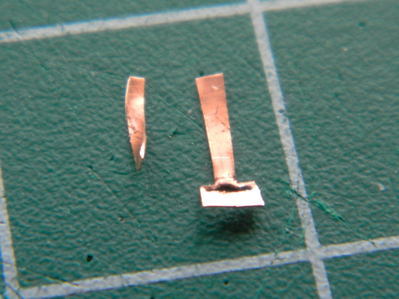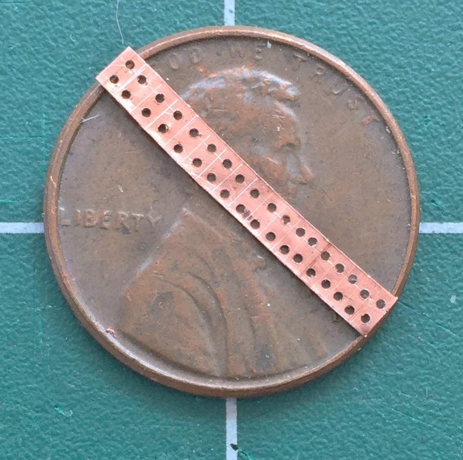 I determined (using the Mk.I Eyecrometer) how wide these plates needed to be and made a strip of them using a drill bit of .018″ (.457mm) diameter, then cut the strip free using a very high-tech tool. Scissors: