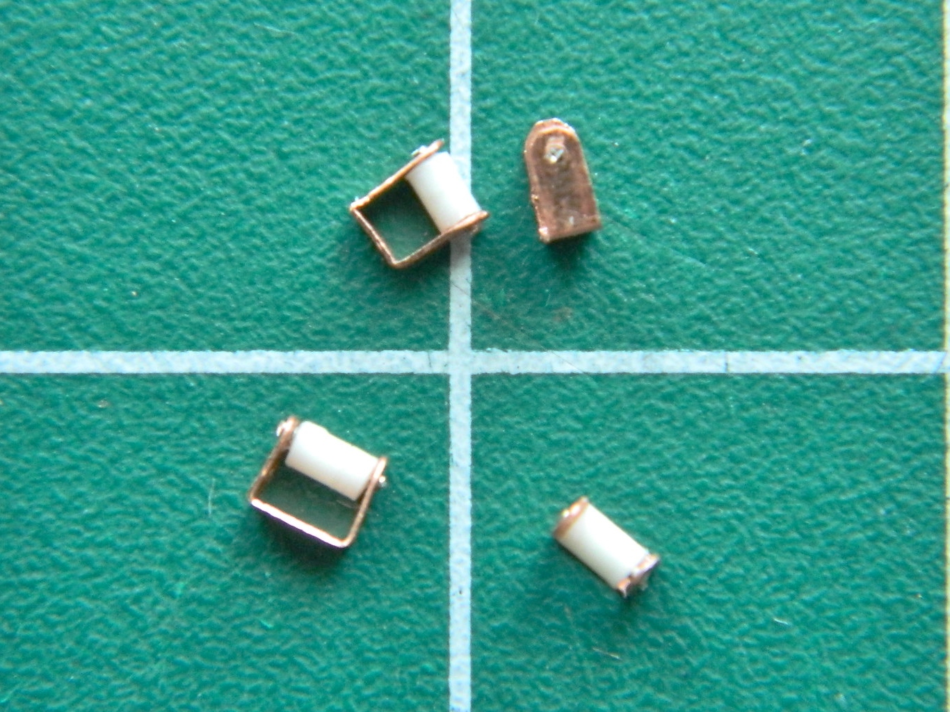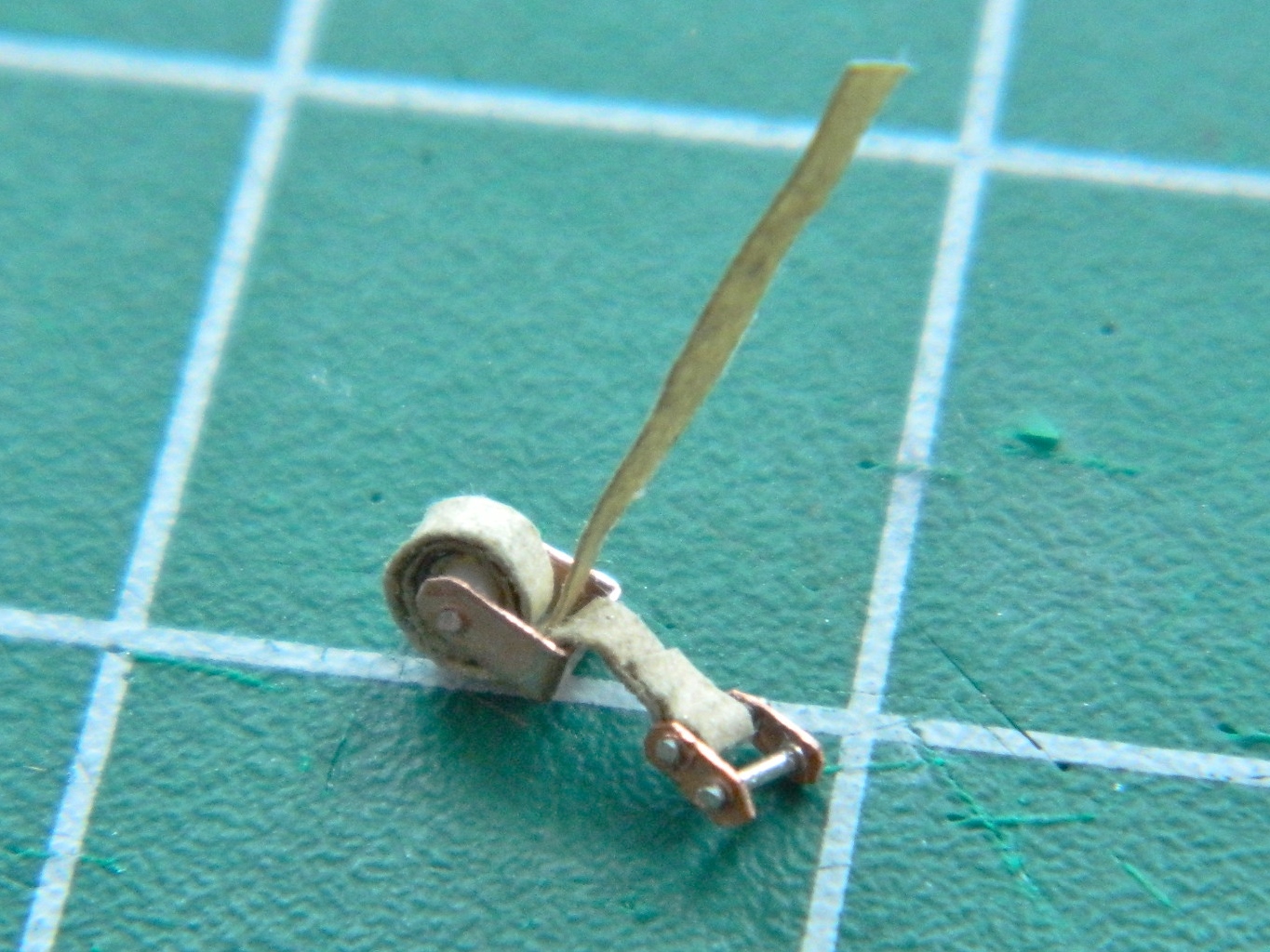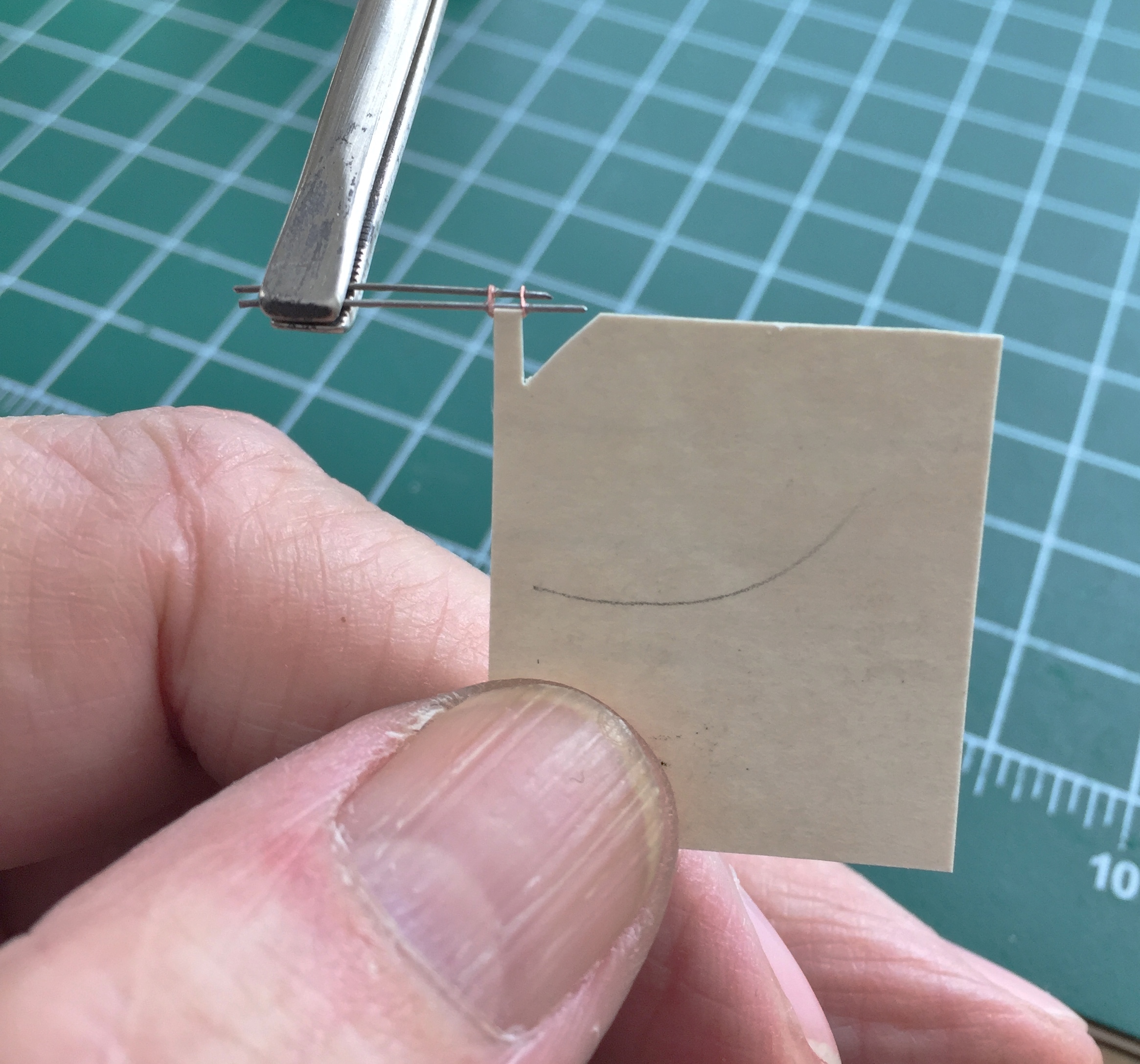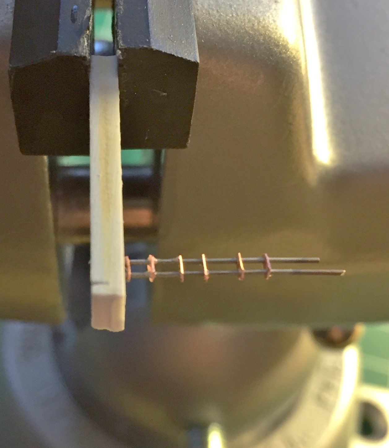 I determined (using the Mk.I Eyecrometer) how wide these plates needed to be and made a strip of them using a drill bit of .018″ (.457mm) diameter, then cut the strip free using a very high-tech tool. Scissors: