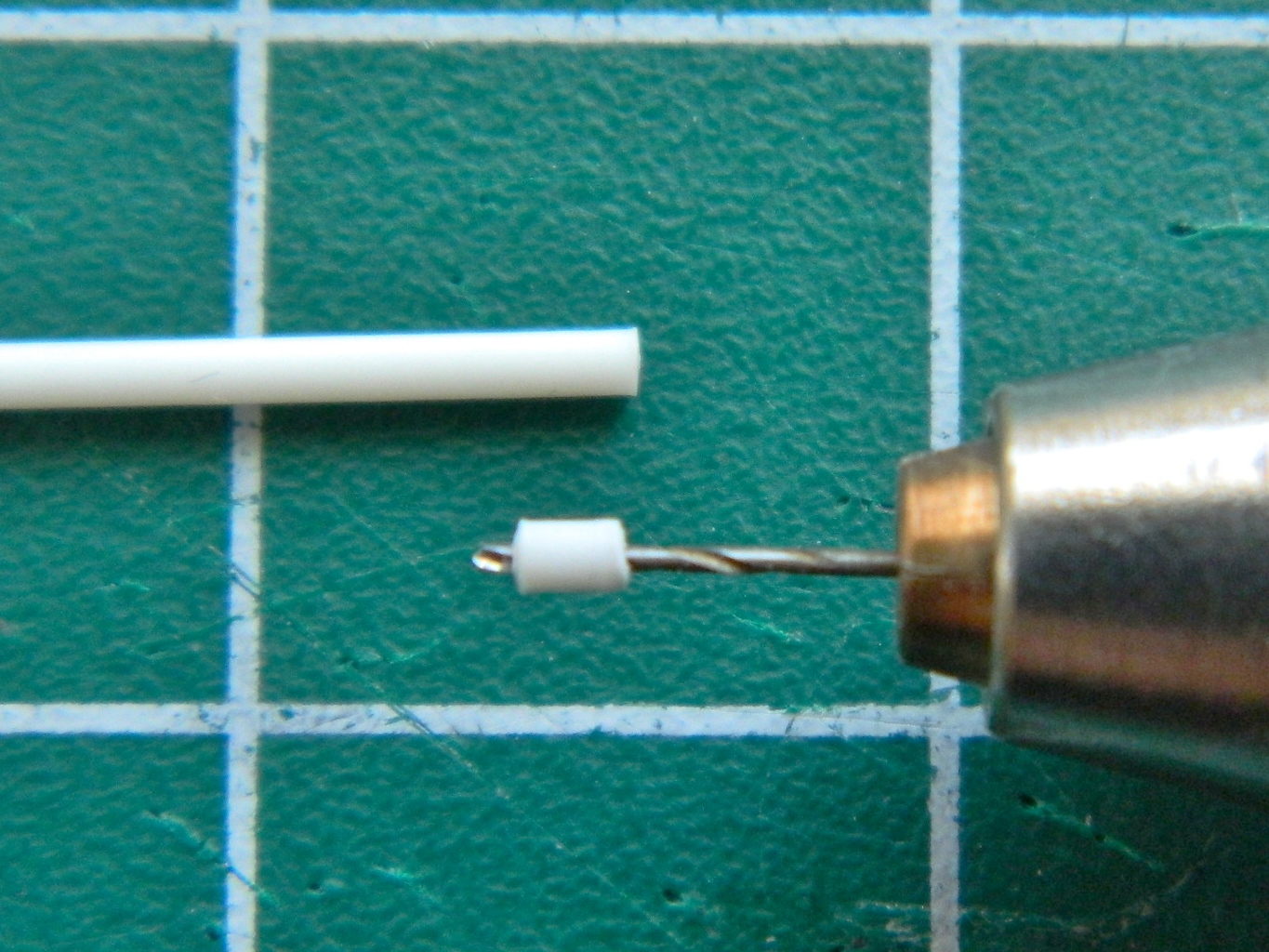 I didn’t want to have to wrap a small diameter wire with enough paper to replicate the rolled up strap, so I decided to bulk that out using plastic rod. That meant I had to use .047″ (1.19mm) diameter rod and center-drill it (again using the .018″ (.457mm) bit). A bit fiddly but it did work: