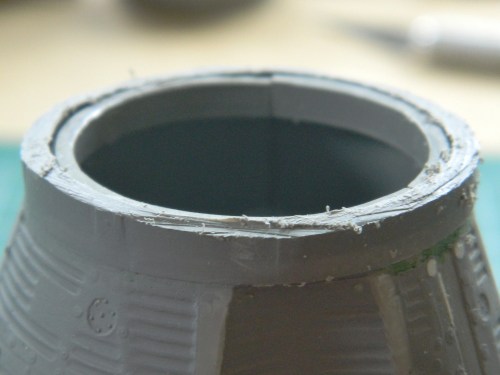Seeing the outer part of the capsule sitting there on the workbench with the nose attached incorrectly bothered me so it was time to fix it. Sometimes in order to create, one must first engage in destruction. Step one, saw off most of the old nose: