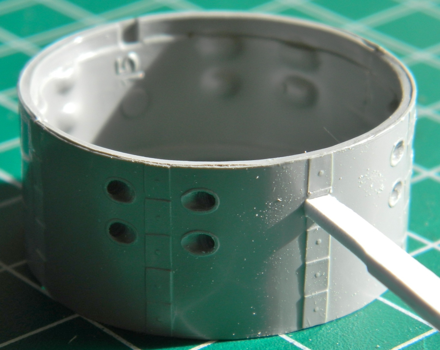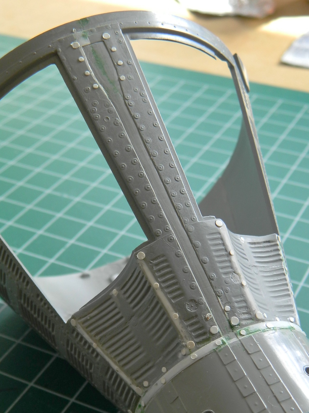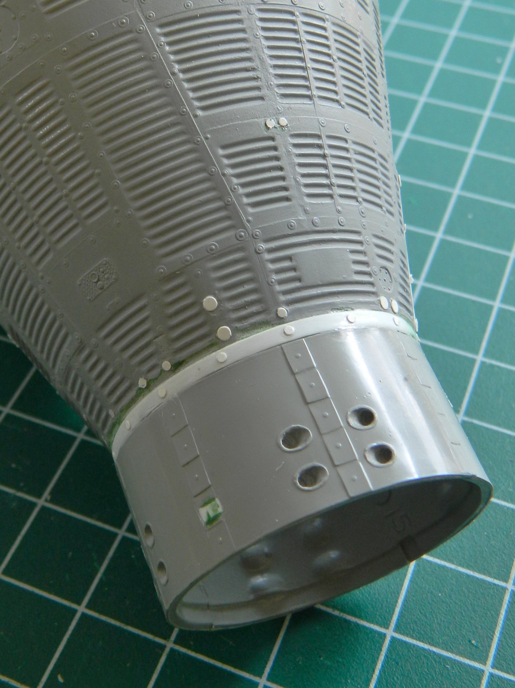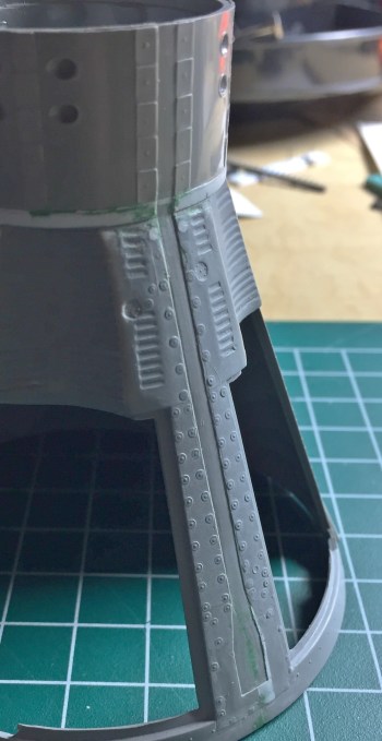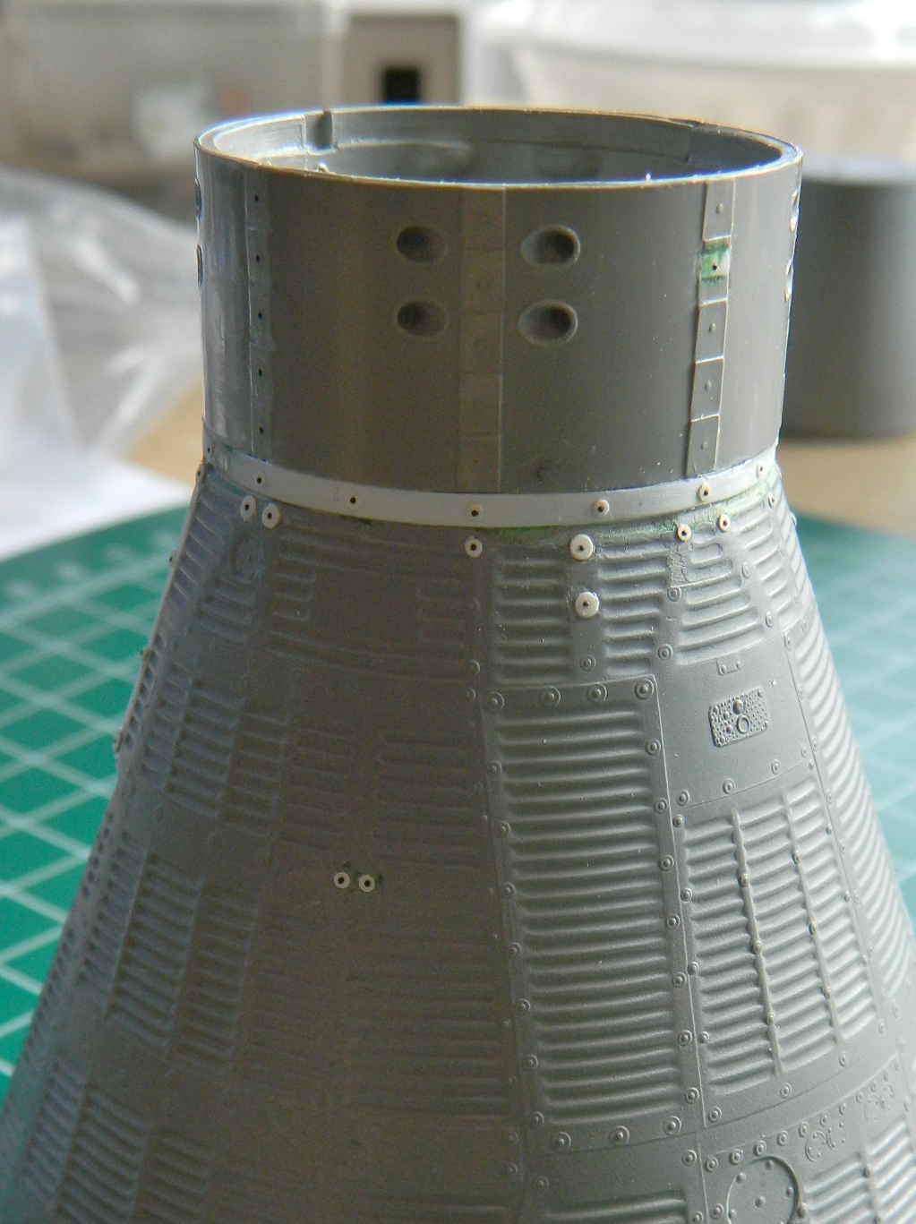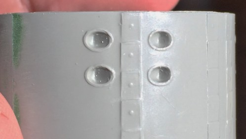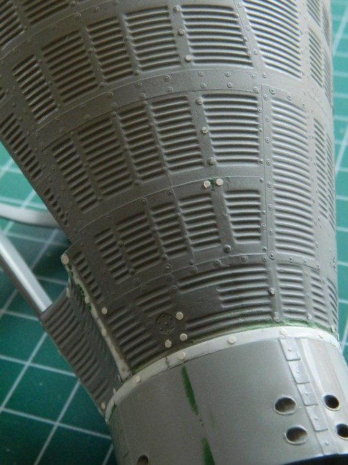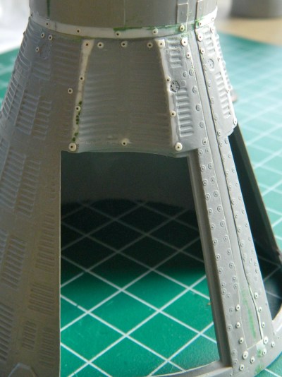 Because of seams and surface reworking, some of the details were lost. From what I can tell from references, the surface skin panels of the Gemini capsules were attached to the framework with screws and these screws all had large washers. The washers I replicated by punching small discs from .005″ (.127mm) sheet styrene: