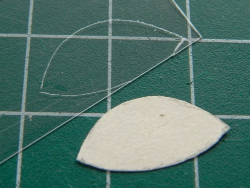 My attention turned to the hatches. The windows in the hatches are double-paned. I started to address this when I added all the nuts and bolts to the inner plate of the window that holds the inner pane in place. I briefly considered cutting clear styrene to fit the opening in the hatches and realized that doing so would be damned tedious and gluing them in place would present its own set of problems. The work-around for that was to add a section of .010″ (.254mm) clear styrene in front of the opening (like, who’s going to notice the front of that section was moved out ten thousandths of an inch (or .254mm)?), then mask off the window, and paint it when I do the rest of the exterior. Step one to that process was a template: