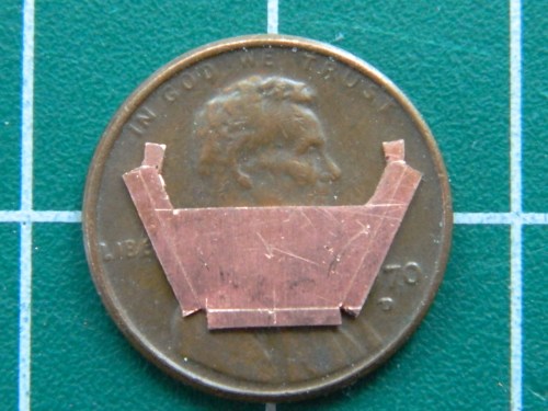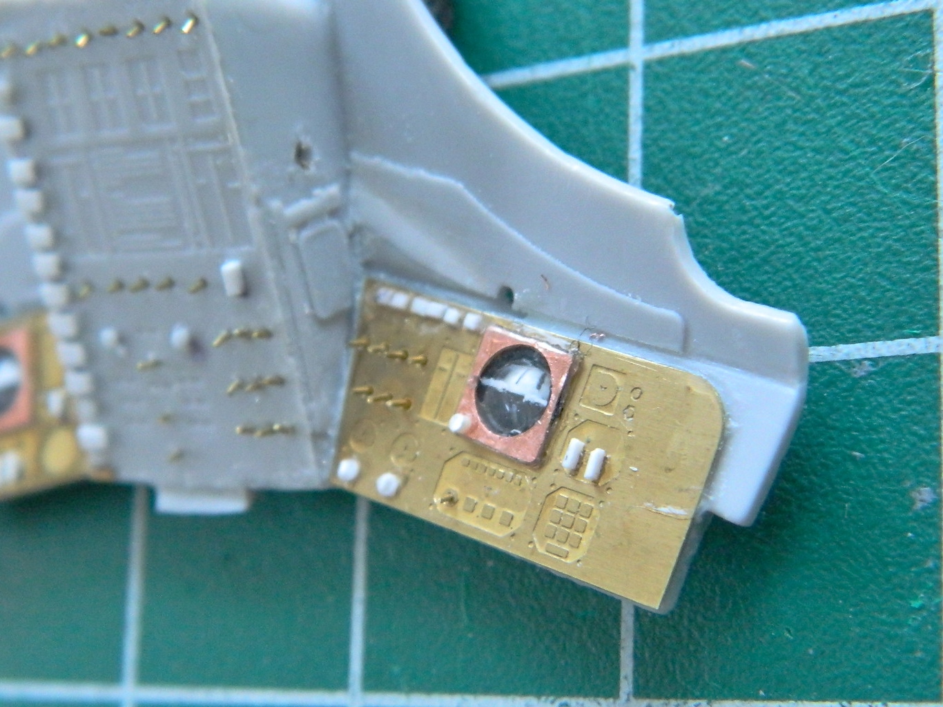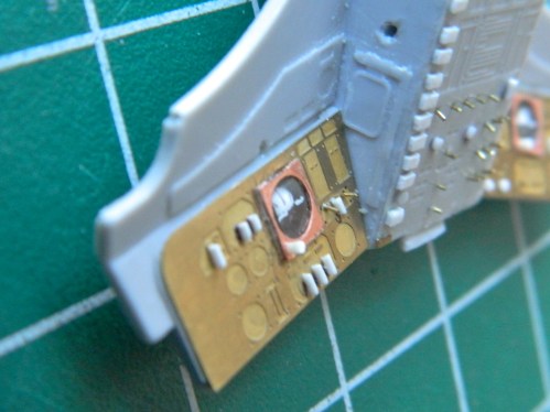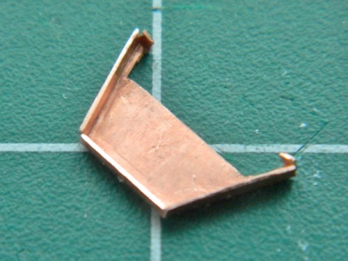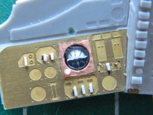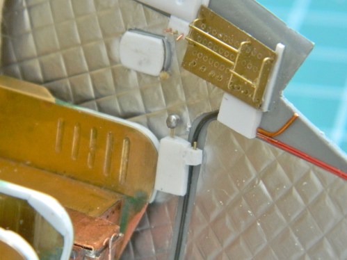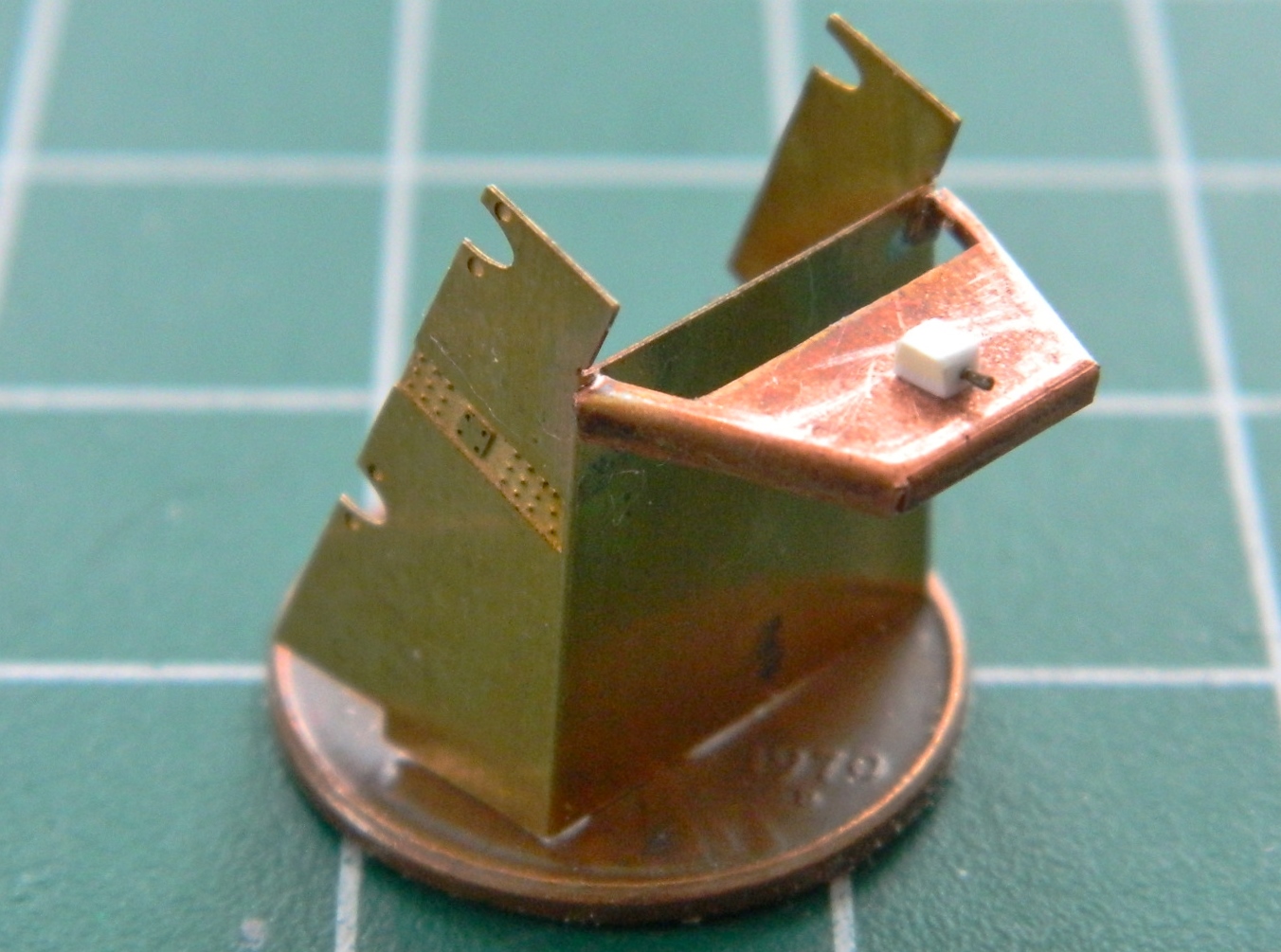 There is an equipment mount on the ceiling console of the cabin, so the mount and the boxes that mount there had to be made. I made the mount out of .010″ (.254mm) copper shim-stock, folded it, and then soldered it to the PE part (as well as adding a pull-switch to it):
