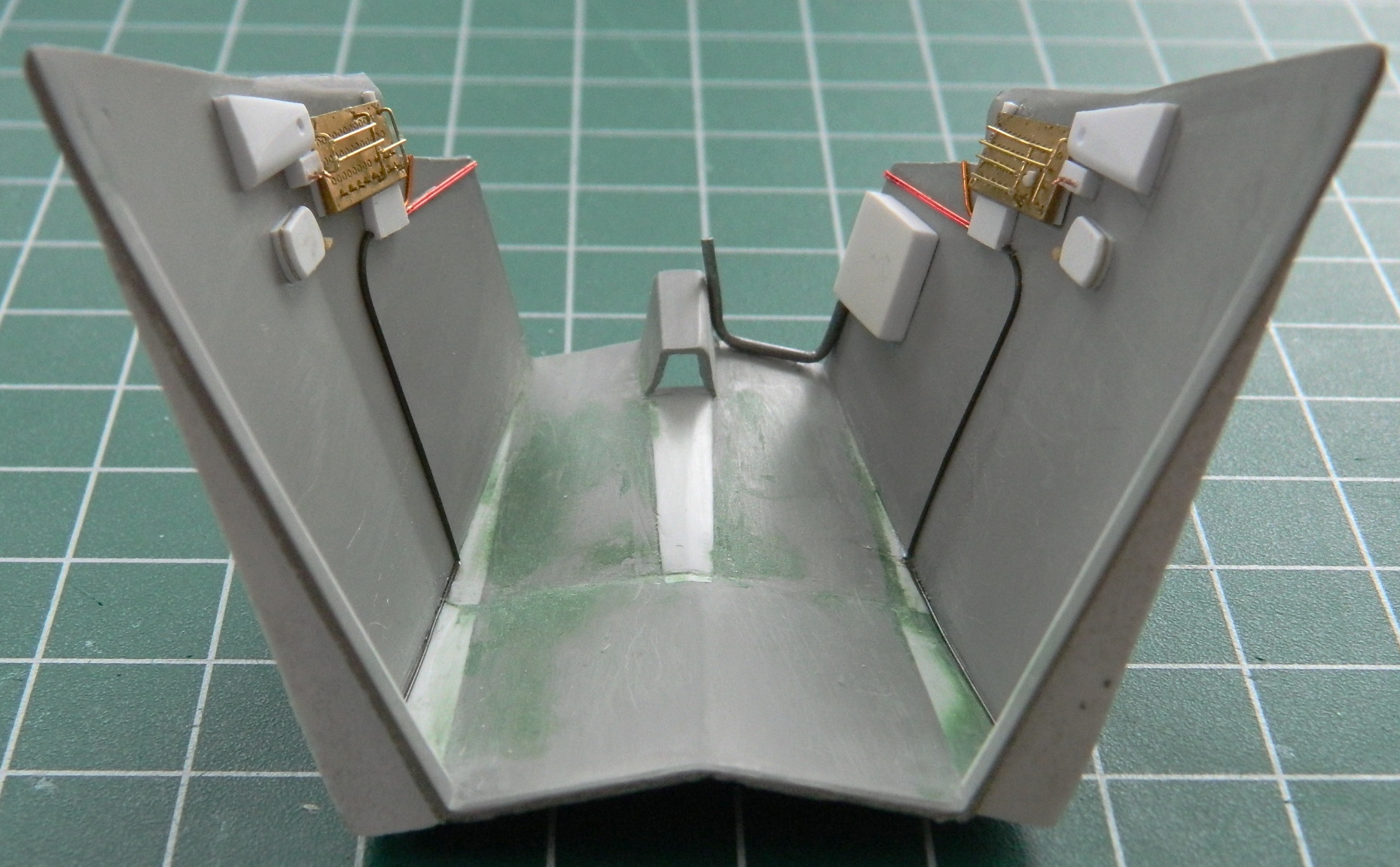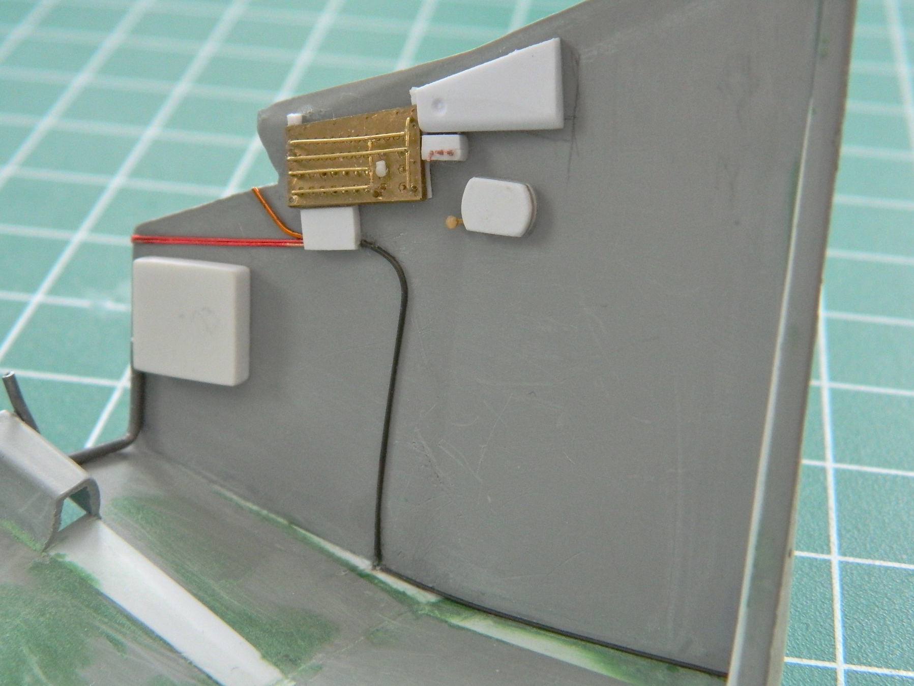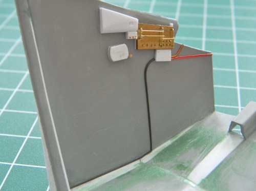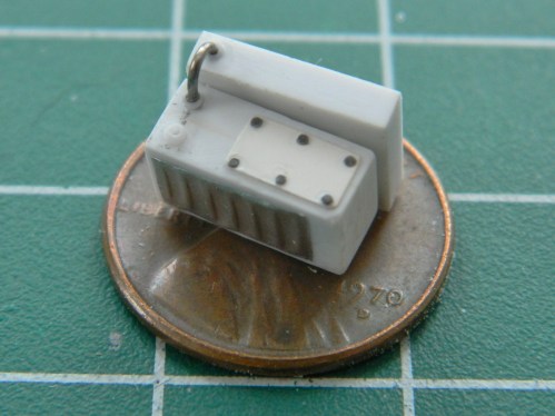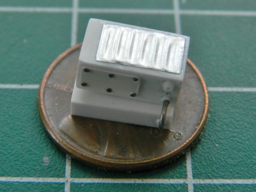 Then I made the boxes that get mounted to that bracket out of scrap styrene, added details, and glued them into position: