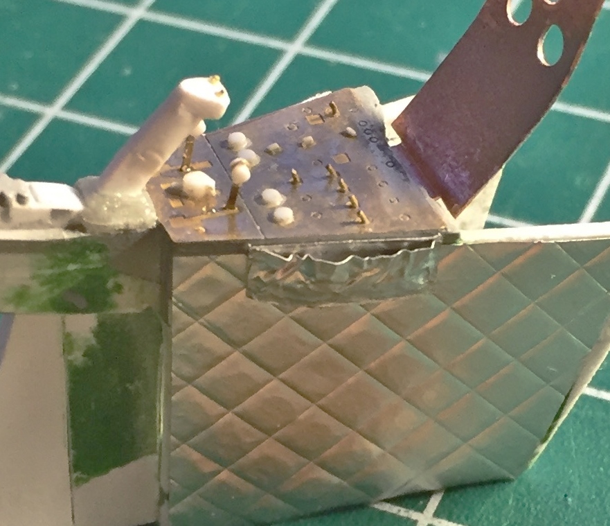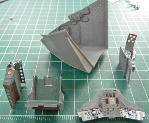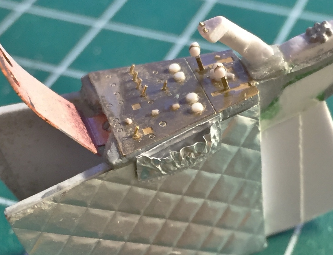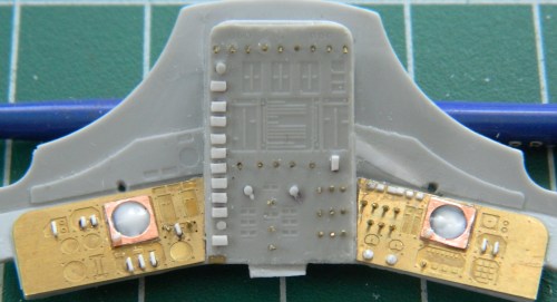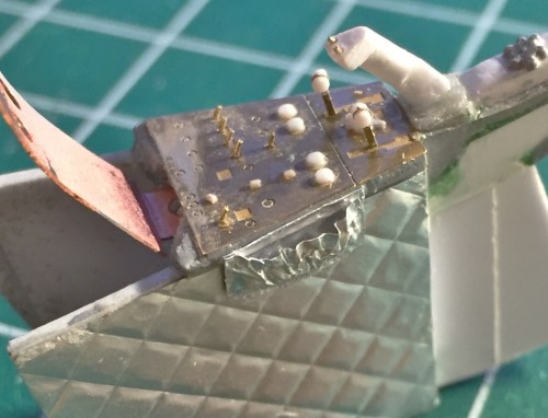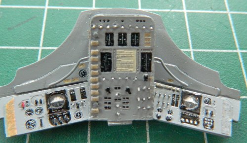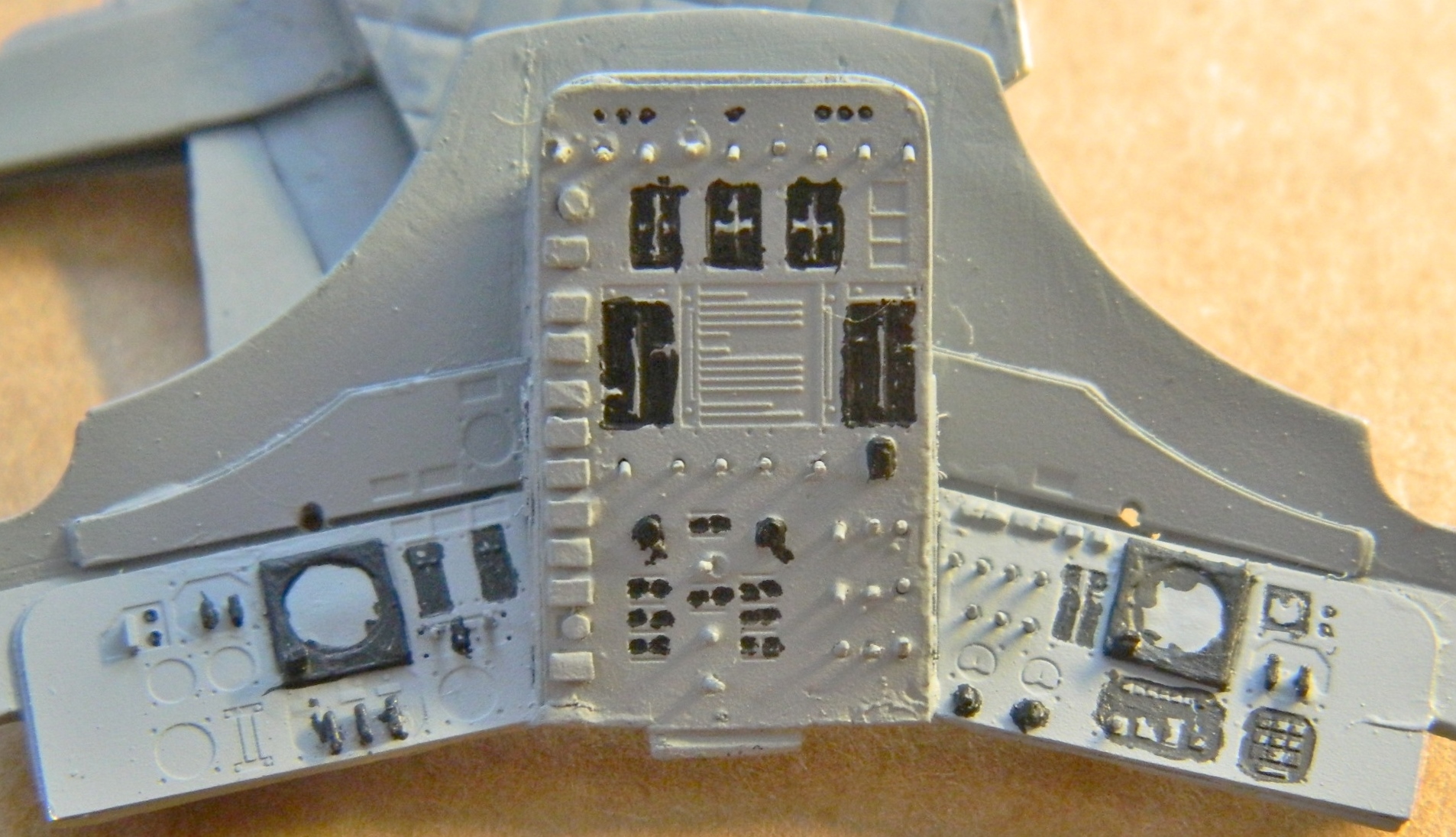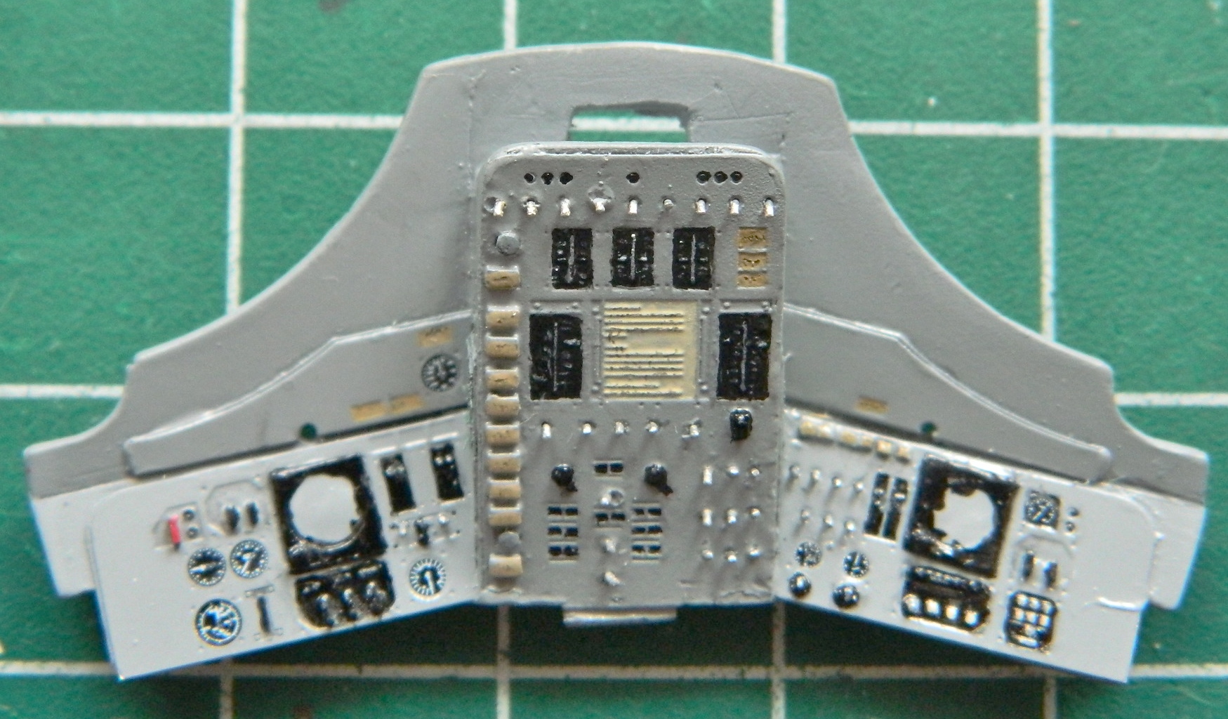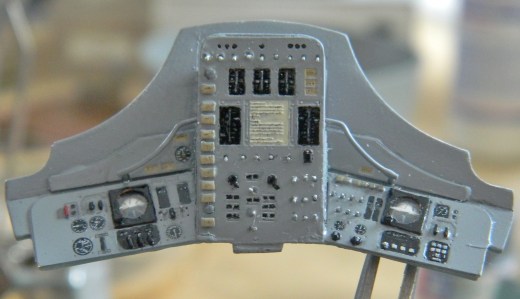 Once the decals dried thoroughly, I put a drop of clear gloss paint over the faces to replicate glass. Then I peeled the formerly-liquid mask of the artificial horizons, added the grab bars to the sides of the central panel, and ended up with this:
