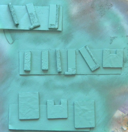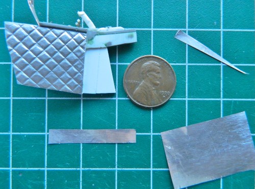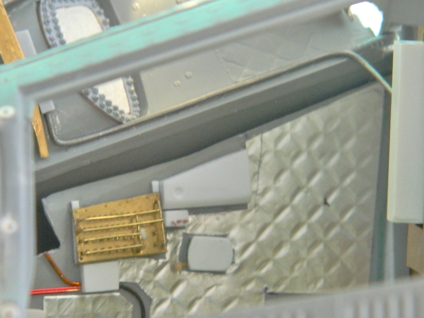 Since a person can’t just “put something down” in micro-gravity, there has to be something to keep things in place. That something is Velcro and it’s pretty much all over the inside of the cabin. I used the same paper towel material I used for the sunshades for Velcro (the superglued pantyhose was out-of-scale). Below, the bare paper towel is on the left of the panel, the painted paper towel on the right (and I’m not satisfied with using the light gray for the Velcro…it looks more tan to me so I’ll be fixing that before assembly):