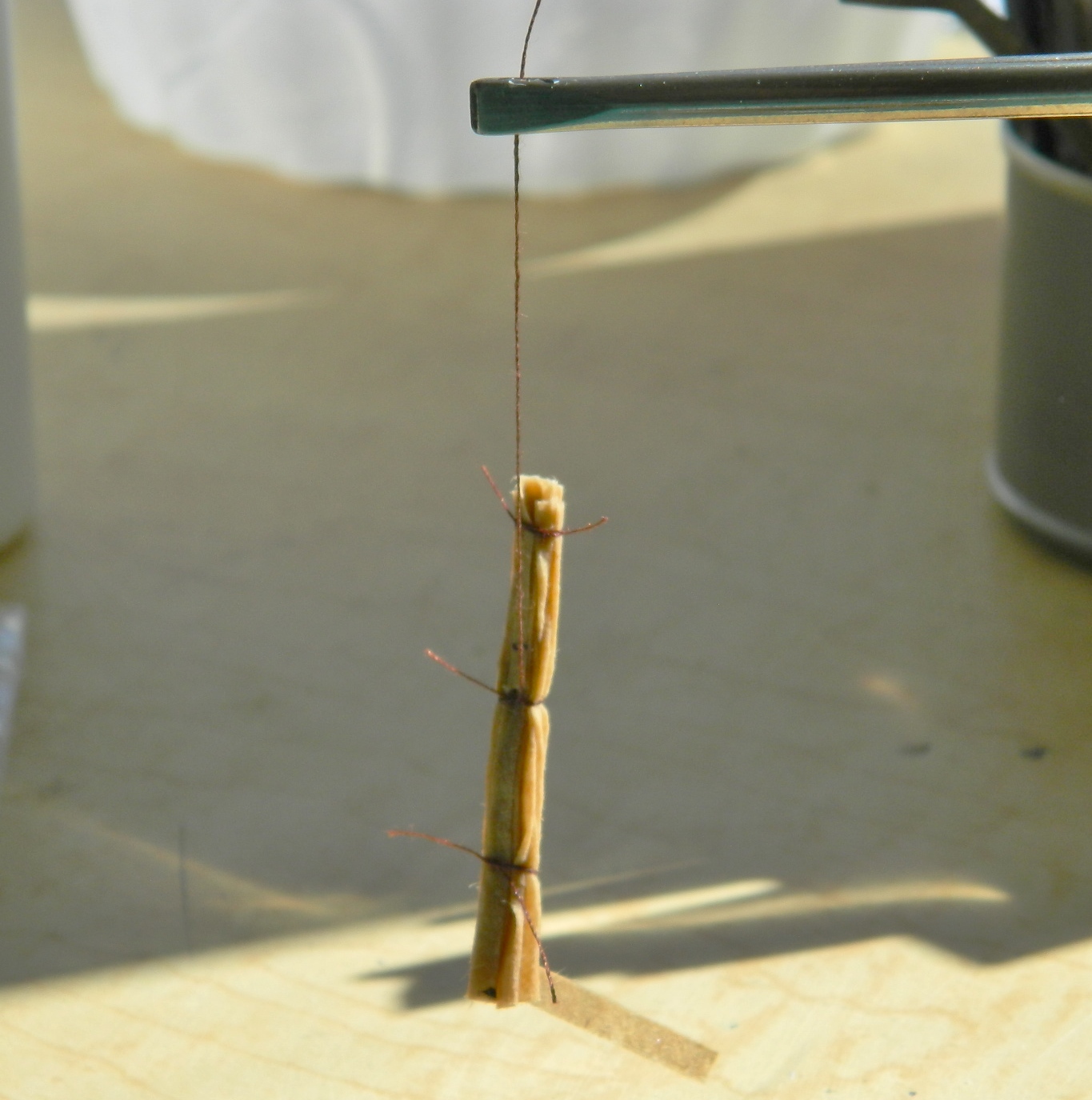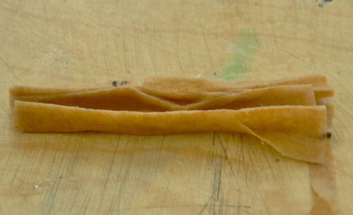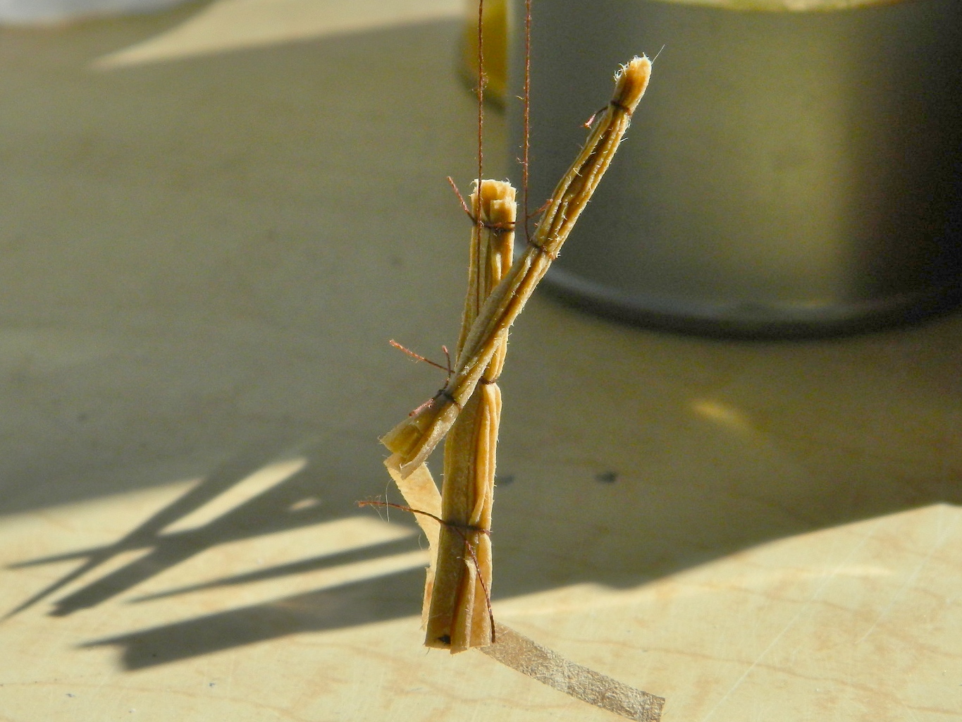The paper towel is cut to its rough shape then dipped in diluted white glue, folded, tied, and set aside to dry: