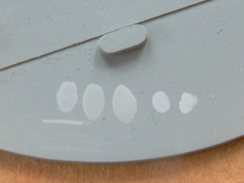 To paint, some things need to be masked. Masking can be trying but one simply cannot do a decent paint job without it. (An adequate, or even somewhat poor, build can be saved by a sterling paint job; a great build can be ruined by a bad paint job.) I tend to have difficulties masking small round areas. An easy fix for that is to use liquid masking (various manufacturers make it). I apply it with a toothpick and move the masking agent to the edges of what I want masked. A really great feature of liquid masking is that there’s no bleed-through under the edge of the mask. The white over the artificial horizons is the liquid mask (which turns clear when dry):